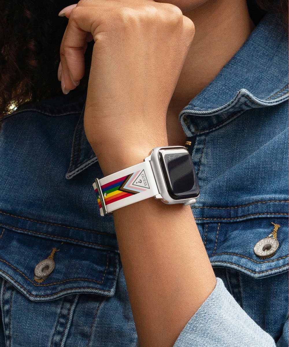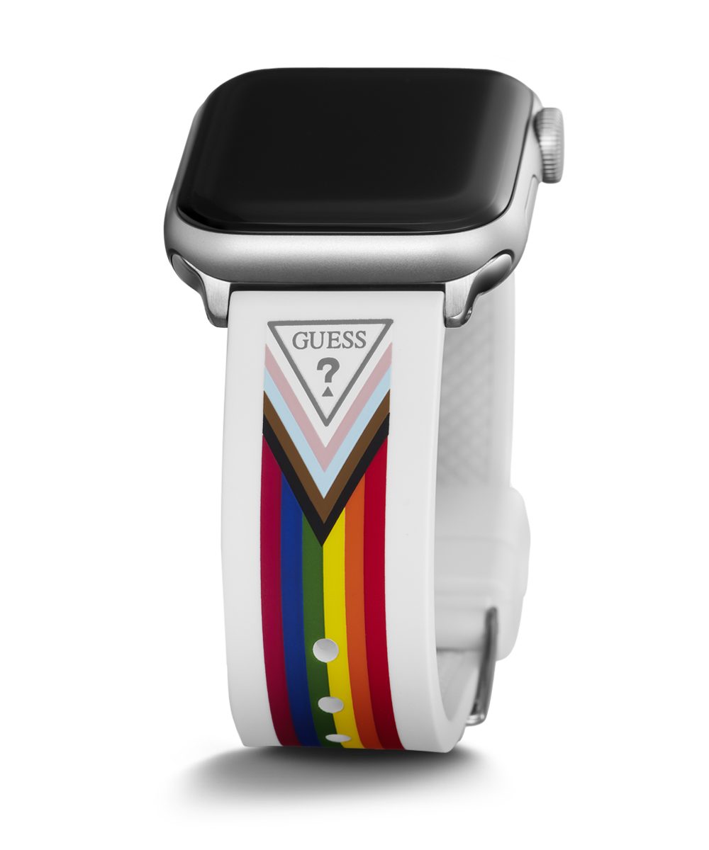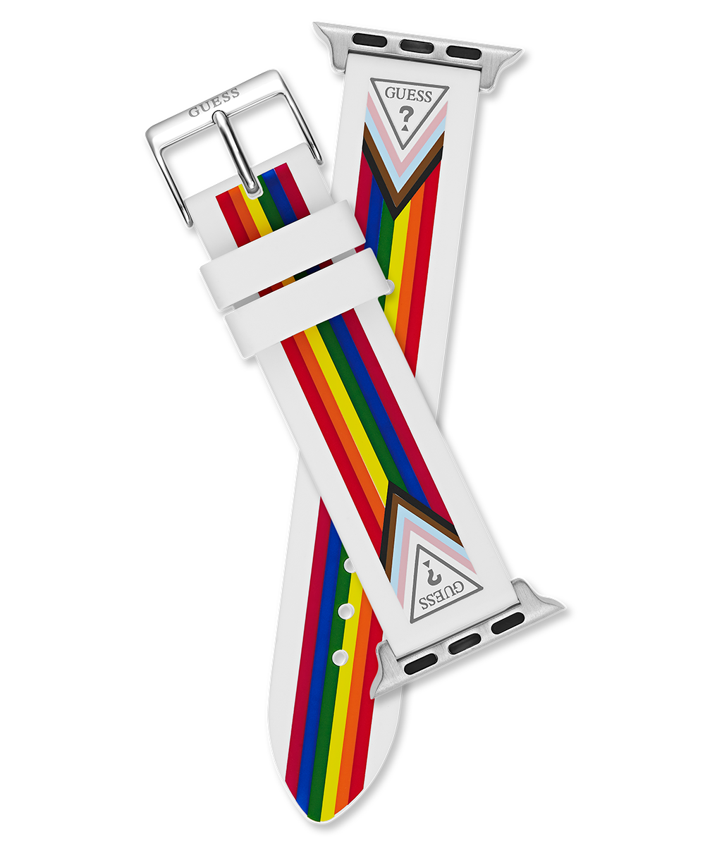 A part of our 'Worn with Pride' collection benefiting the TREVOR PROJECT, this Apple Band is a true style icon. A smooth white silicone strap with the LGBTQ2IA+ Inclusivity Flag printed down the center with the signature GUESS triangle logo. Compatible with Apple Watches 38-40 mm. *Apple Watch not included