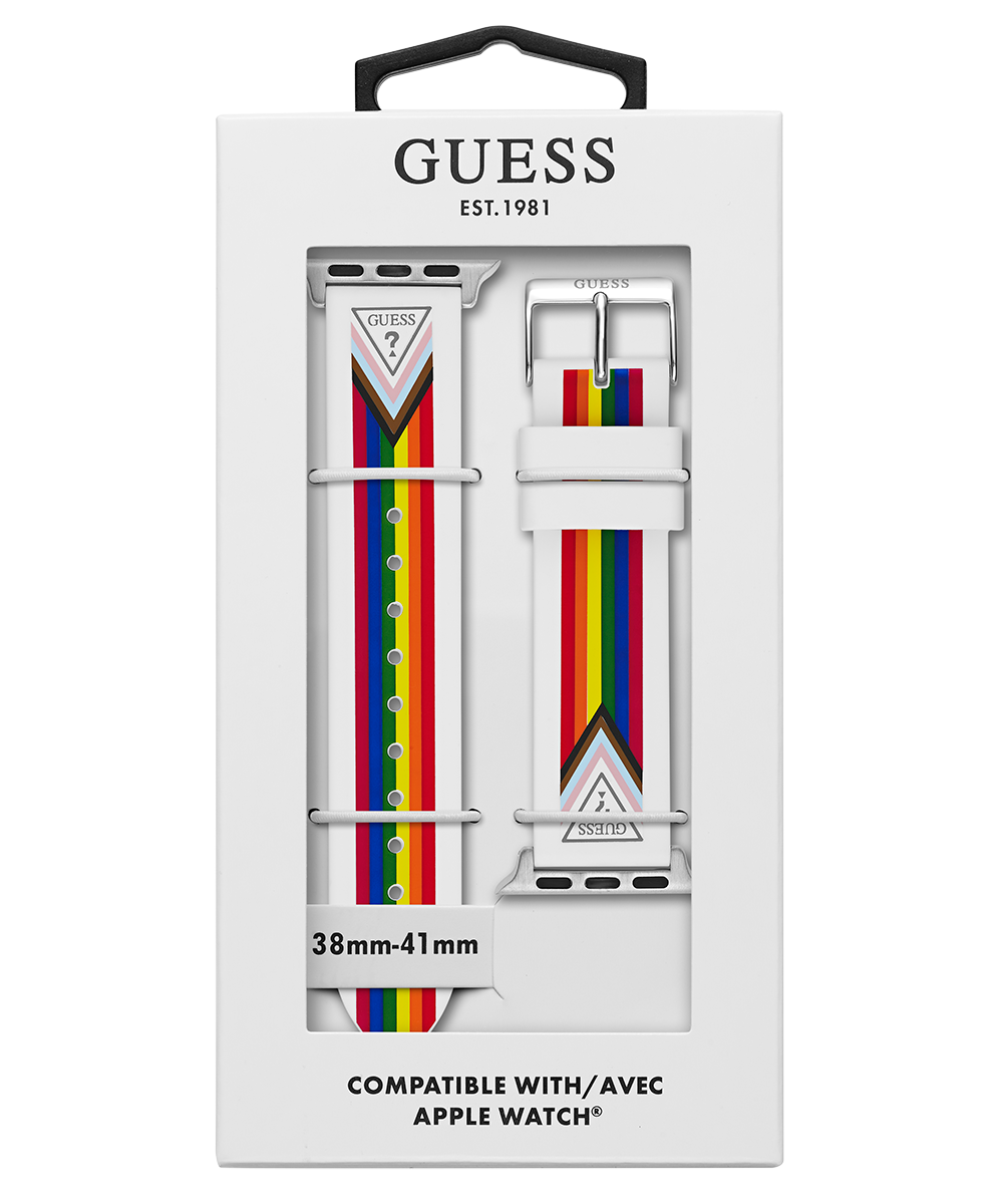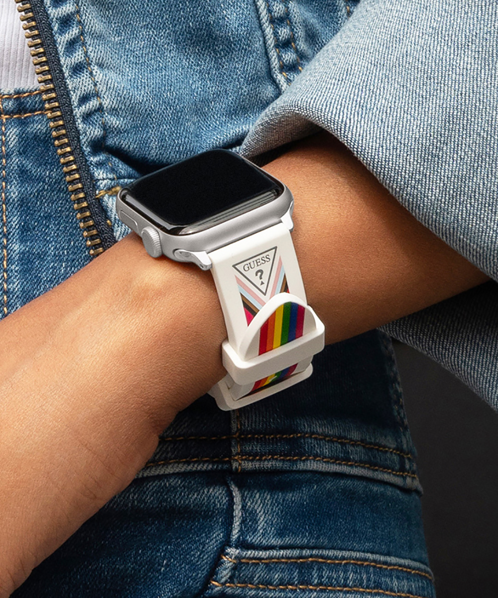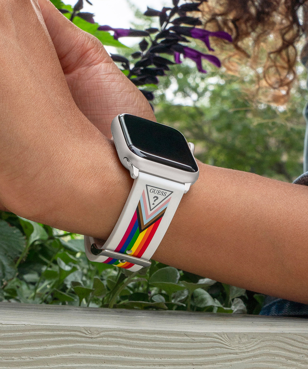 A part of our 'Worn with Pride' collection benefiting the TREVOR PROJECT, this Apple Band is a true style icon. A smooth white silicone strap with the LGBTQ2IA+ Inclusivity Flag printed down the center with the signature GUESS triangle logo. Compatible with Apple Watches 38-40 mm. *Apple Watch not included