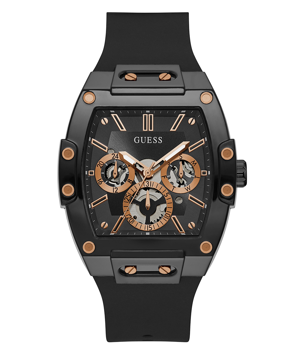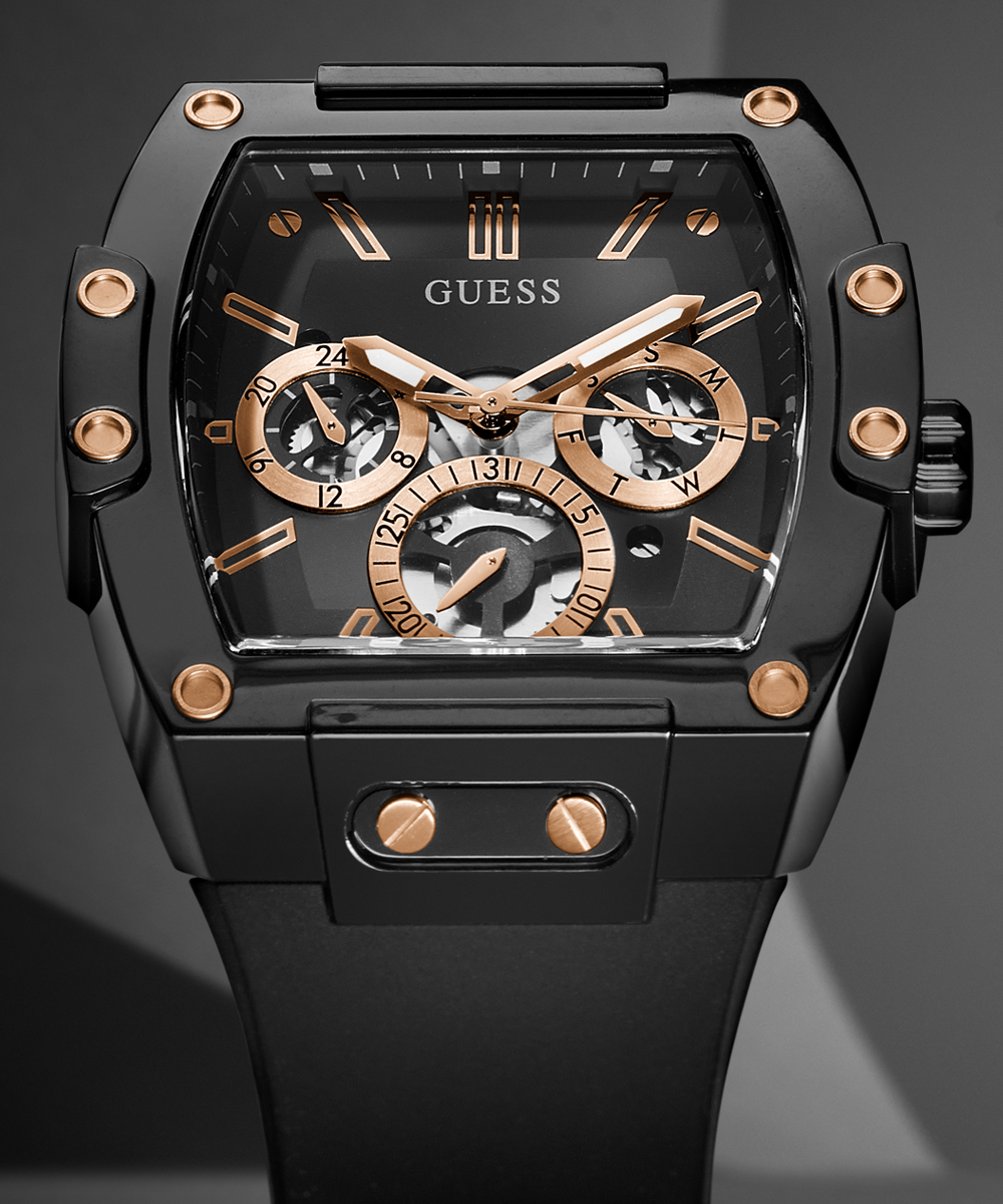 Skeleton dial details keep this phoenix on the rise. This style features a nylon barrel shaped case with rose gold screw details and a black multi-function dial and rose gold accents paired with a black silicone strap.