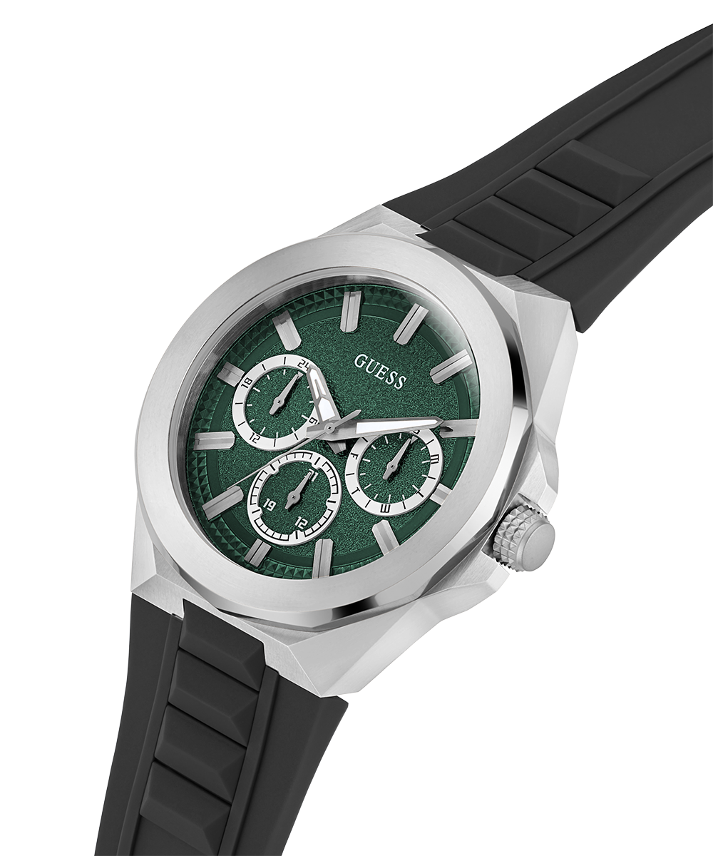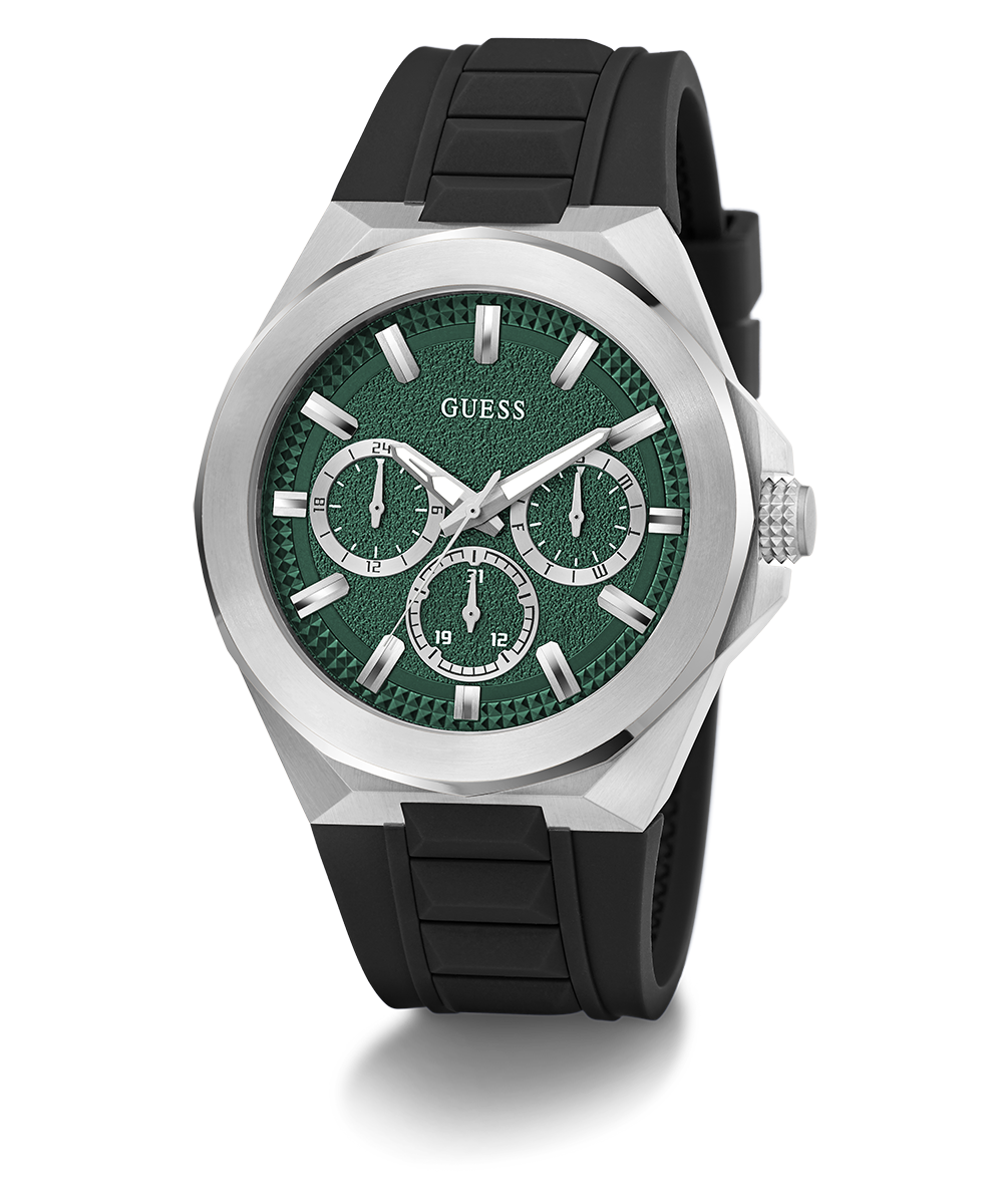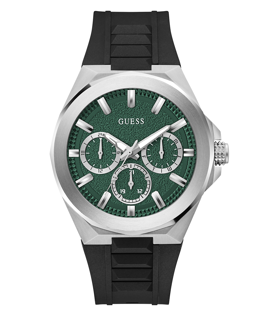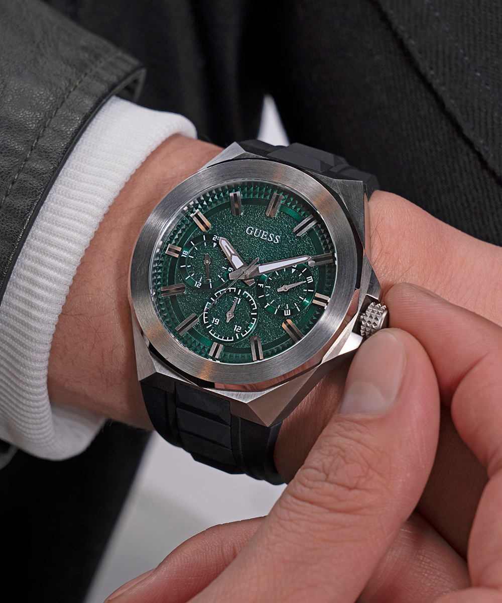 This unique sport look features a multi-function movement on a textured dial with brushed and polished finishing throughout.