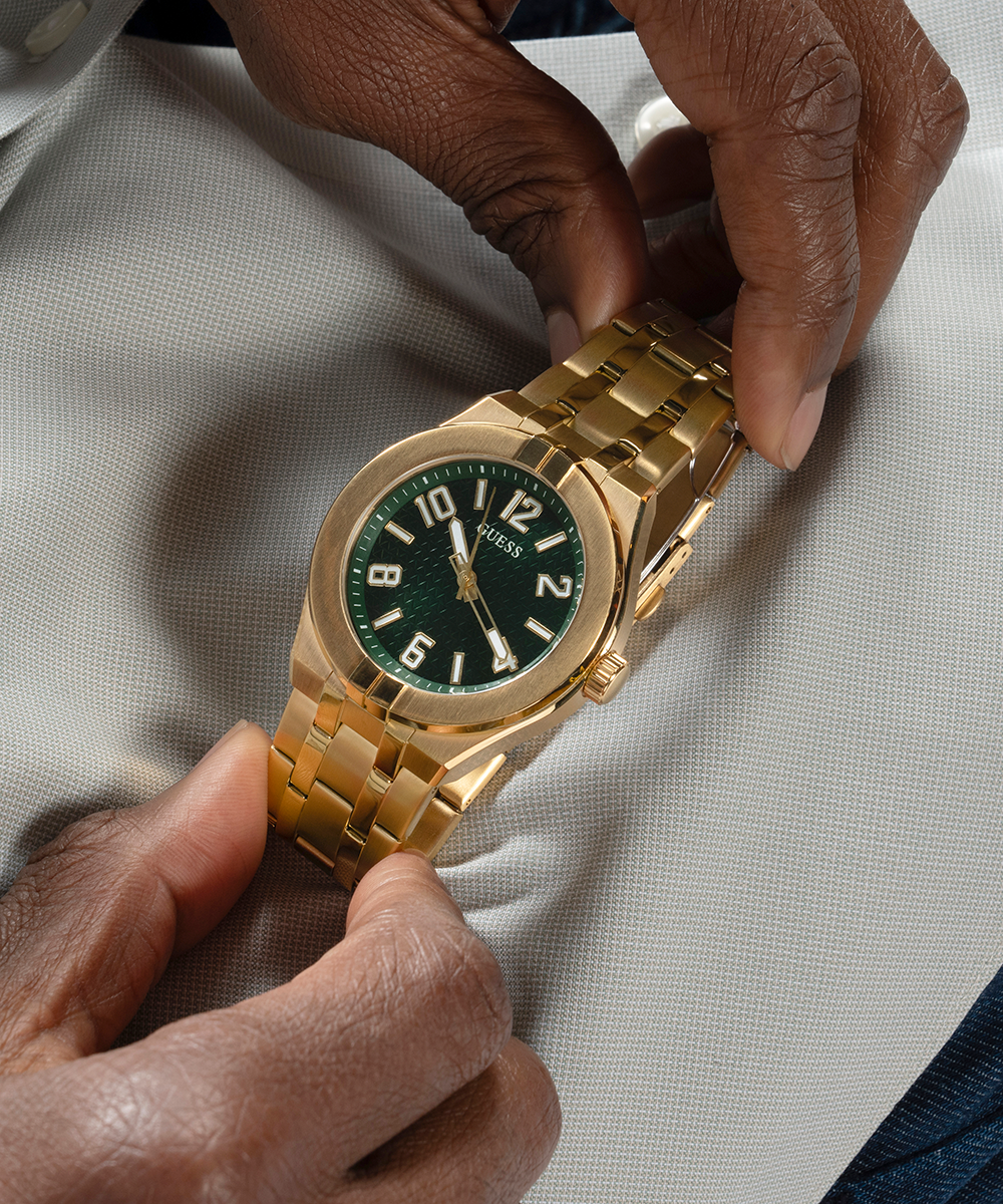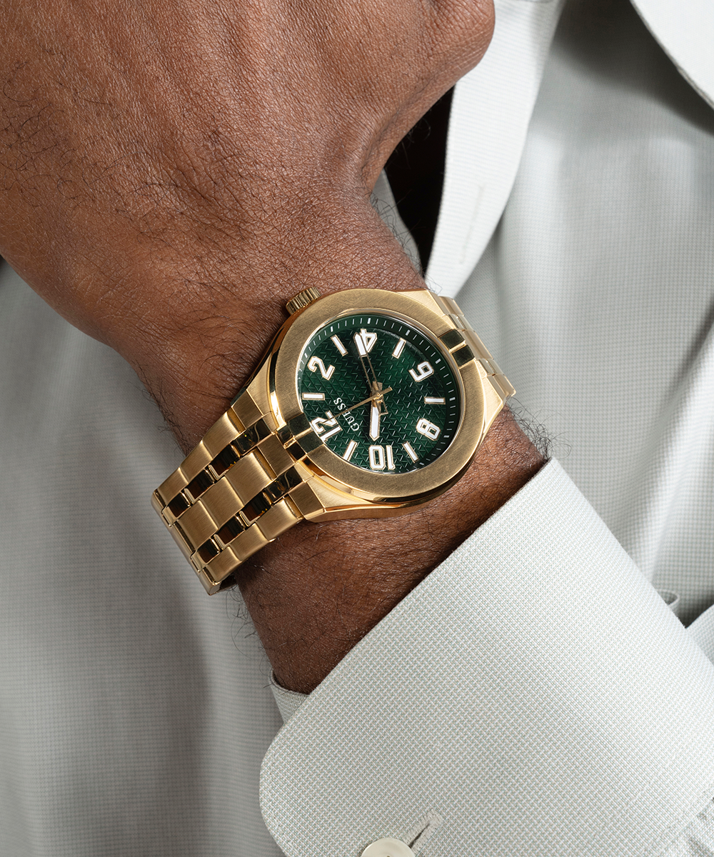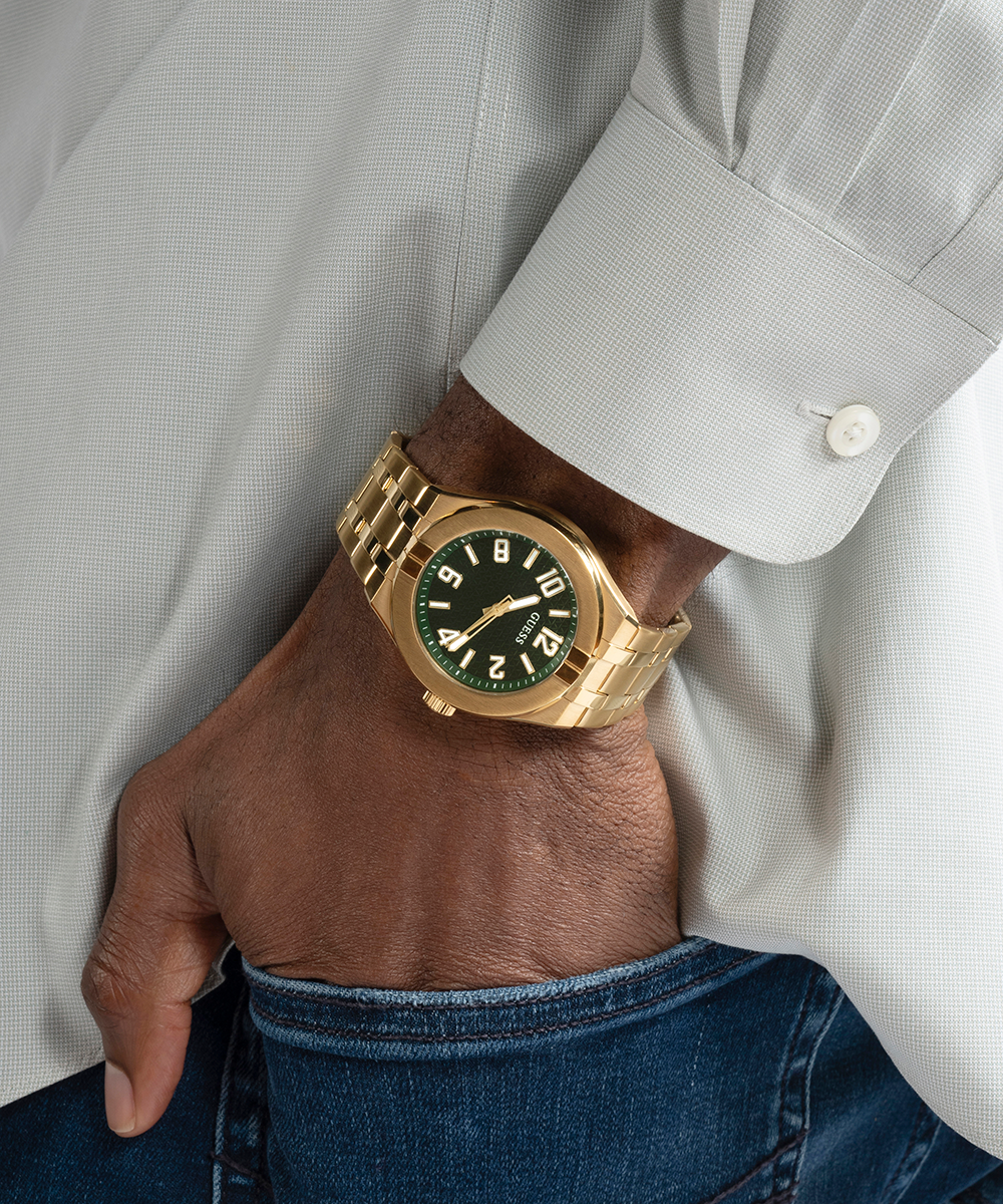 Go to the shopEscape to any destination with this great new look! An oversized bezel with a unique double stripe on either side is paired with oversized arabic numerals for easy time telling