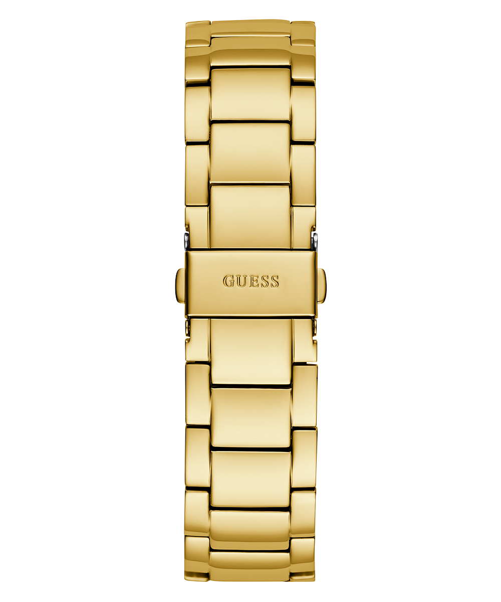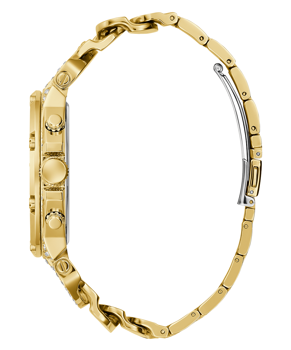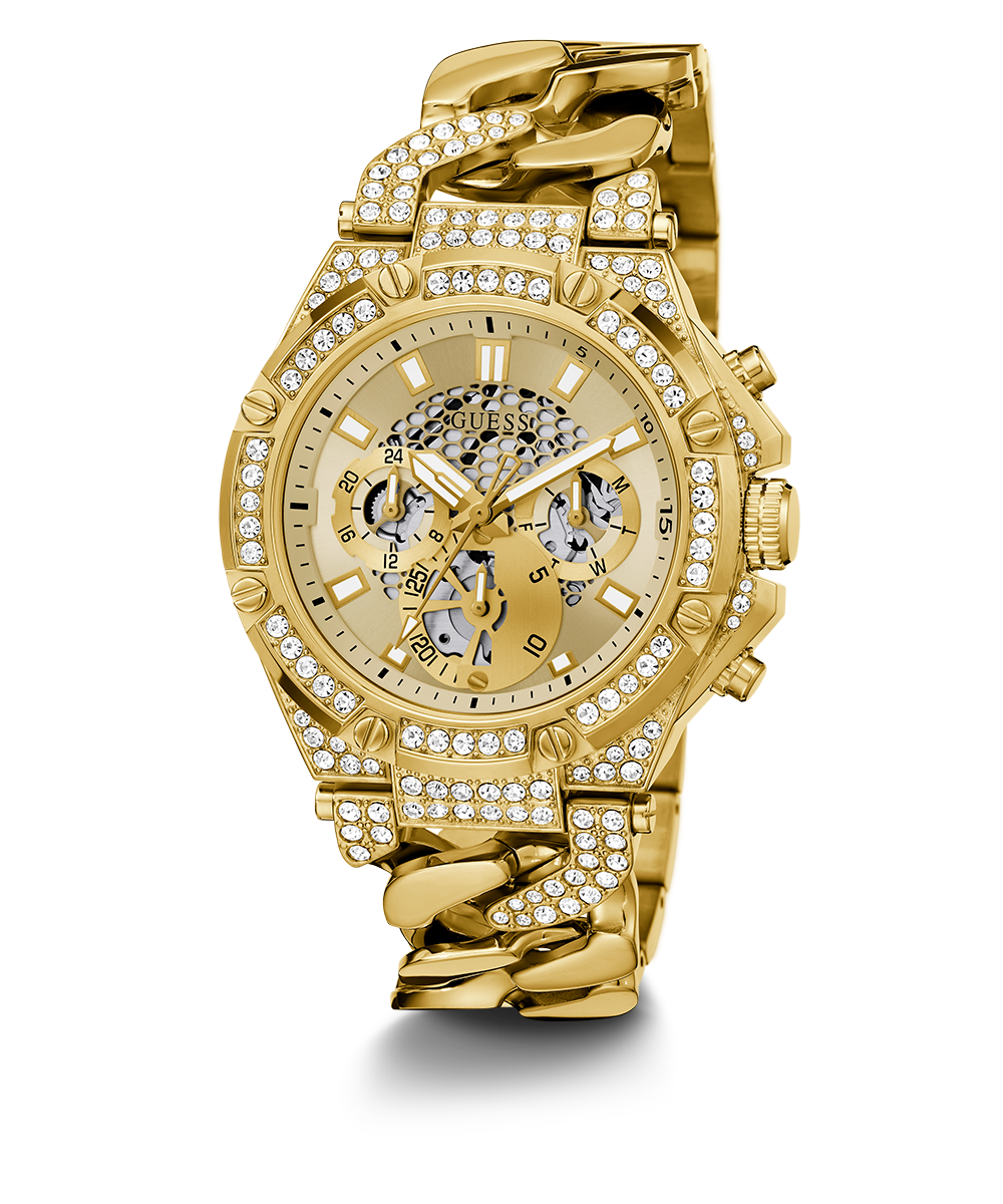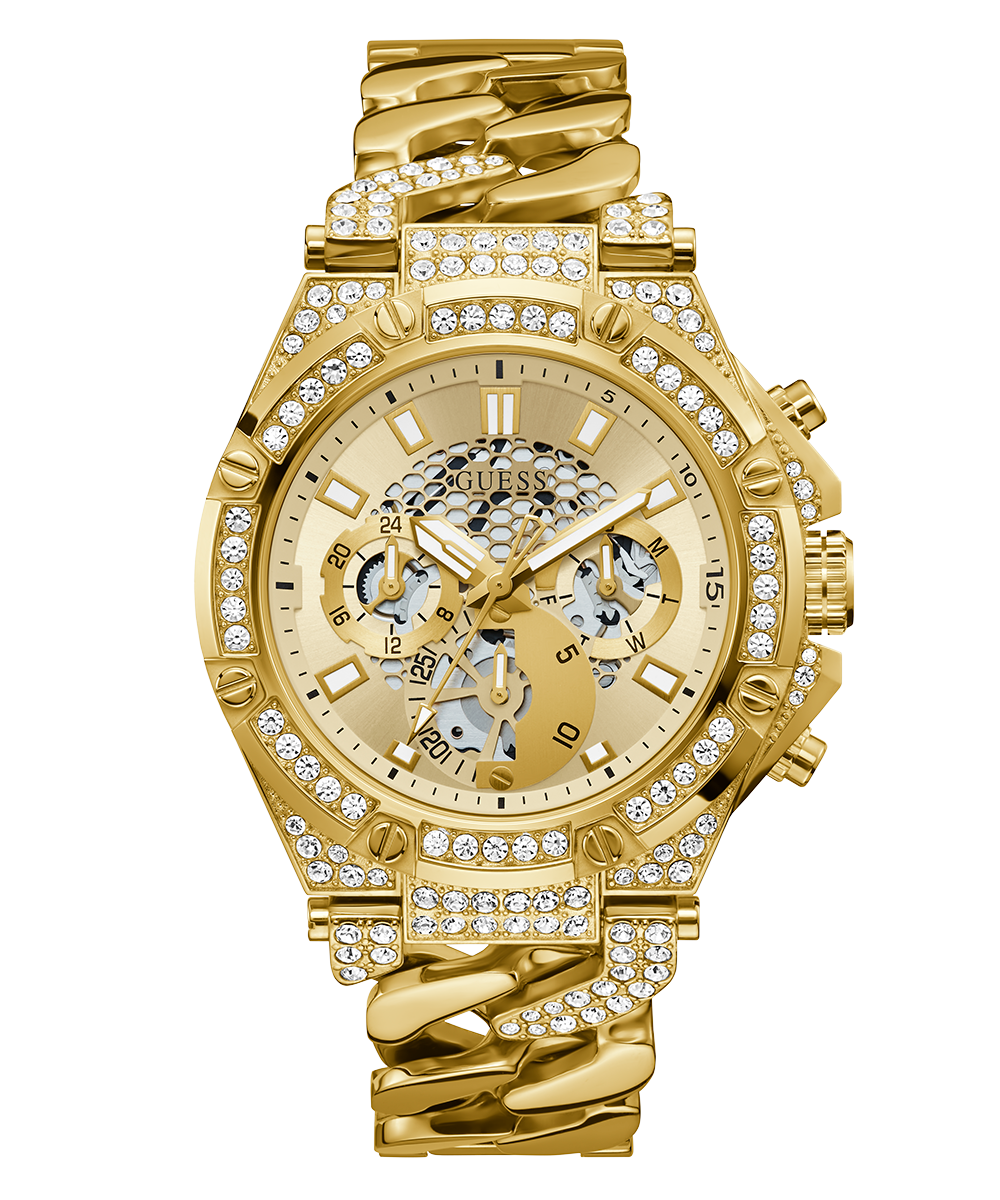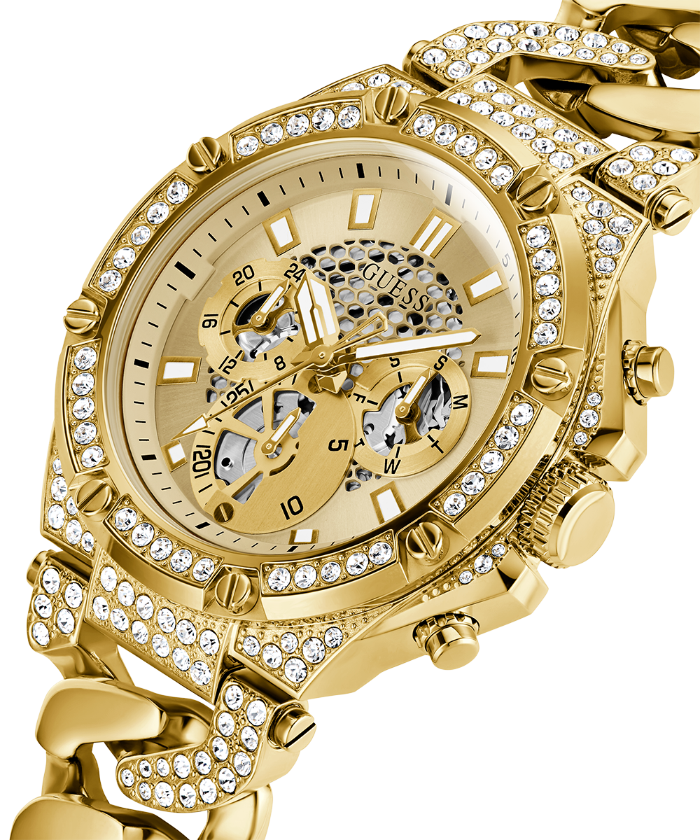 Show stopping crystal details combined with an edgy chain give this style the ultimate look! Featuring a cut thru chrono-look multi-function dial and oversized stones on both the bezel and chain links as well as screw details