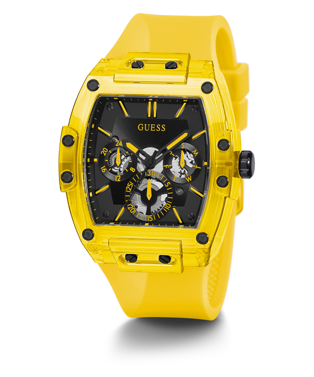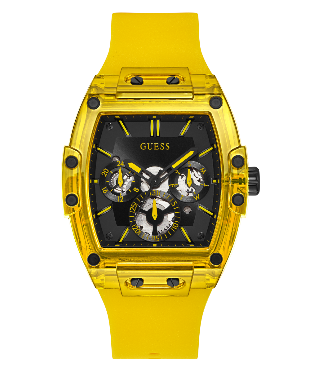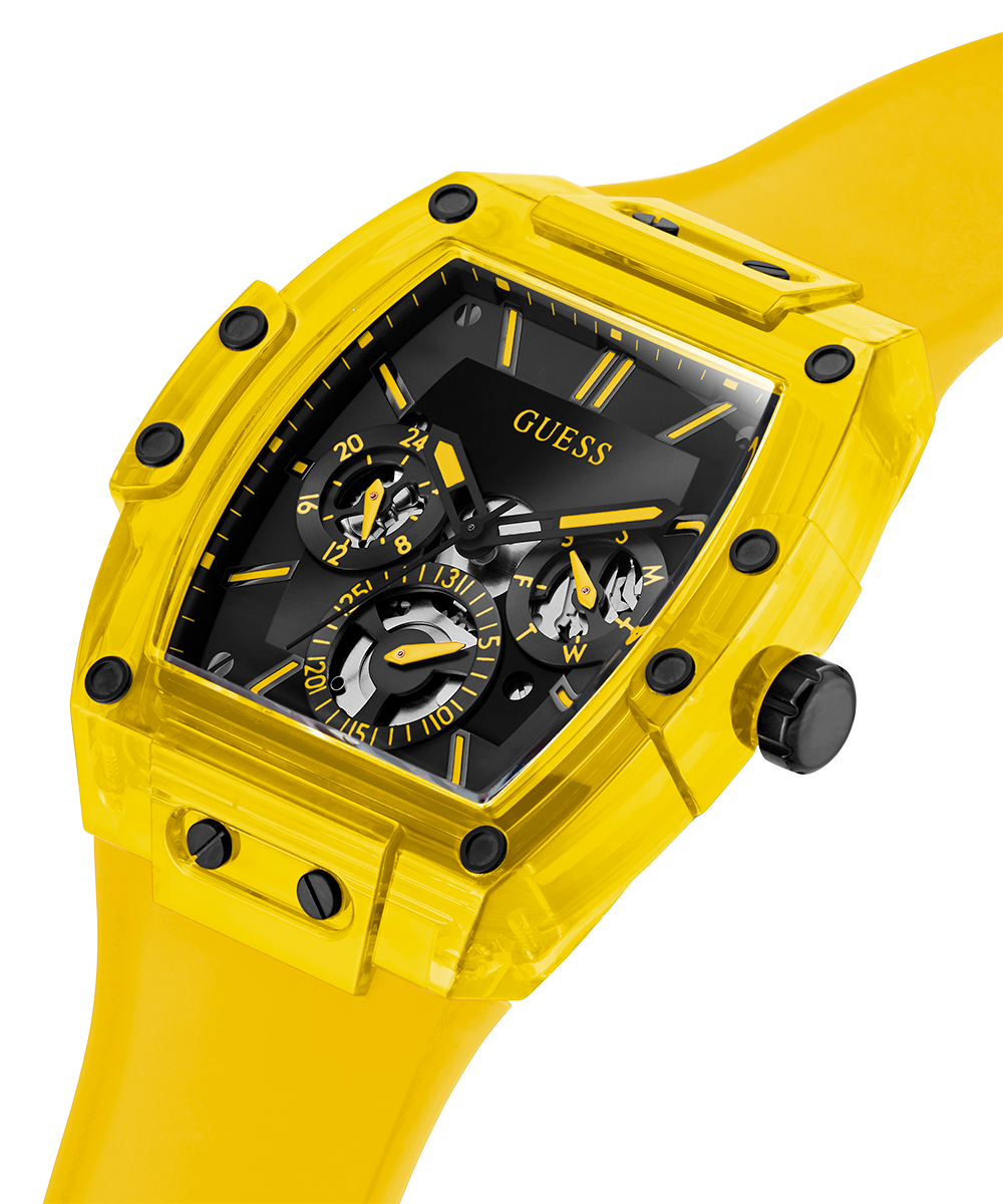 Skeleton dial details keep this phoenix on the rise. This style features a yellow nylon barrel shaped case with black screw details and a black multi-function dial paired with a yellow translucent silicone strap.
