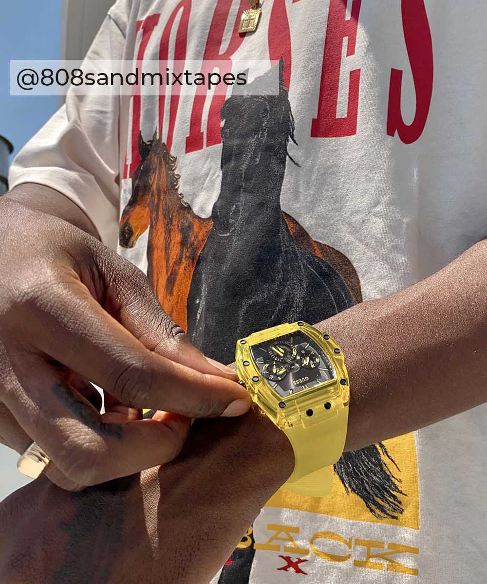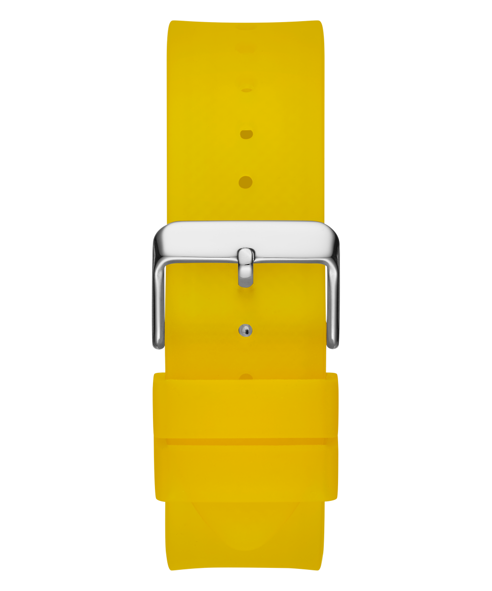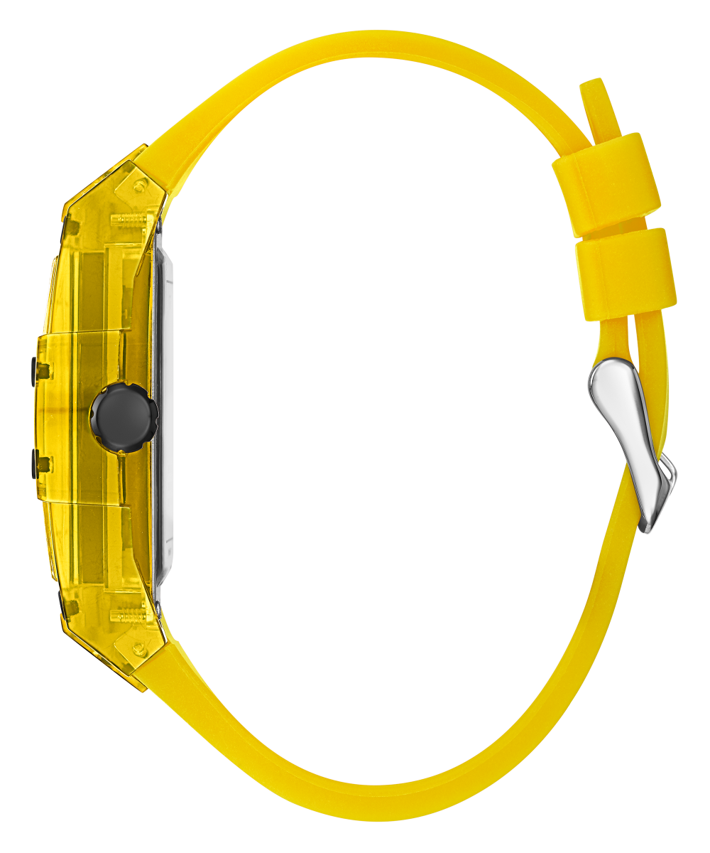 Skeleton dial details keep this phoenix on the rise. This style features a yellow nylon barrel shaped case with black screw details and a black multi-function dial paired with a yellow translucent silicone strap.