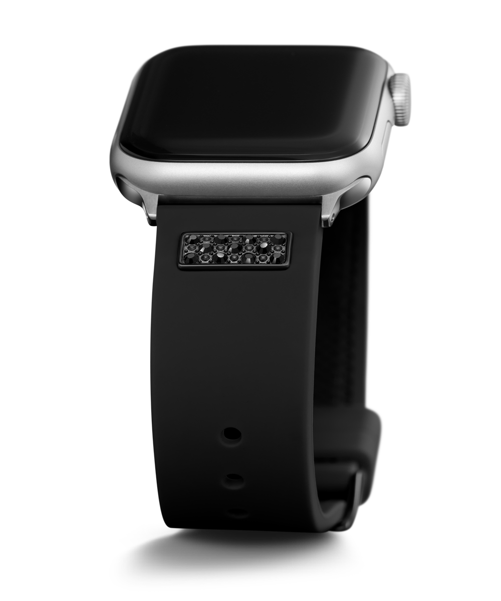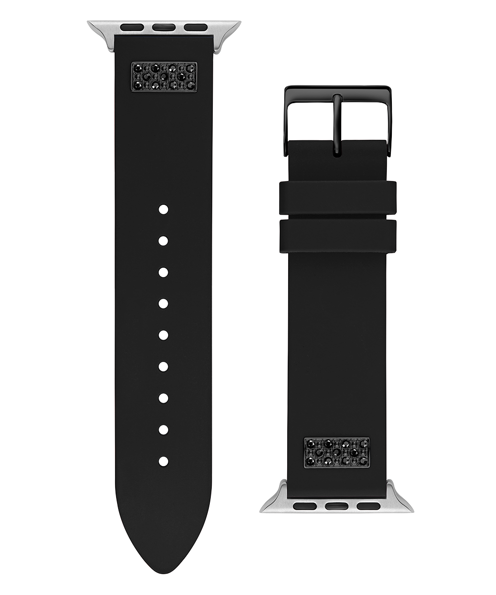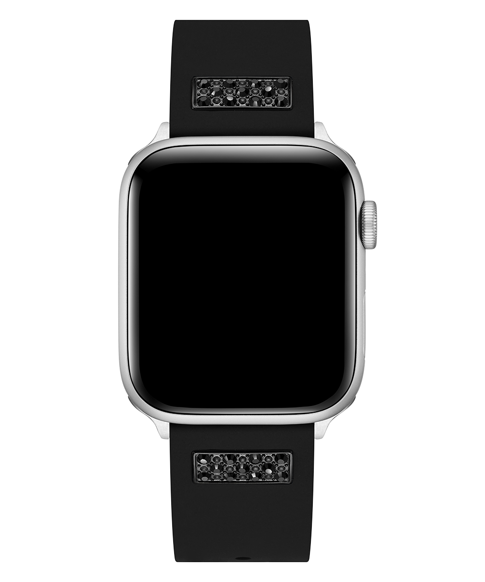 This black silicone band features crystals on a black plaque and is compatible with Apple Watches 42-44 mm. *Apple Watch not included