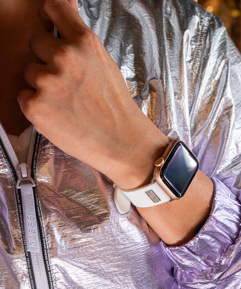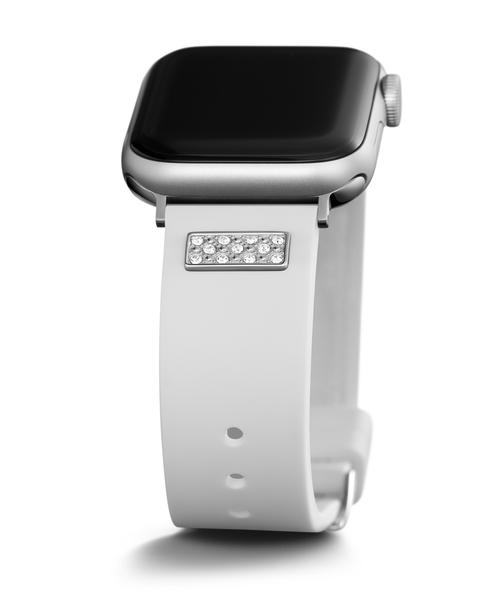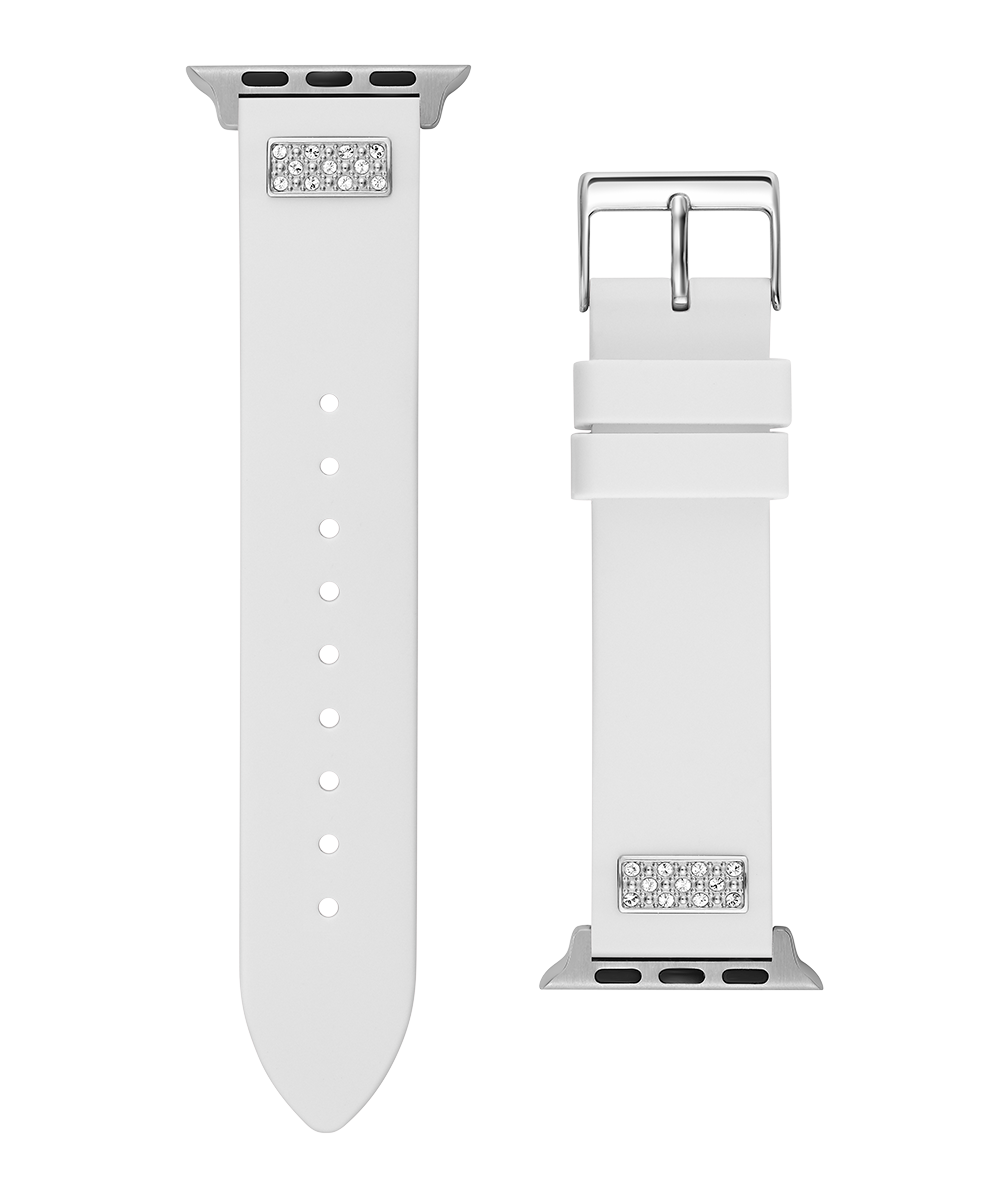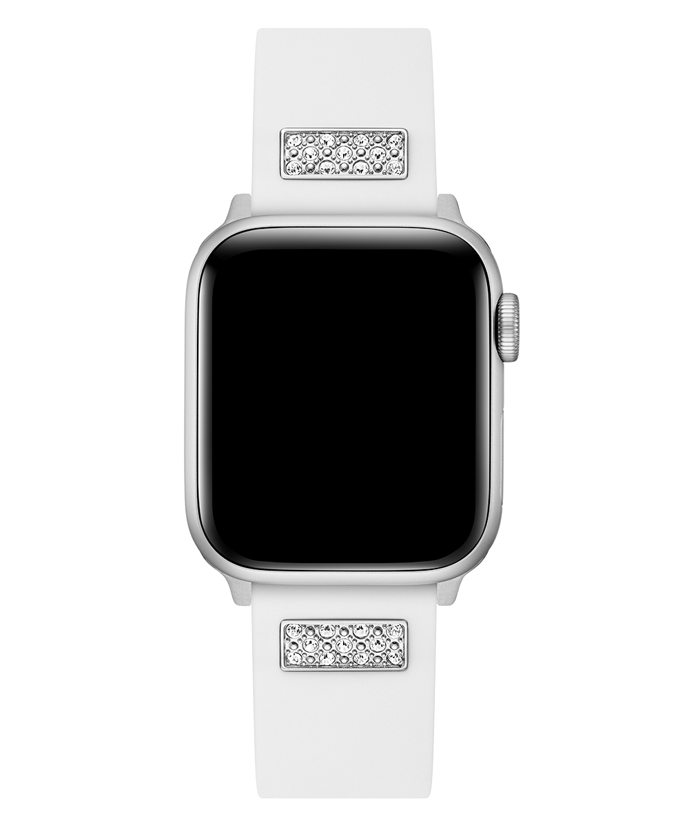 This white silicone band features crystals on a silver-tone plaque and is compatible with Apple Watches 38-40 mm. *Apple Watch not included