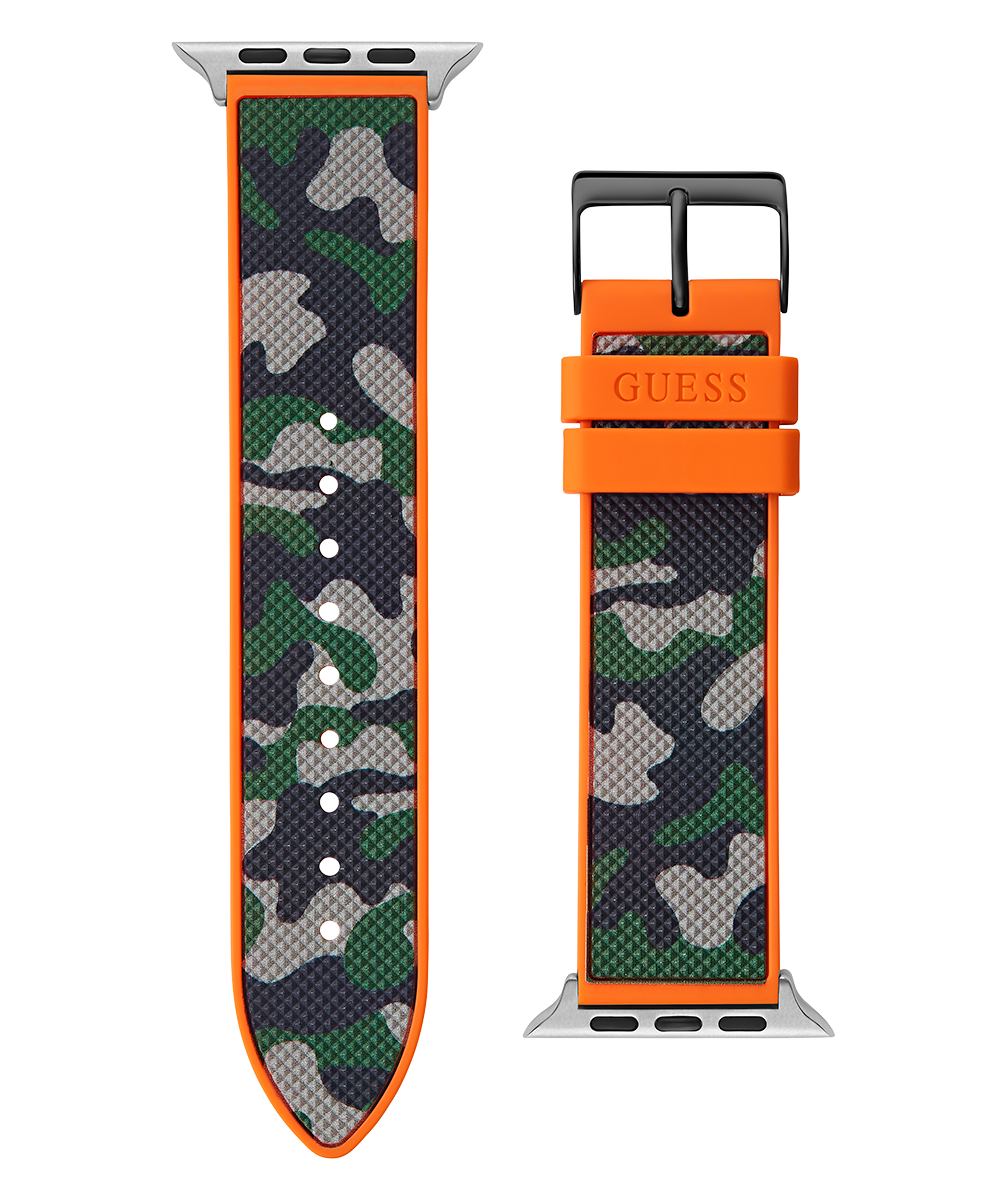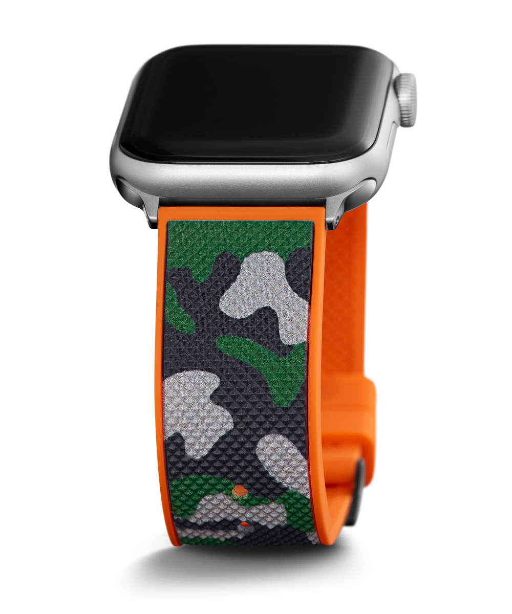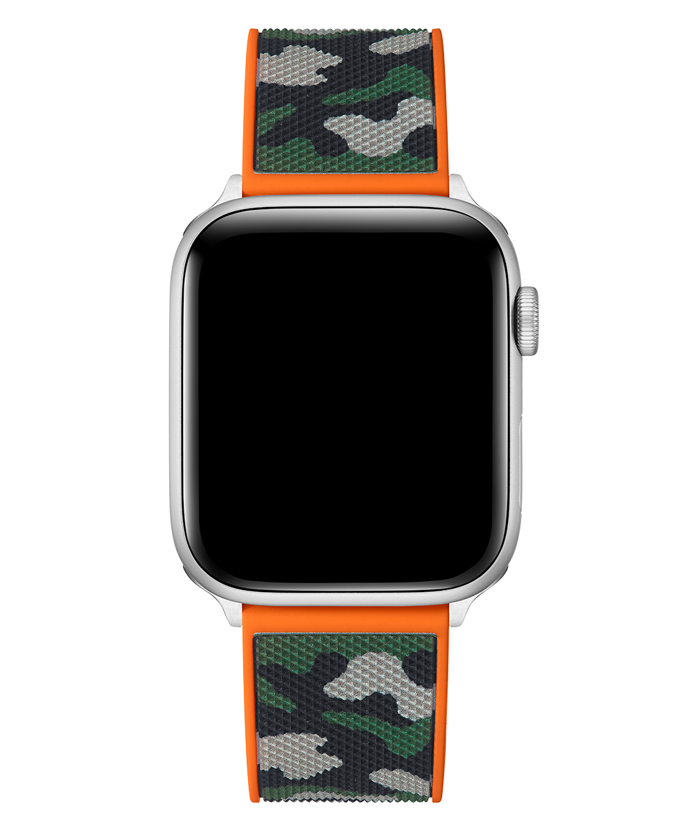 Go to the shopThis camo pattern textured silicone band is paired with an orange silicone making a bold color statement and is compatible with Apple Watches 42-44 mm. *Apple Watch not included