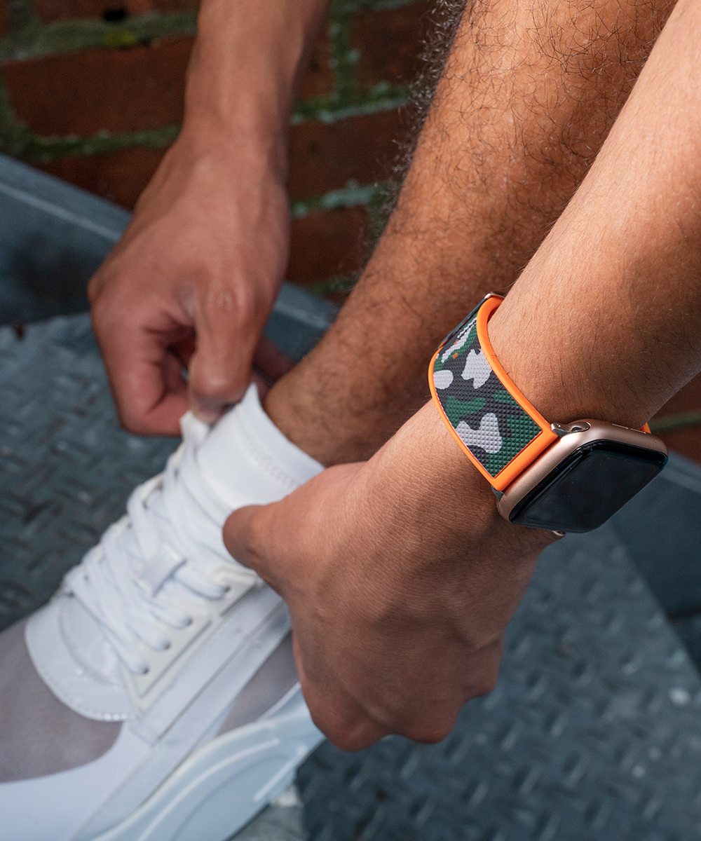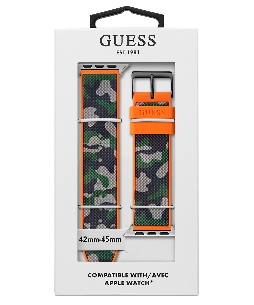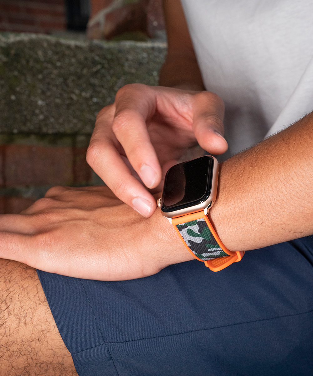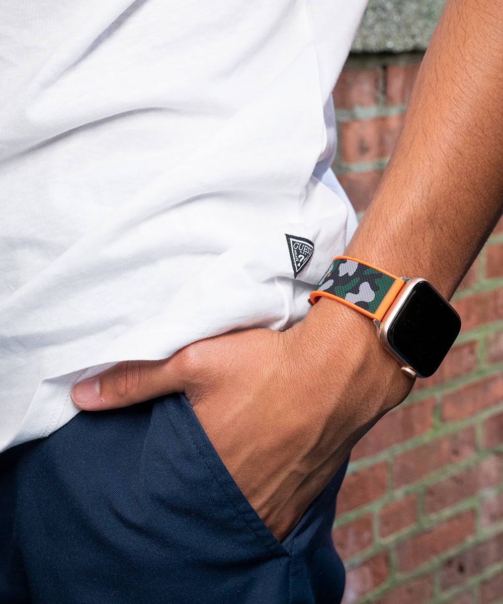 Go to the shopThis camo pattern textured silicone band is paired with an orange silicone making a bold color statement and is compatible with Apple Watches 42-44 mm. *Apple Watch not included