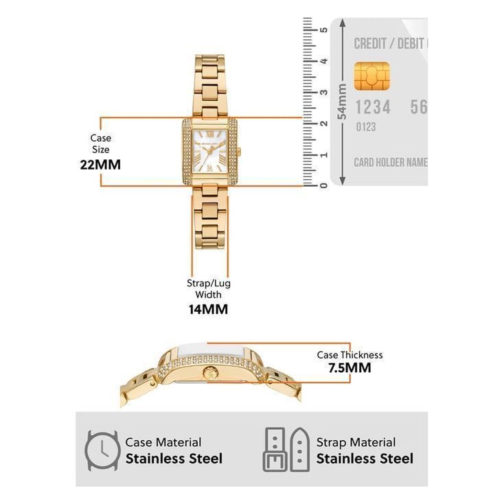 The MK4867 Emery watch showcases a white mother-of-pearl dial with three-hand movement, enhanced by its gold-tone stainless steel bracelet. It's designed for elegance, making it a standout accessory for any outfit. Meticulously crafted, this watch not only tells time but also exudes a refined style that is perfect for every occasion. This luxurious timepiece is a must-have addition to any woman's collection.