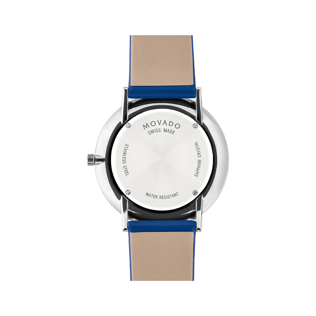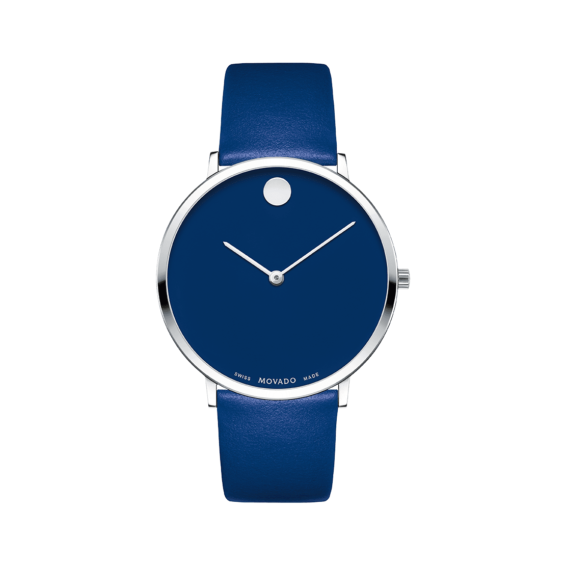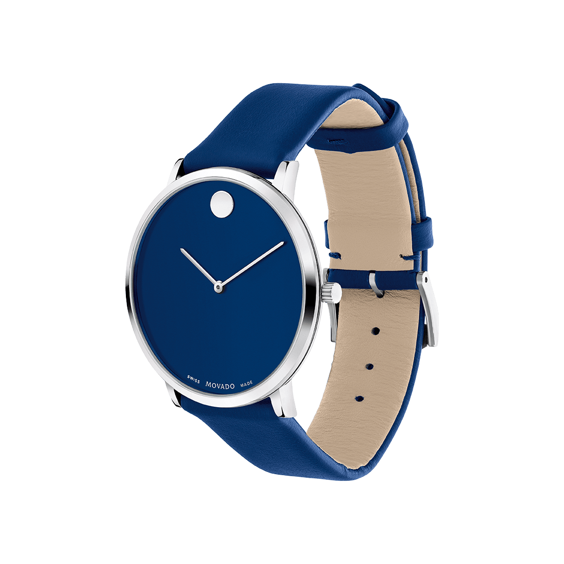 Movado.com EXCLUSIVE Museum Dial Modern 47 watch, 40 mm stainless steel case, 6.30 mm thin, with blue dial and stainless steel original flat dot and stick hands, blue calfskin strap with stainless steel classic tongue buckle.