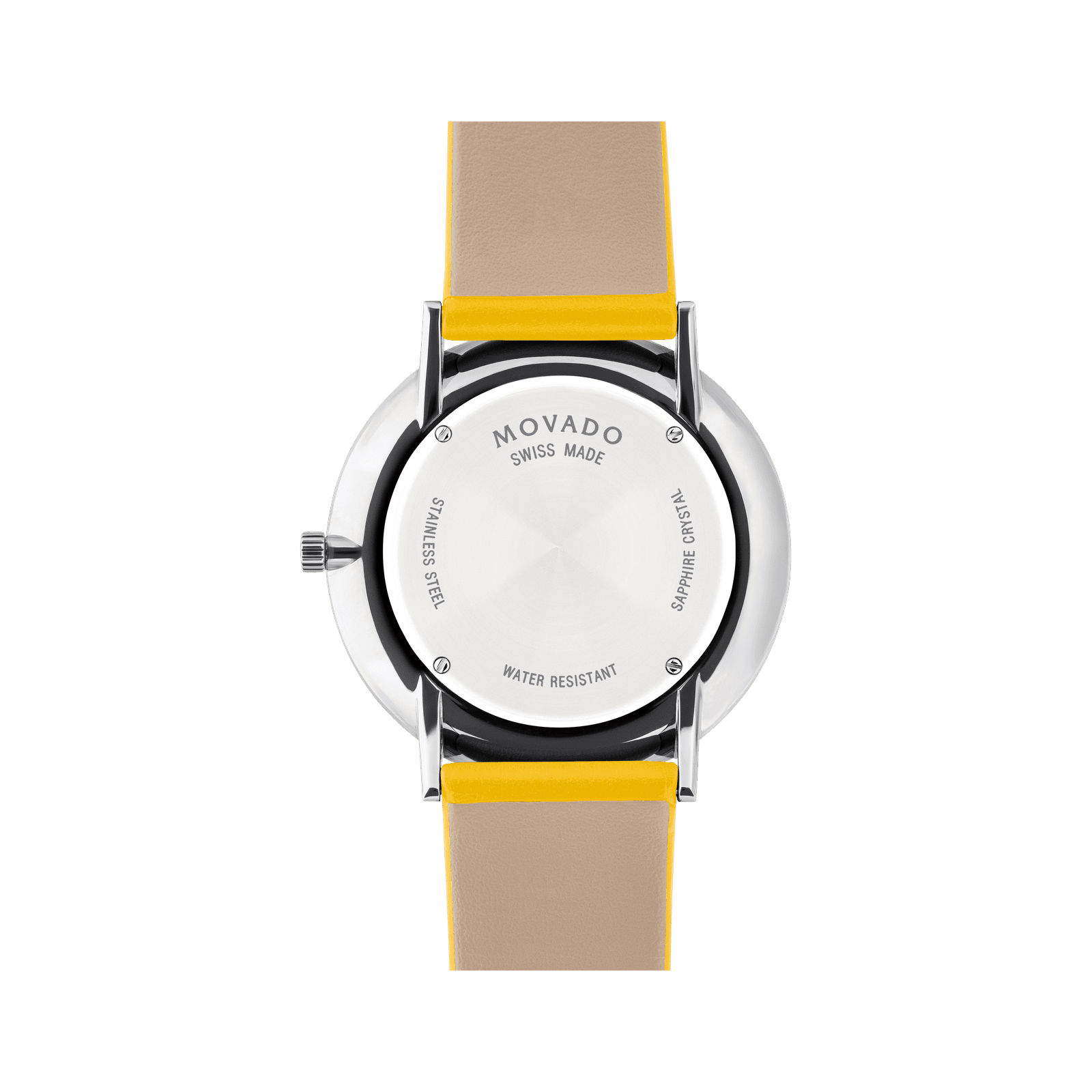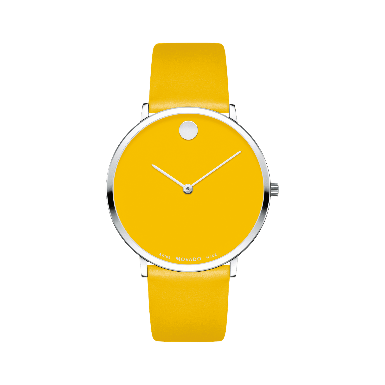 Go to the shopMovado Museum Dial Modern 47 watch, 40 mm stainless steel case, 6.30 mm thin, with yellow dial and stainless steel original flat dot and stick hands, yellow calfskin strap with stainless steel classic tongue buckle.