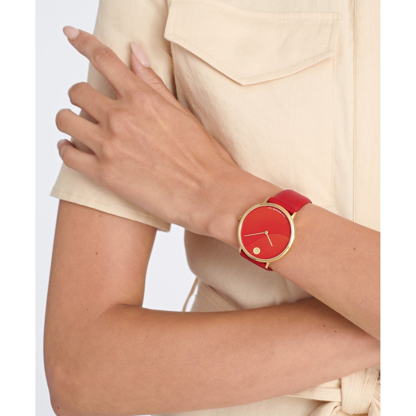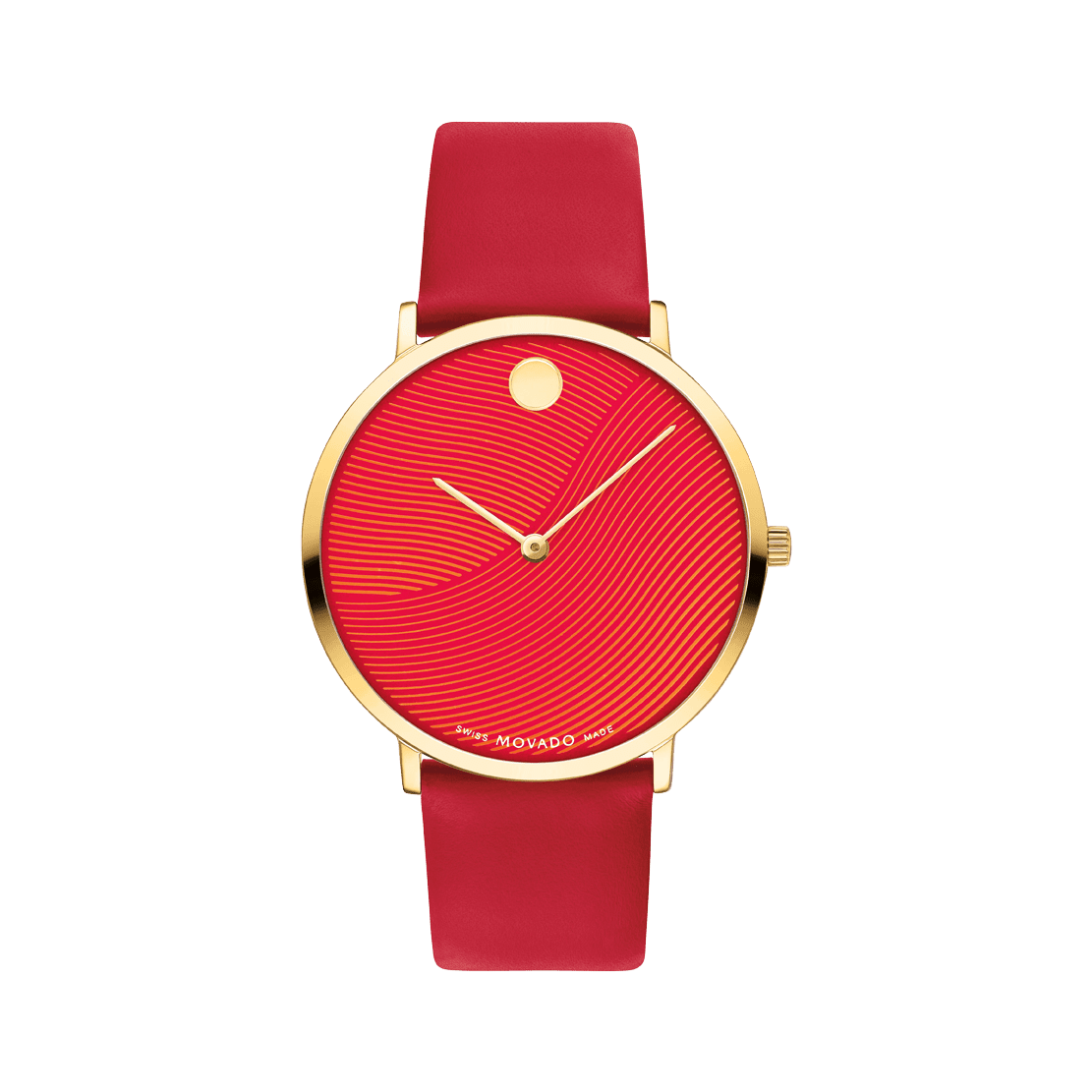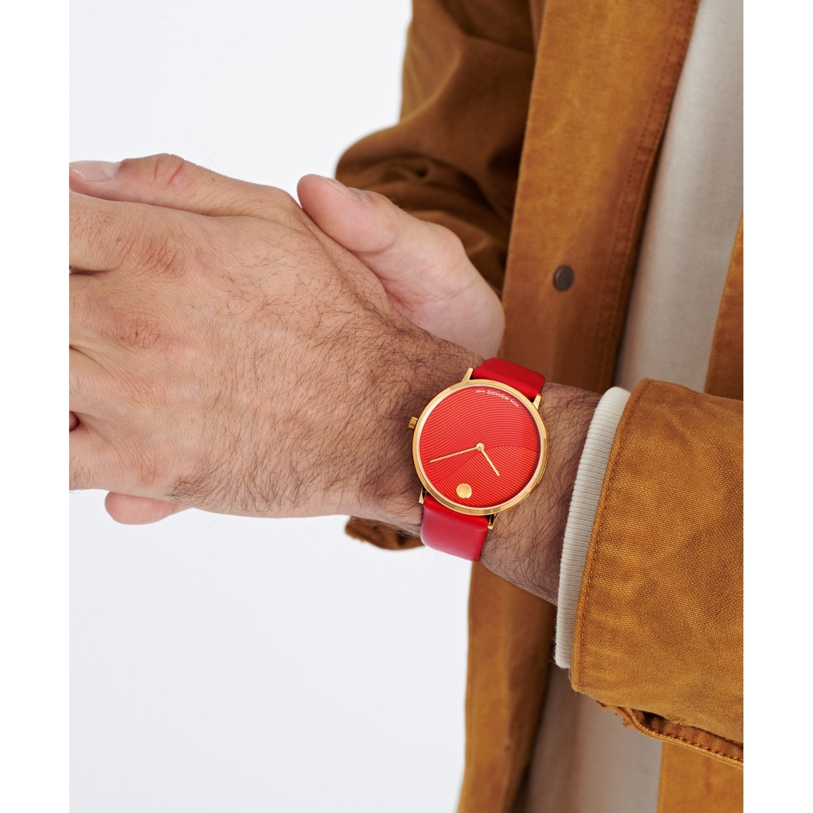 Go to the shopMovado.com EXCLUSIVE, Modern 47, 40mm pale yellow gold PVD-finished stainless steel case with a red sand dune-inspired dial on a red leather strap.