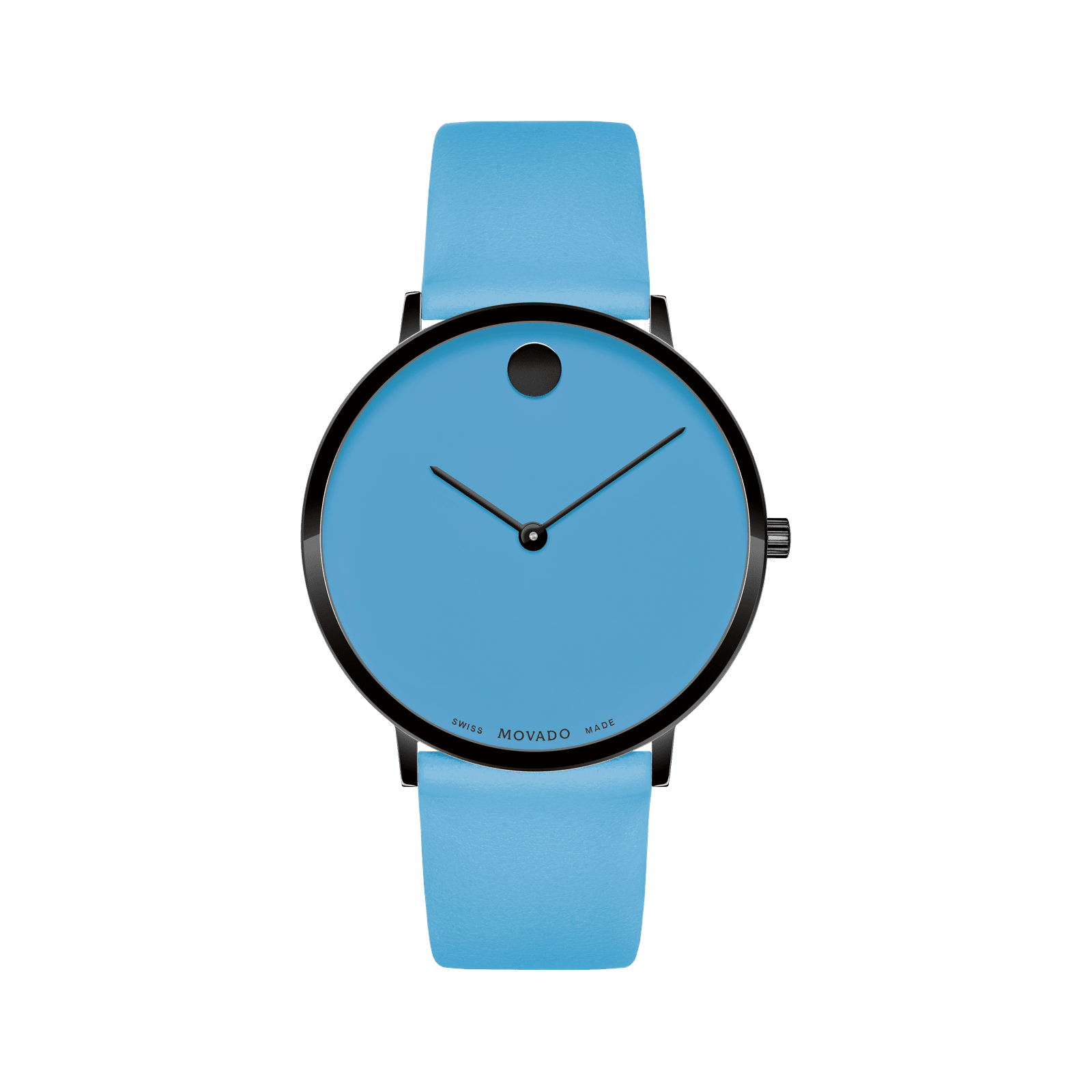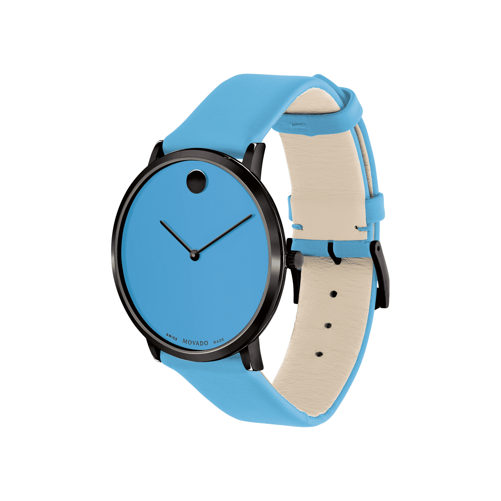Movado.com EXCLUSIVE Modern 47, 40 mm black PVD-finished stainless steel case with blue-toned dial on blue leather strap.