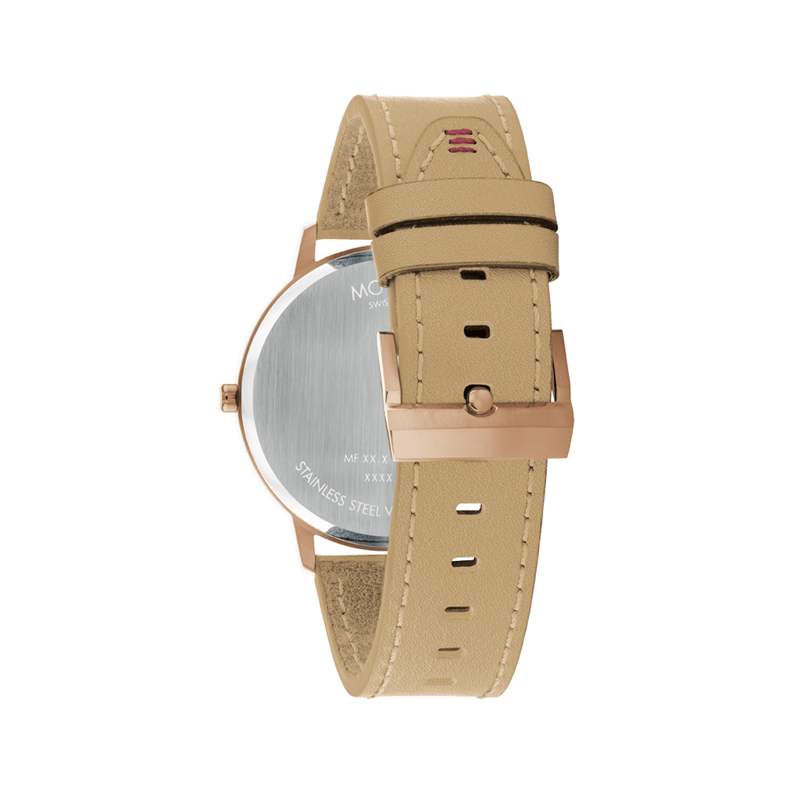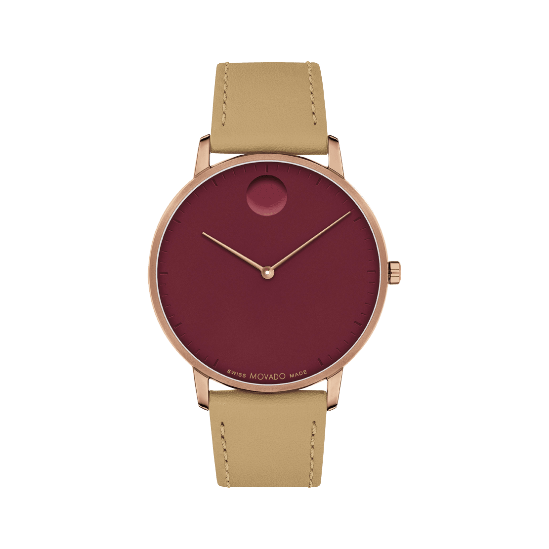 A fresh, fun take on ultra-modern, hyper-minimalist design. Add a pop of color to any look with this vibrant Face watch. Its 41mm bronze ion-plated stainless steel case houses a warm red dial with slim bronze hands and a recessed dot at 12 o’clock. We’ve paired it with a camel...