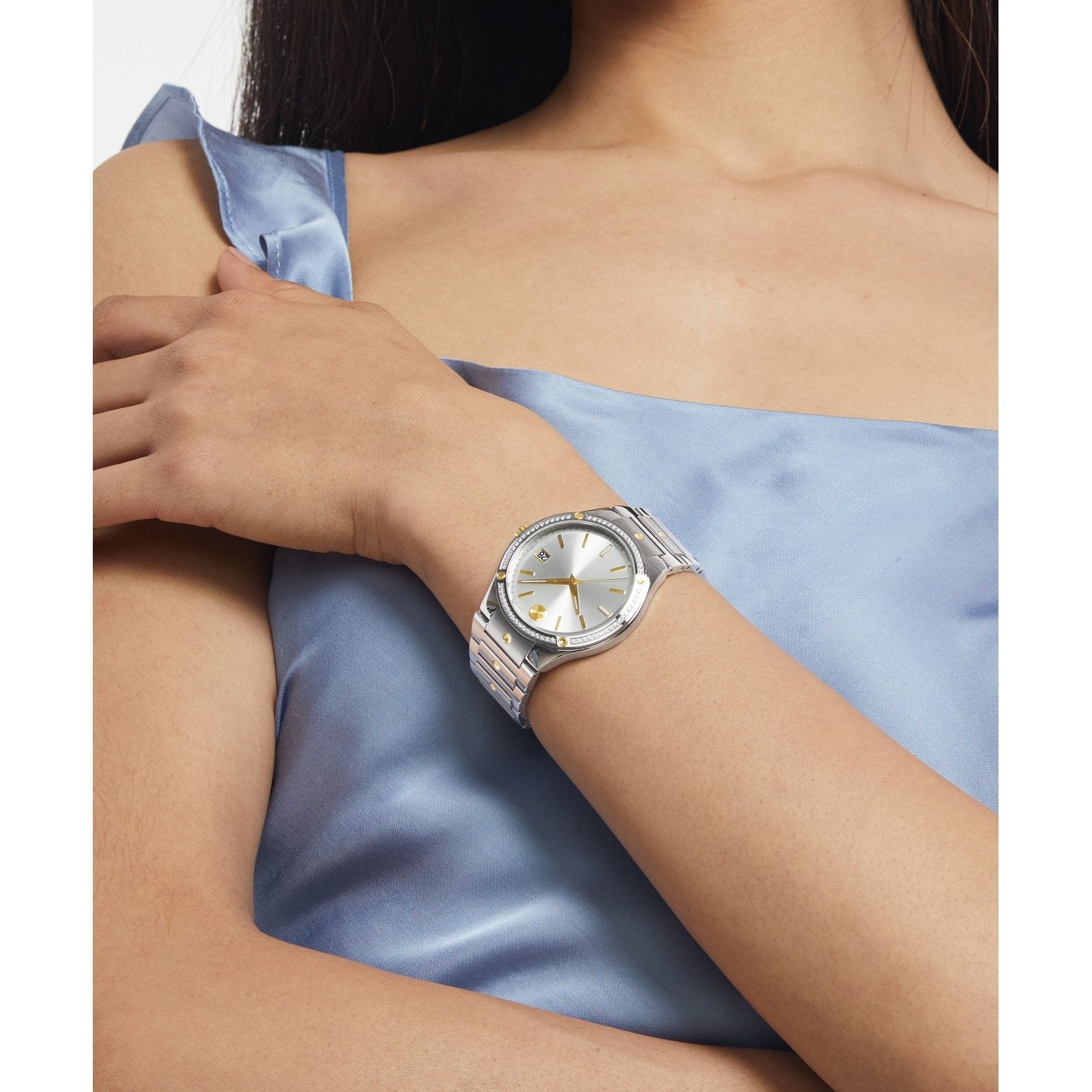 Sophisticated elegance meets sporty style. This stunning watch makes a chic statement piece with its two-tone design and a sparkling diamond-set bezel. We’ve added a signature touch with our iconic dot motif displayed in gleaming yellow gold PVD at 12 o’clock and in concave accents at the bezel and bracelet....