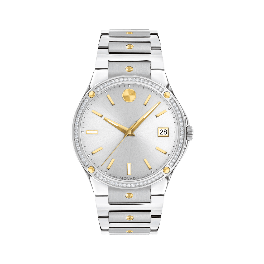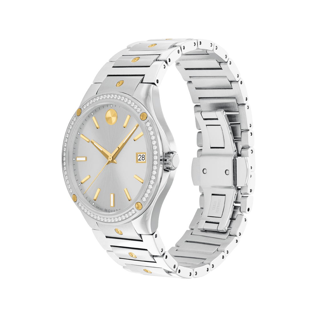 Sophisticated elegance meets sporty style. This stunning watch makes a chic statement piece with its two-tone design and a sparkling diamond-set bezel. We’ve added a signature touch with our iconic dot motif displayed in gleaming yellow gold PVD at 12 o’clock and in concave accents at the bezel and bracelet. The 41mm stainless steel case frames a stunning silver-toned sunray dial outfitted with anti-reflective sapphire crystal, a date window, and Swiss Super-LumiNova® hands, hour markers, and indices at 6:00 and 9:00.