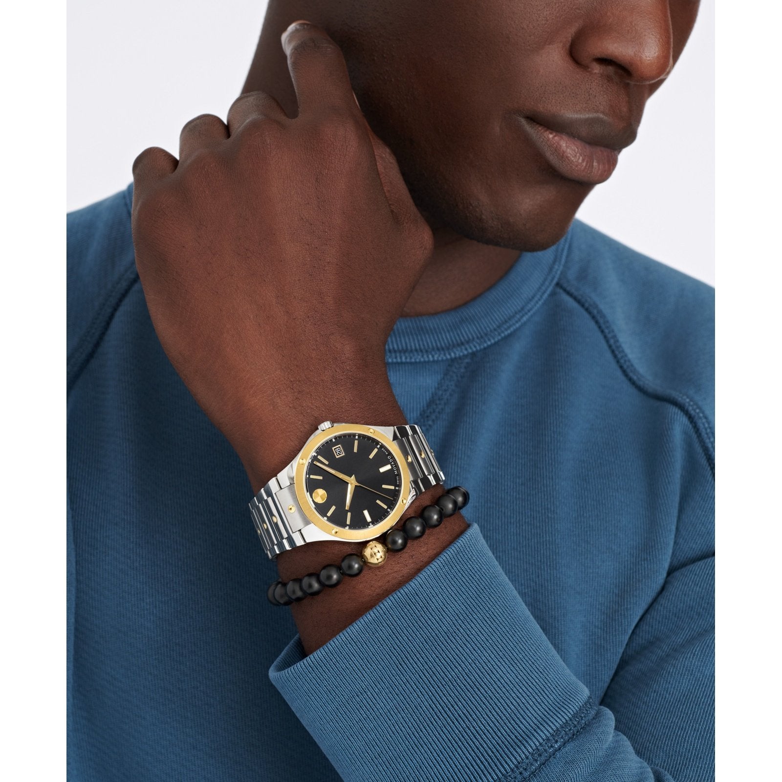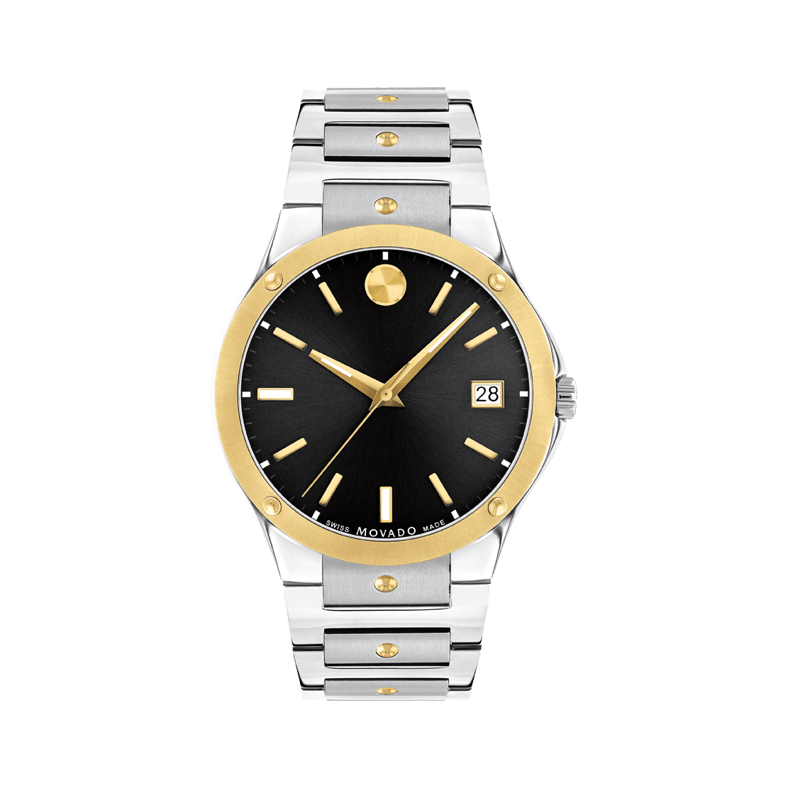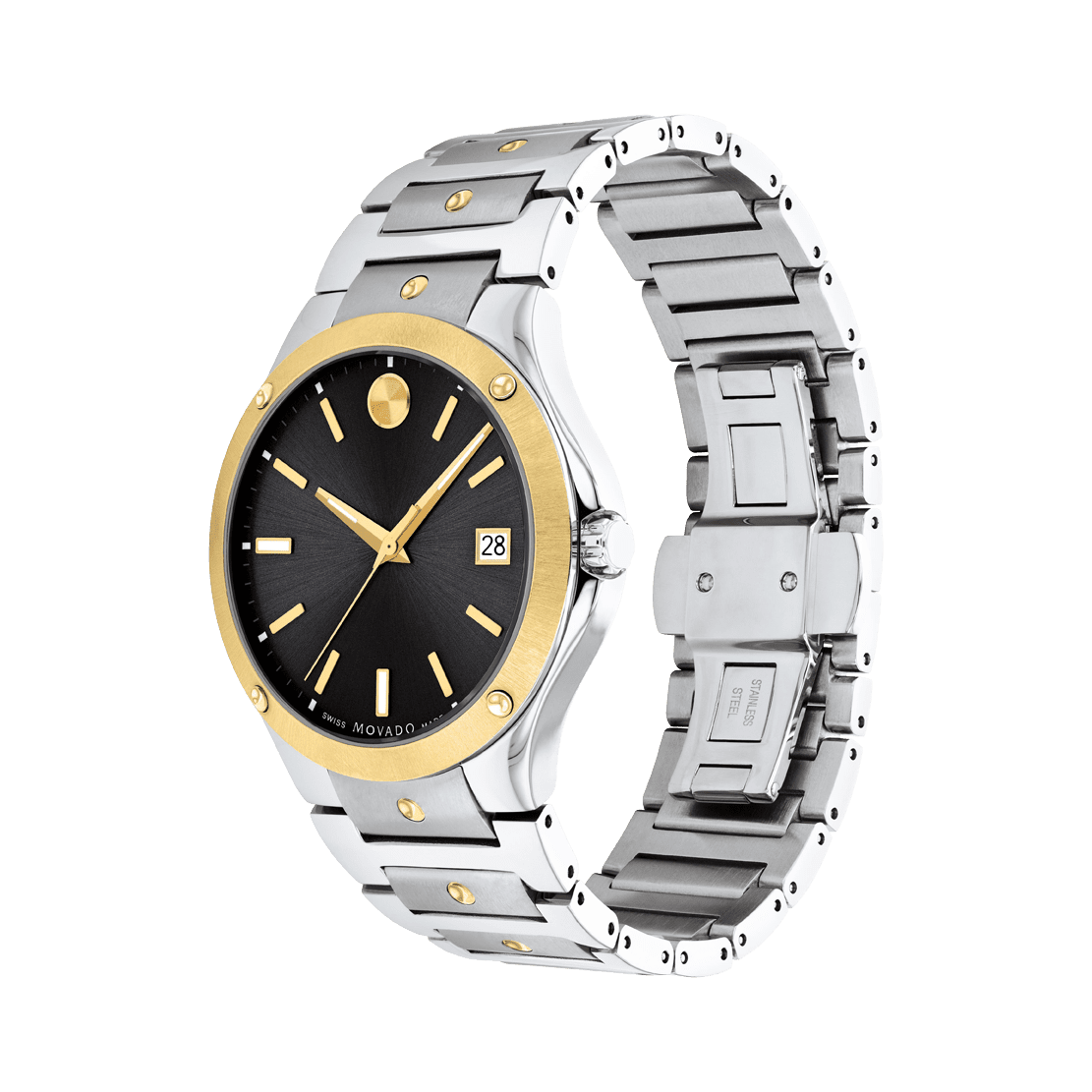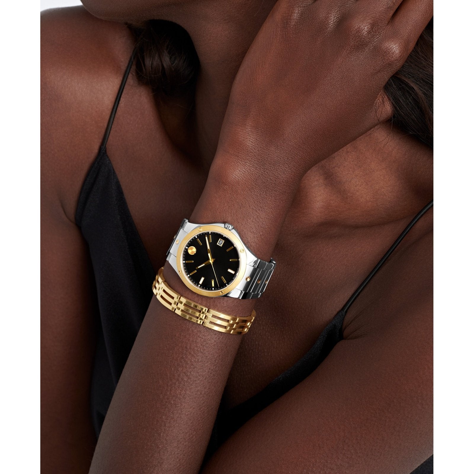 Movado SE, 41mm dual finished stainless steel case and bracelet with yellow gold PVD-finshed concave polished dot accents & black sunray dial. Features sapphire crystal, date window detailing, and Swiss Super-LumiNova® hands, hour markers & indices at 6:00 and 9:00.