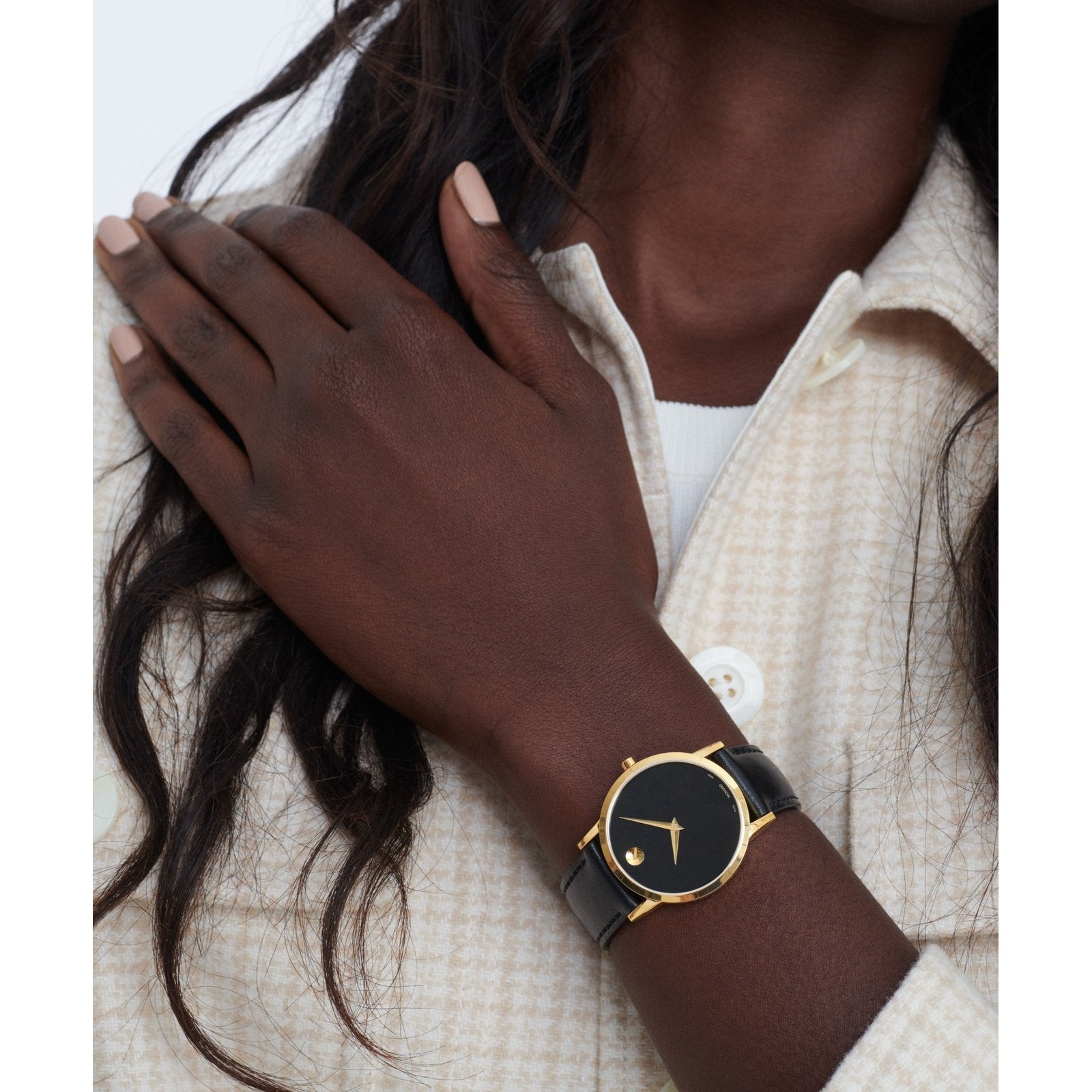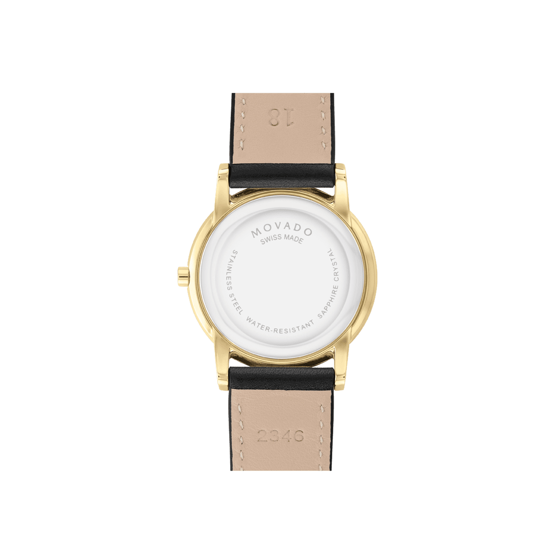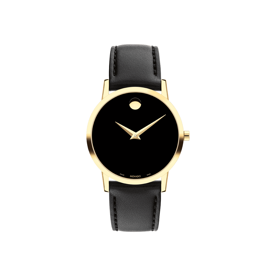Movado Museum Classic, 33mm yellow gold PVD-finished stainless steel case with black Museum dial on a black calfskin leather strap.