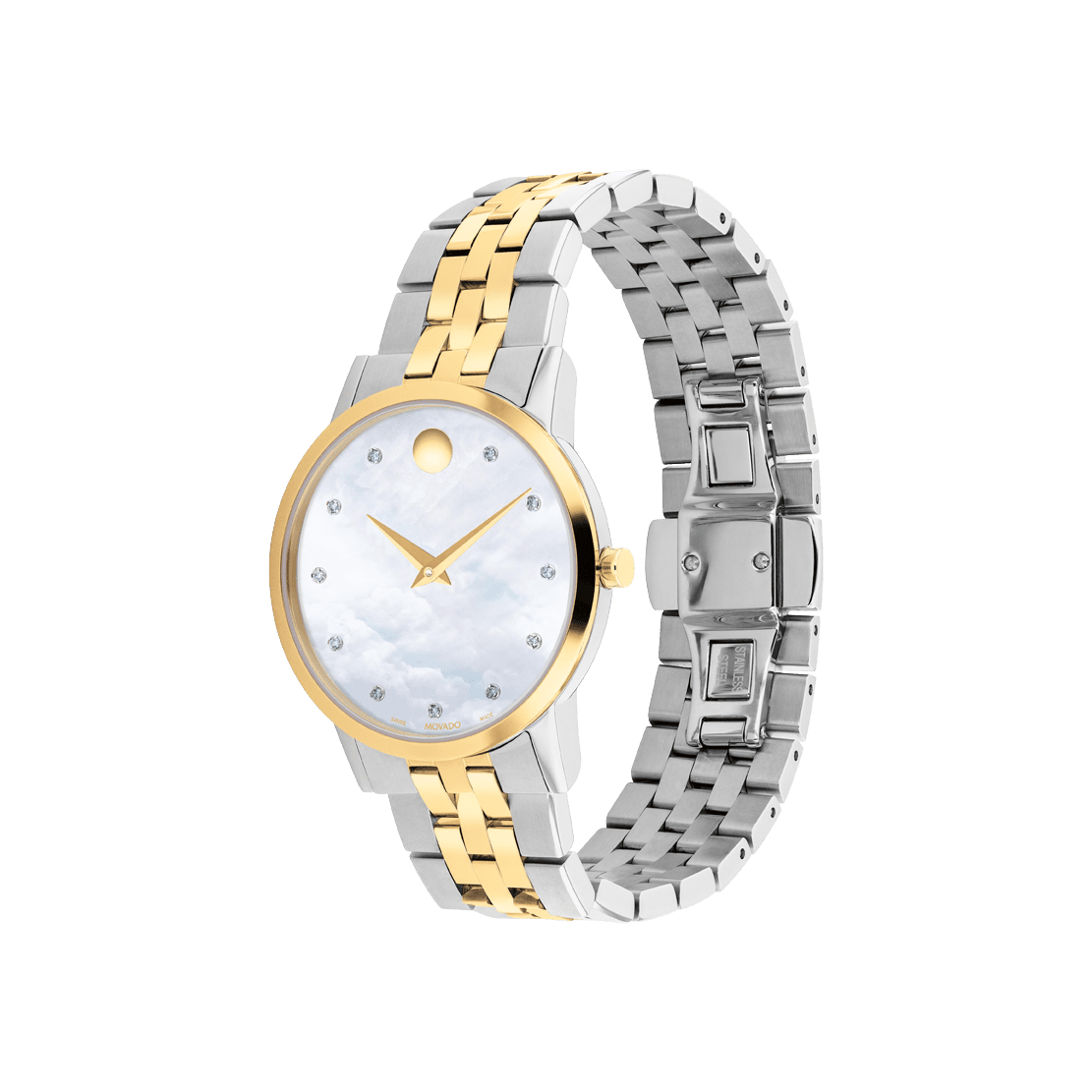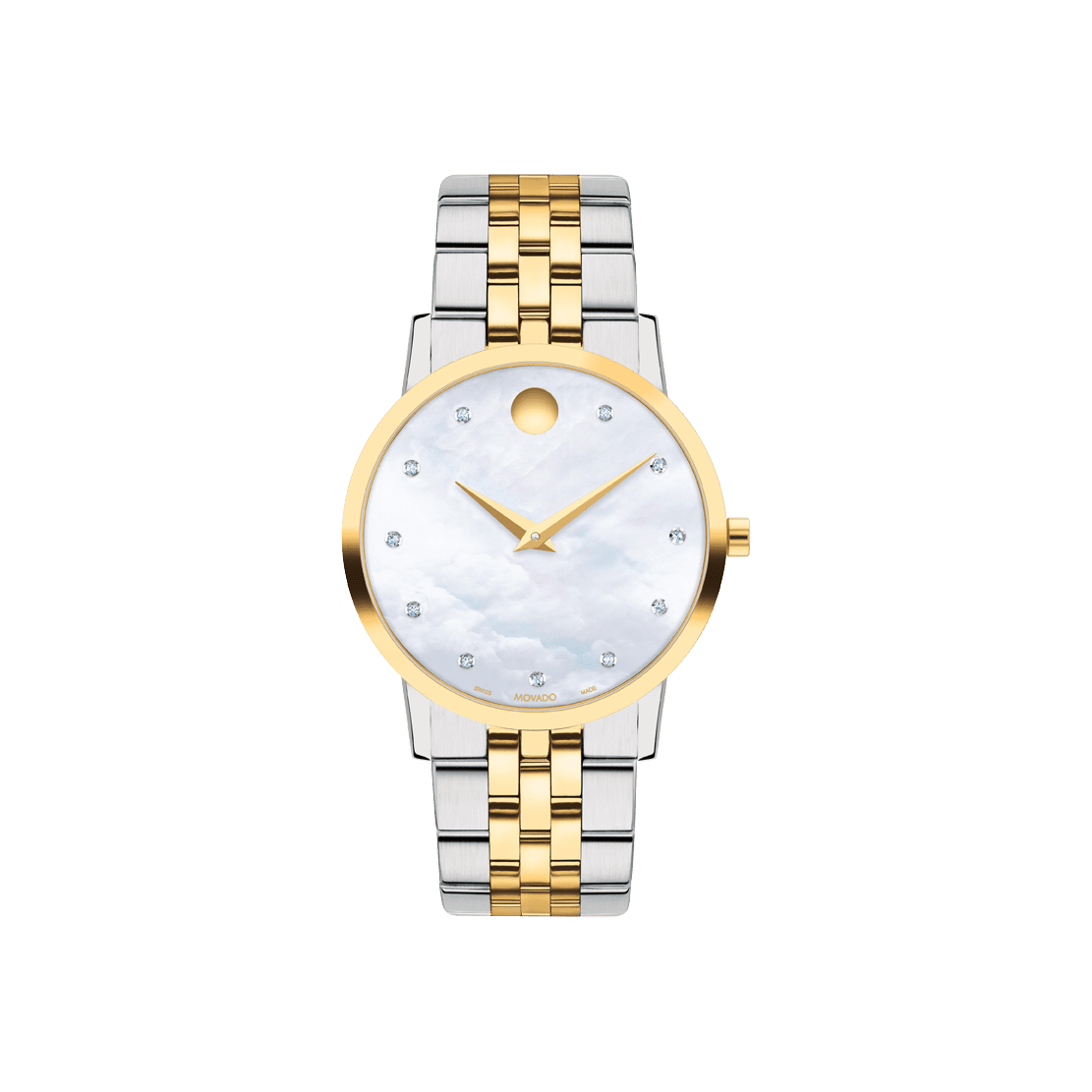It’s time you owned a masterpiece. The Movado Museum Classic is an icon of modern design, featured in museums worldwide and renown for the elegant simplicity of the dial defined by a single dot at 12 o’clock, a design element that symbolizes the sun at high noon. In this style, we’ve paired a 33mm case with a yellow gold PVD finish to a white mother-of-pearl dial, dazzling diamond hour markers and a two-tone bracelet of stainless steel and yellow gold PVD. The signature dot and slender hands are cast in yellow gold PVD for a flawless finish.