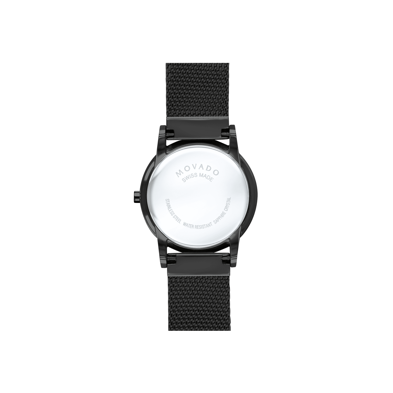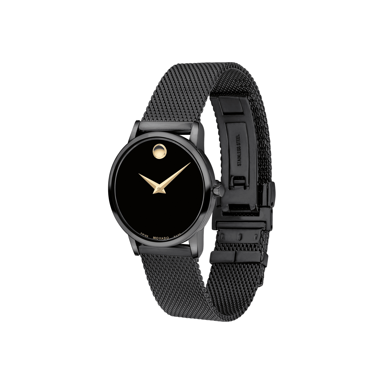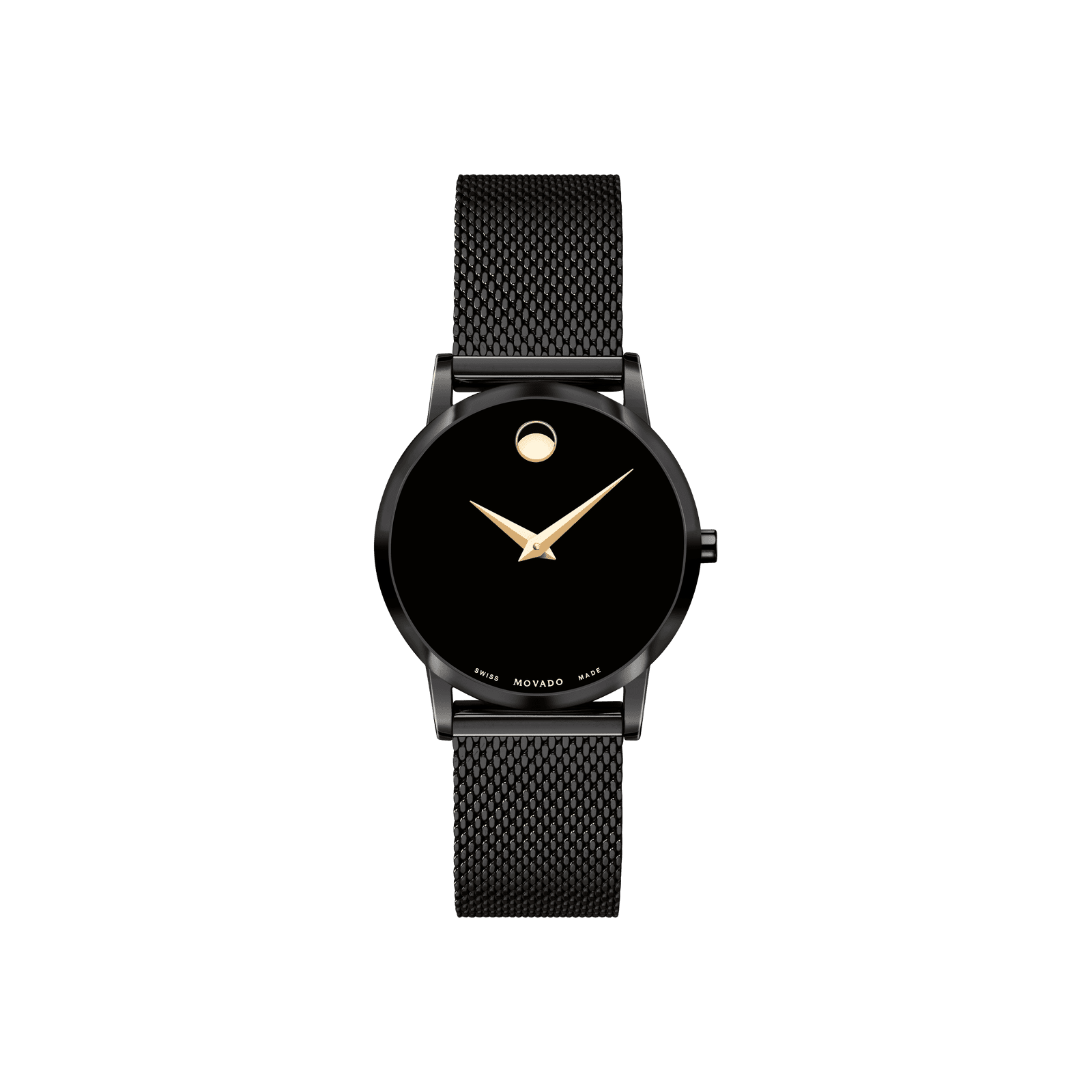 Movado Museum Classic, 28mm black PVD-finished stainless steel case and mesh bracelet with black-toned dial & yellow gold PVD-finished accents.