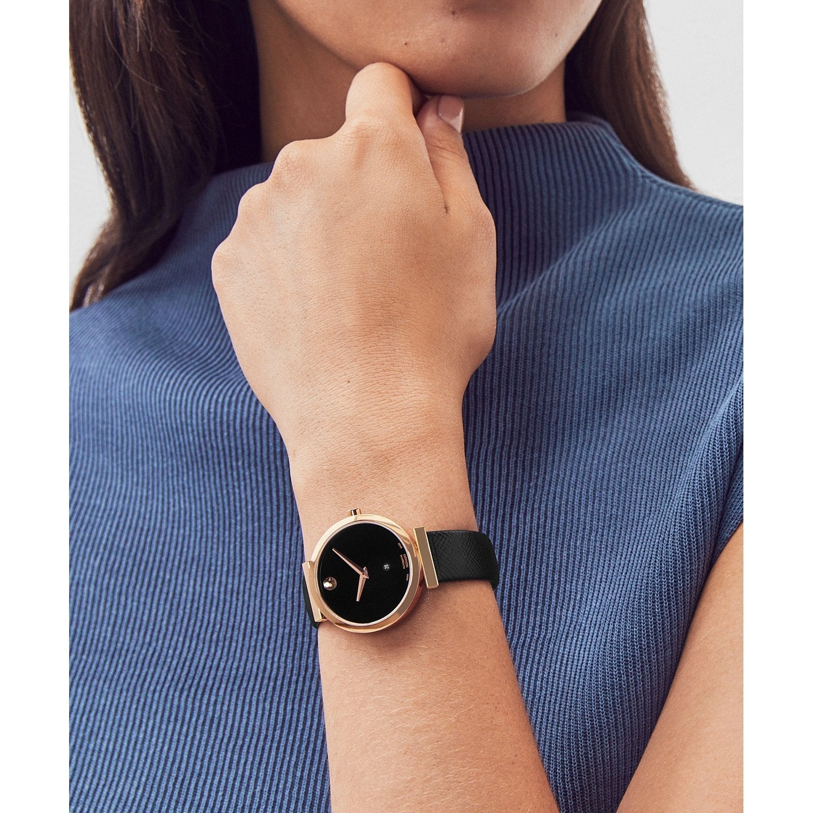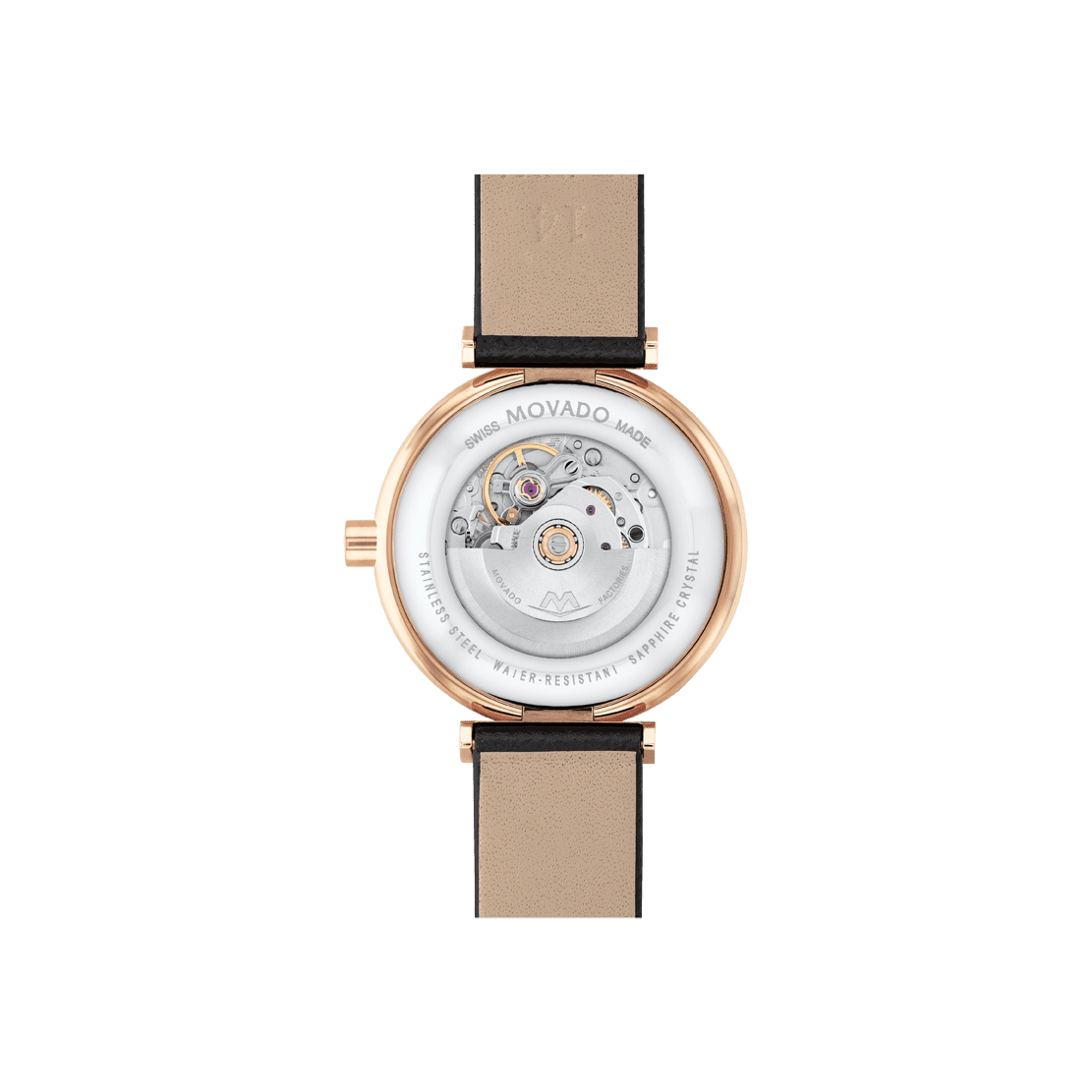 It’s time you owned a masterpiece. The Movado Museum Classic is an icon of modern design, featured in museums worldwide and renown for the elegant simplicity of the dial defined by a single dot at 12 o’clock, a design element that symbolizes the sun at high noon. We’ve elevated this iconic watch even further with an automatic movement powered by the motion of your body—the pinnacle of Swiss technical mastery and displayed in all its beauty with an exhibition caseback. In this style, we’ve paired a rich rose gold PVD 32mm case with a chic black dial—outfitted with our signature dot and slender hands—and a luxurious saffiano leather strap.