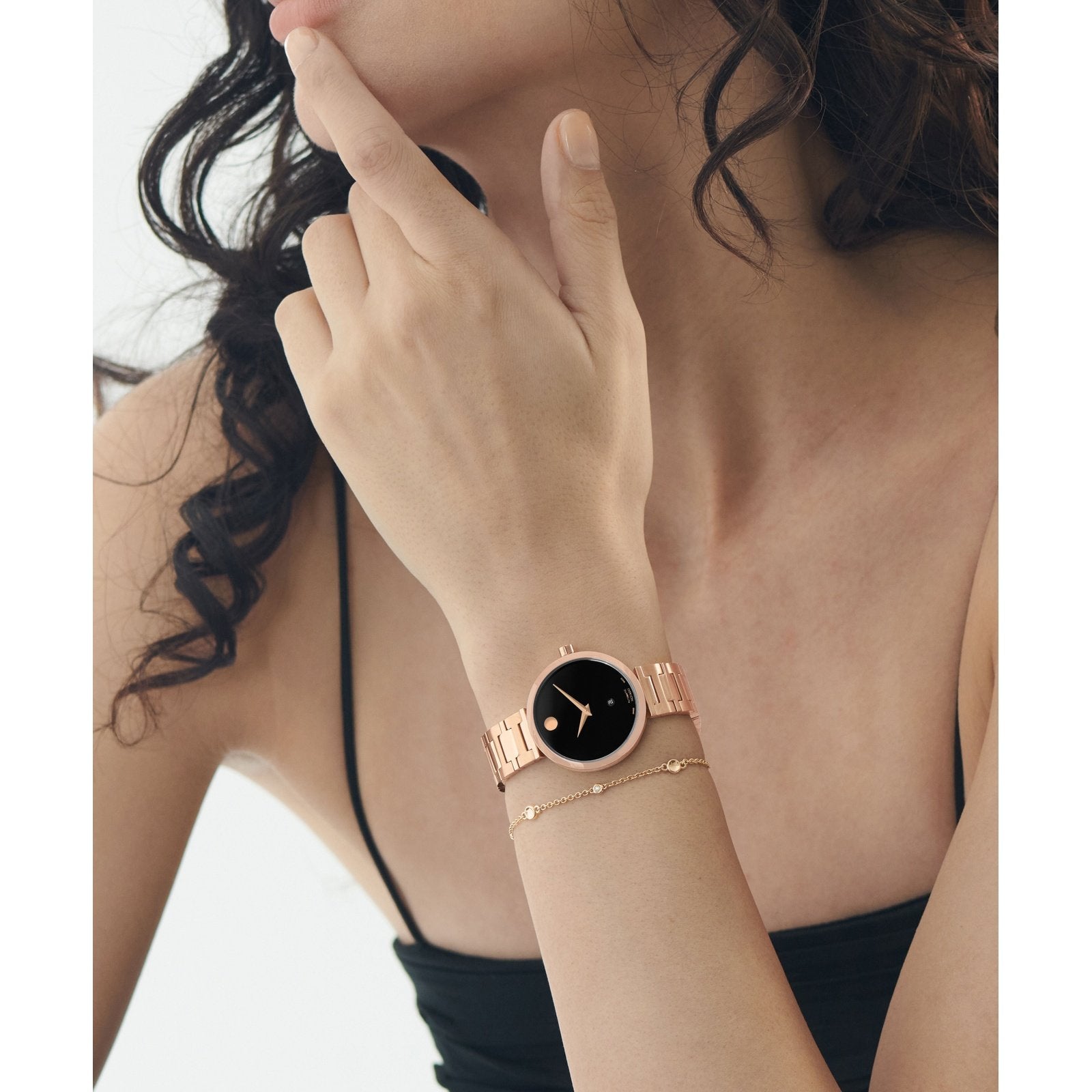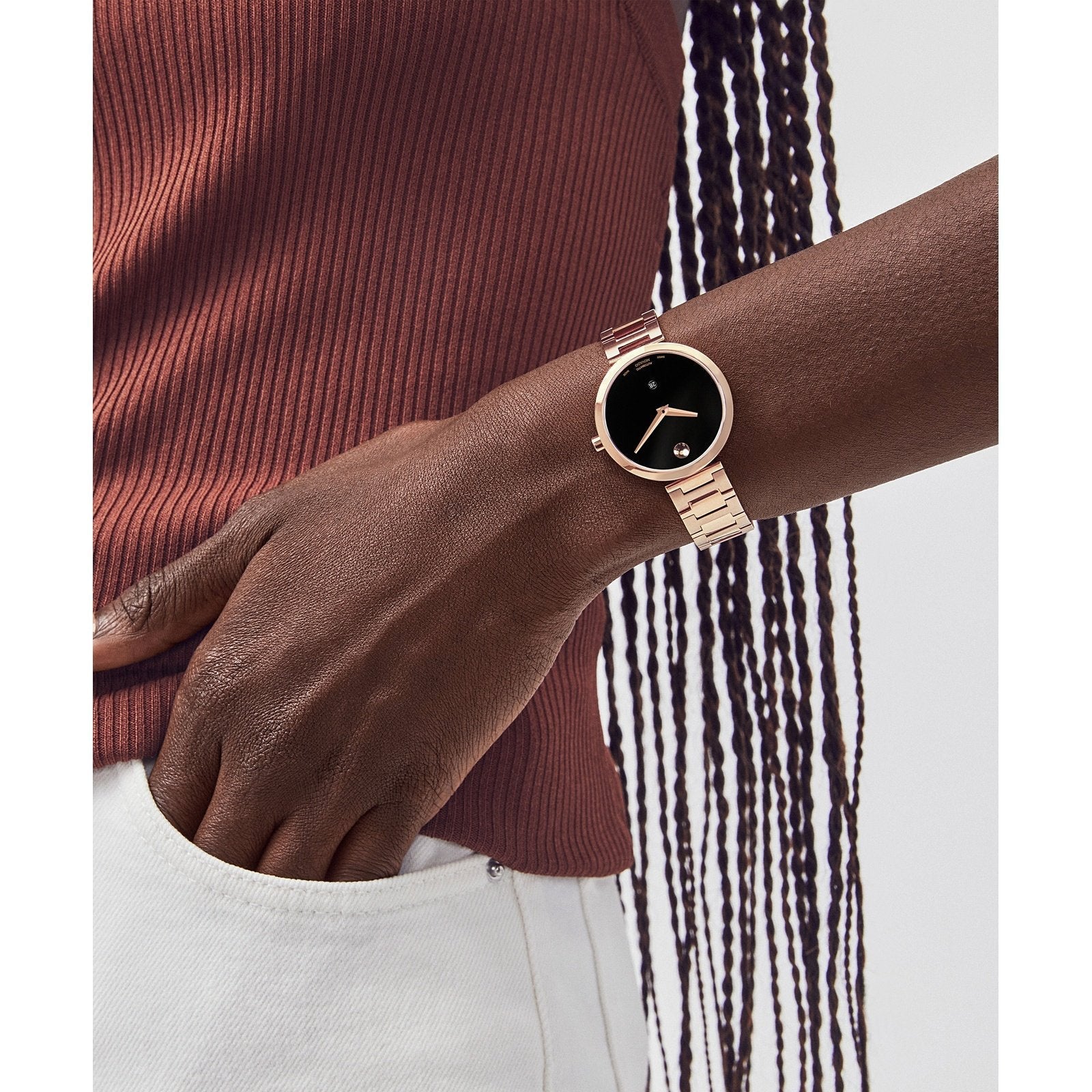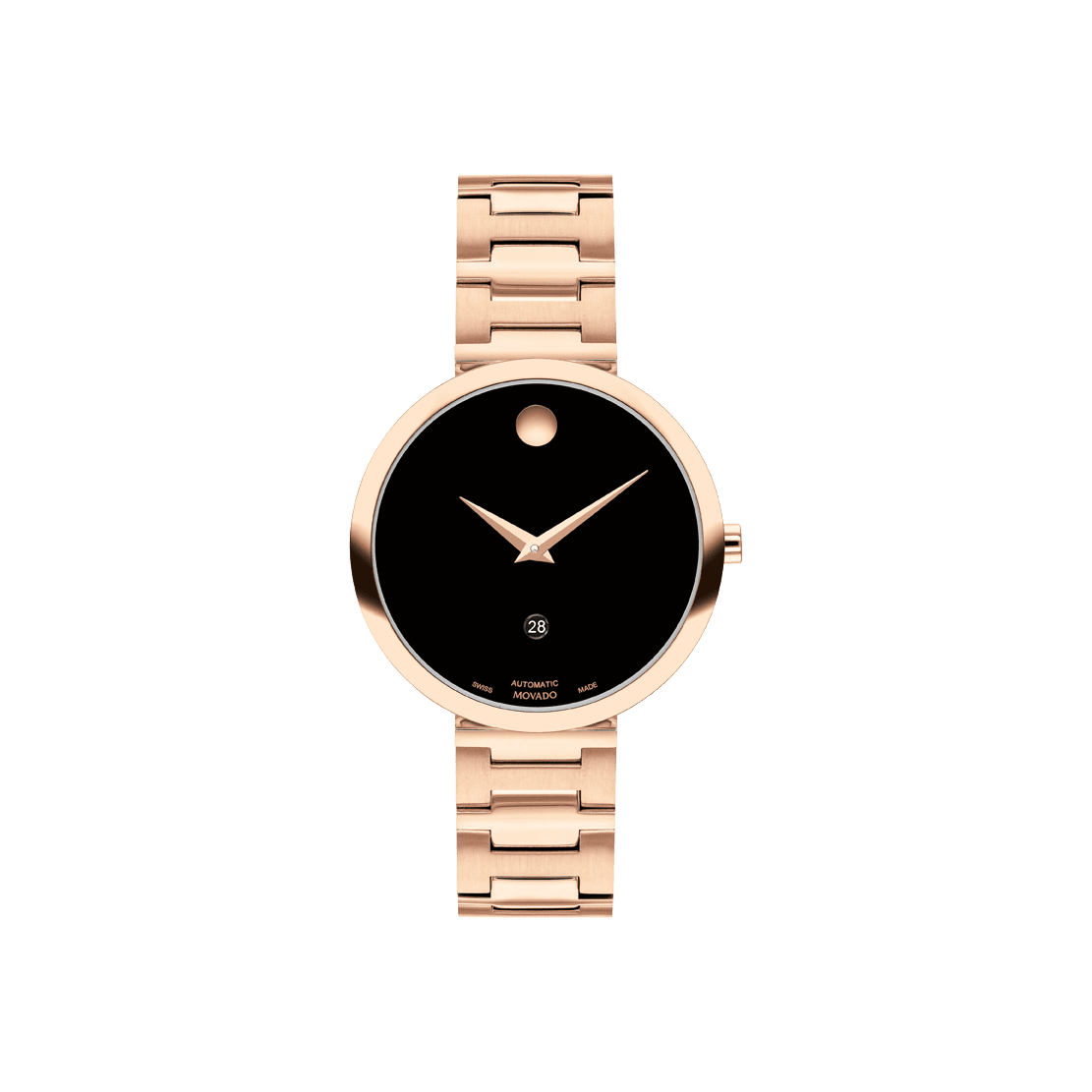 It’s time you owned a masterpiece. The Movado Museum Classic is an icon of modern design, featured in museums worldwide and renown for the elegant simplicity of the dial defined by a single dot at 12 o’clock, a design element that symbolizes the sun at high noon. We’ve elevated this iconic watch even further with an automatic movement powered by the motion of your body—the pinnacle of Swiss technical mastery and displayed in all its beauty with an exhibition caseback. In this style, we’ve paired a chic black dial—outfitted with our signature dot and slender hands—with a classic 32mm case and a sinuous H-link bracelet, all in rich rose gold PVD.