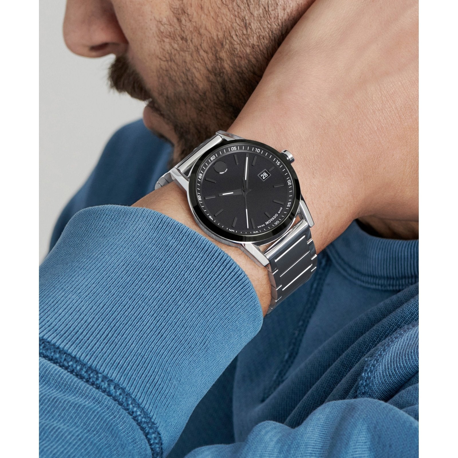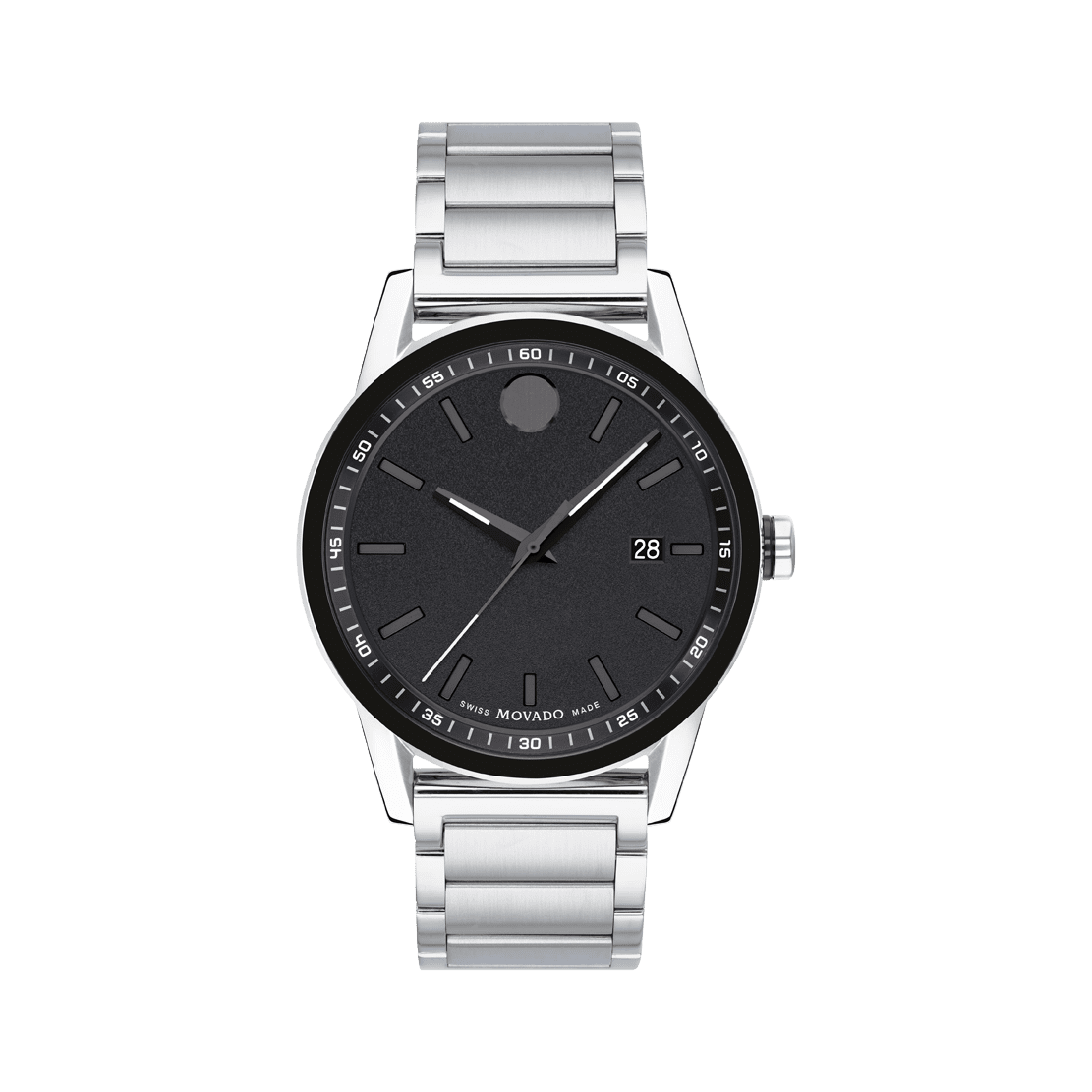 Go to the shopMovado Museum Sport, 42 mm stainless steel case with black PVD-finished bezel. Features a black dial and stainless steel bracelet.