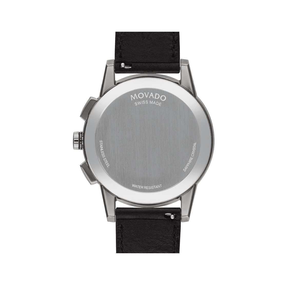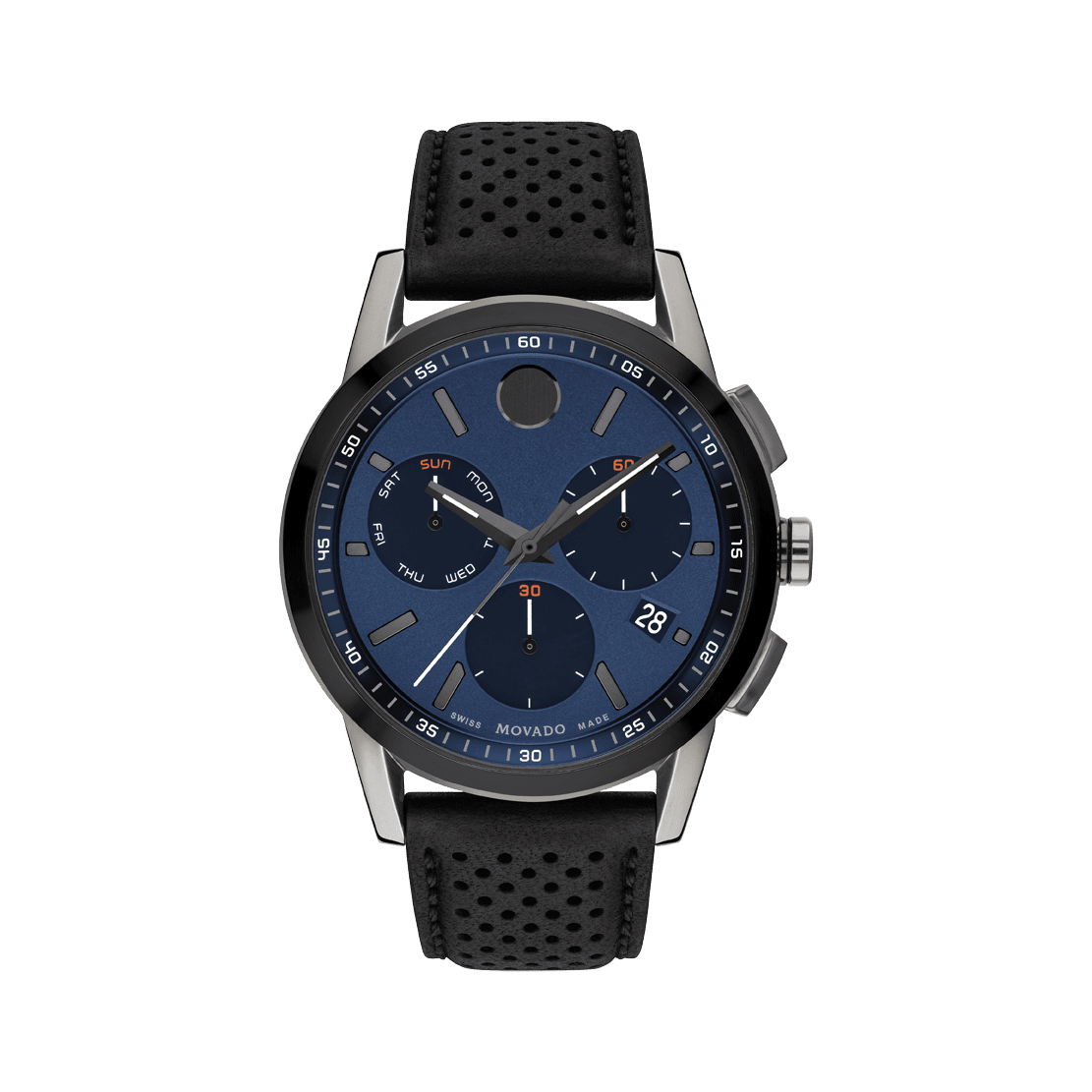Go to the shopMovado Museum Sport Chronograph, 43 mm gunmetal PVD-finished stainless steel case with black PVD-finished bezel. Features a blue chronograph dial and black perforated leather strap.