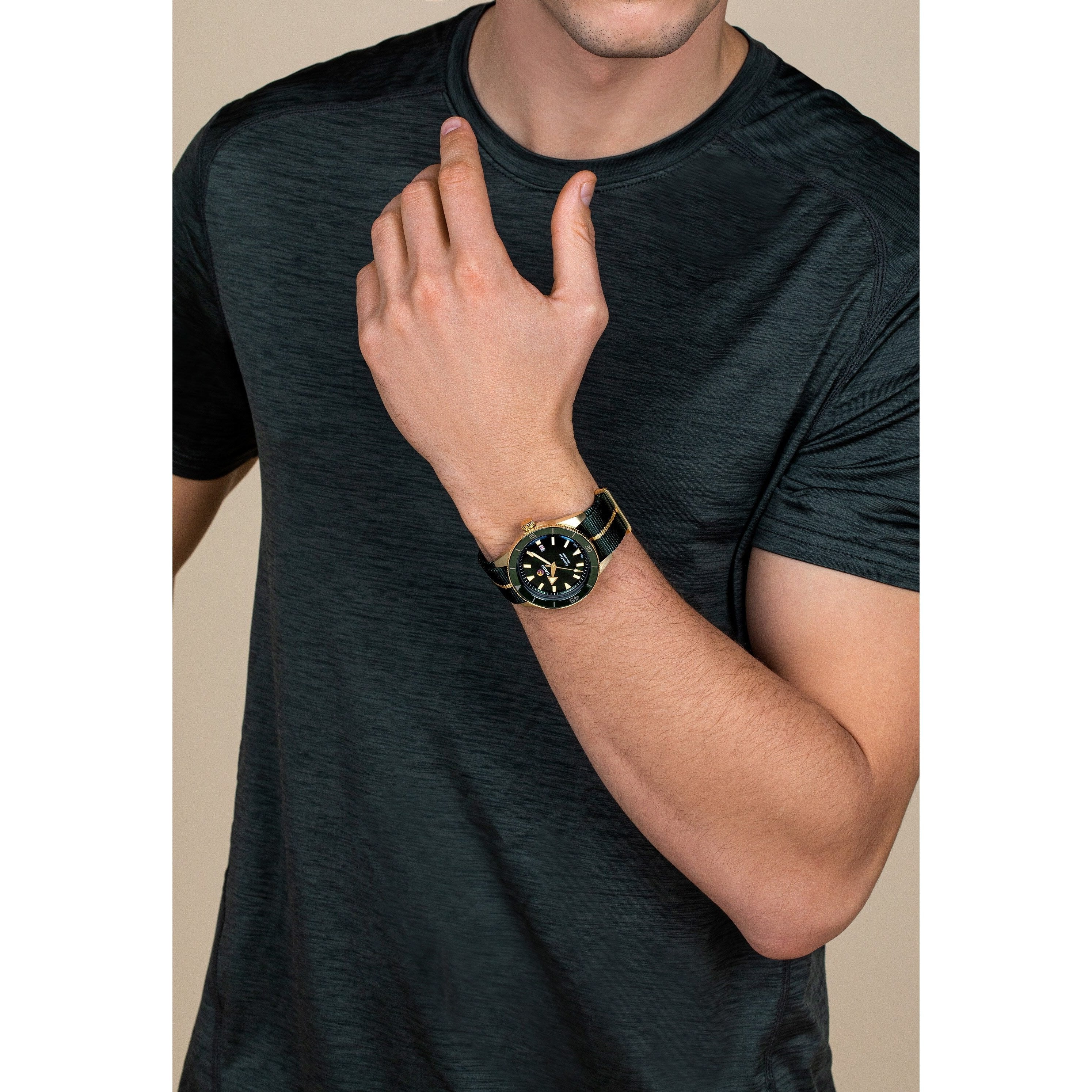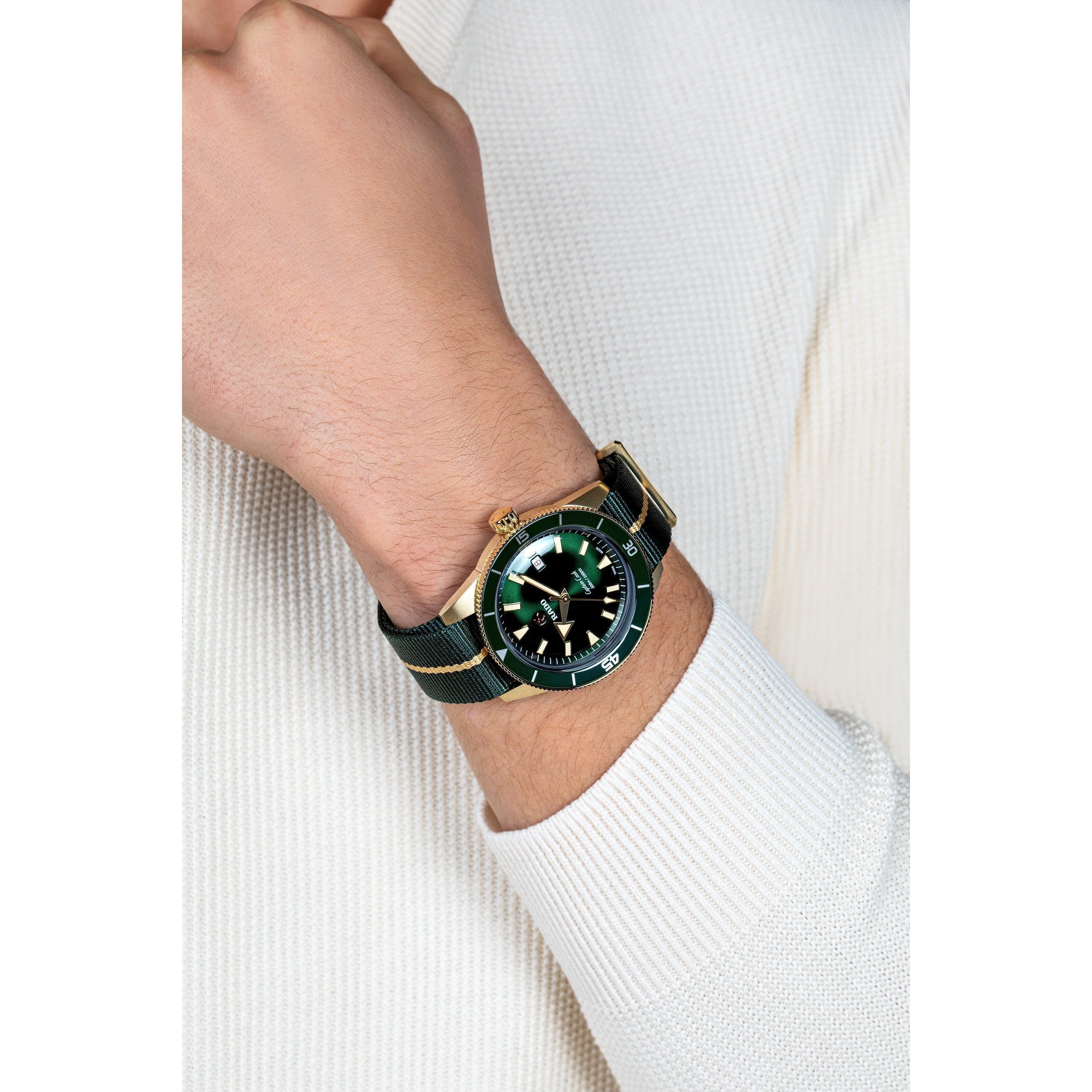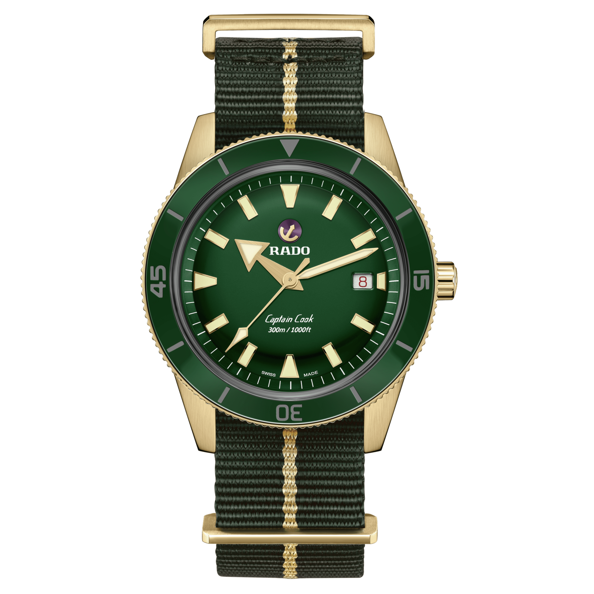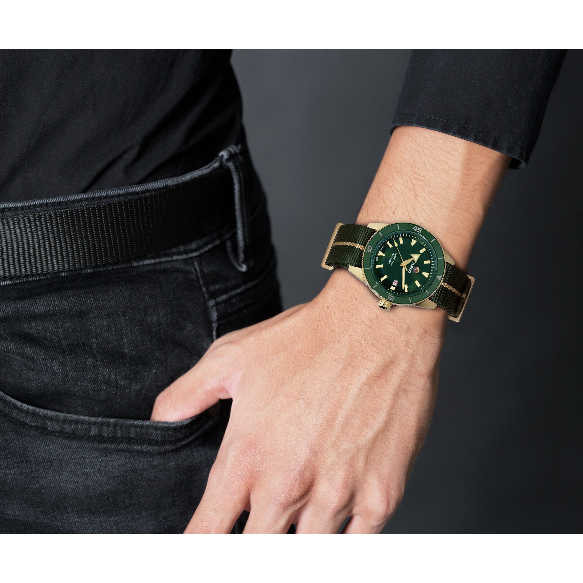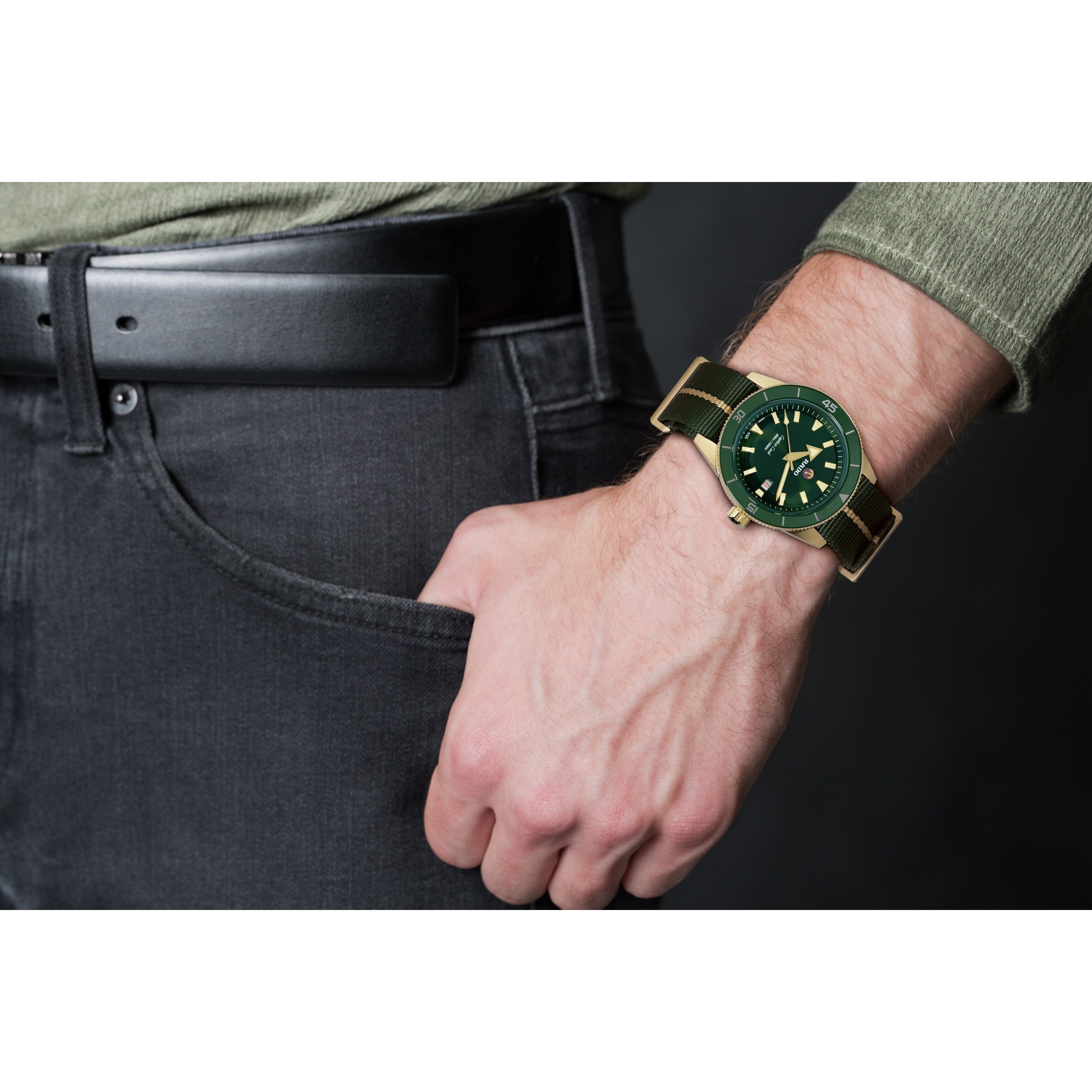 An original look from 1962 is brought to life in a new and improved form for the twenty-first century. With vintage details and styling true to the original, and up-to-date features that make it a match for modern wearers, Captain Cook is a watch designed to stand the test of time. This model features a bronze case as well as a NATO strap made from durable synthetic fabric for a perfect combination of ancient and modern materials.