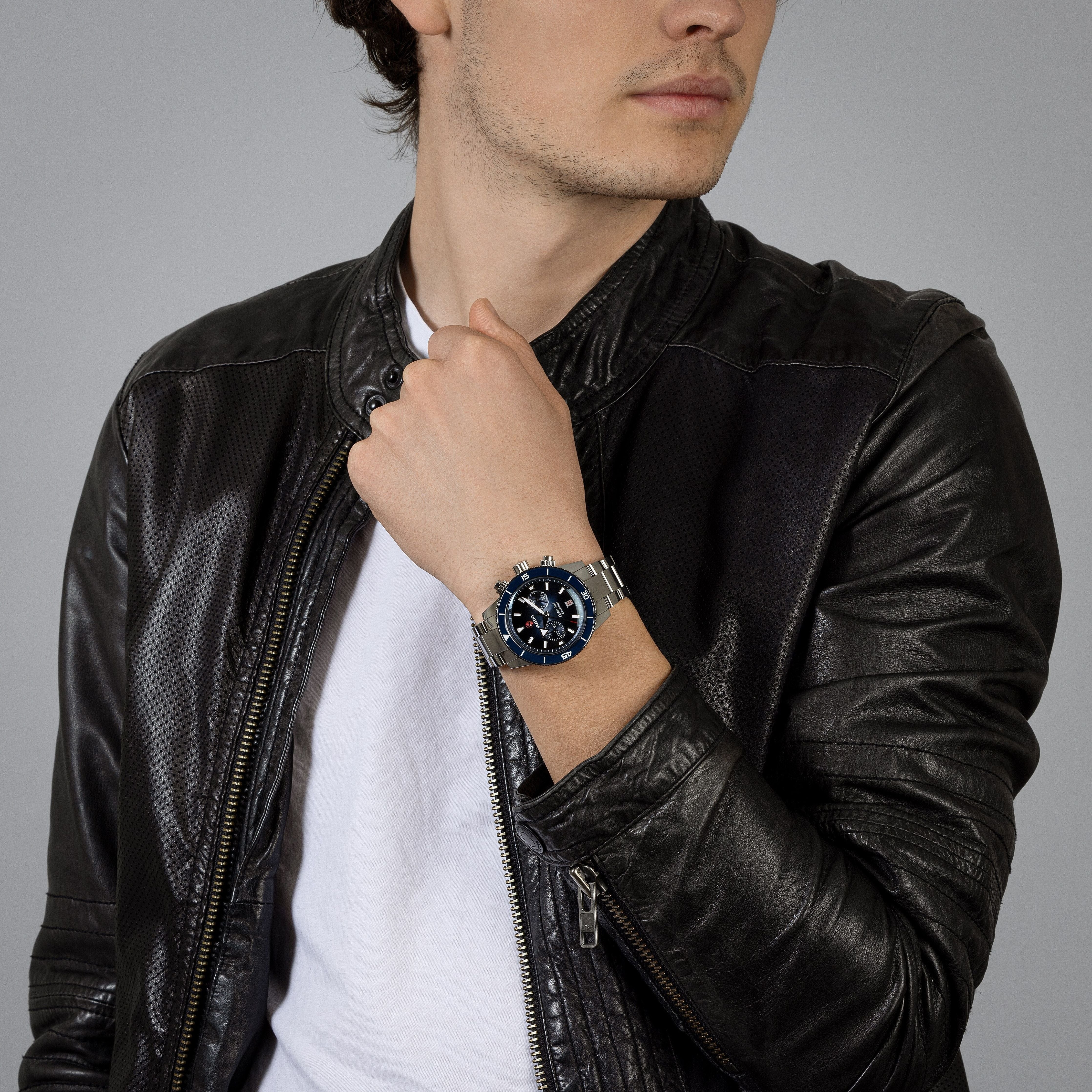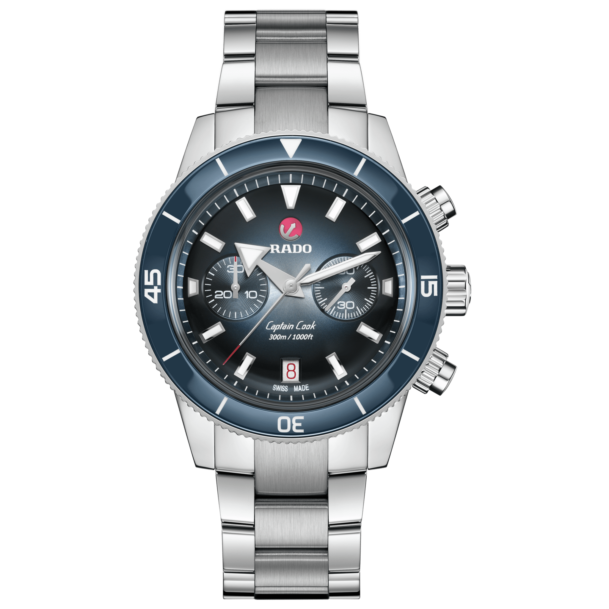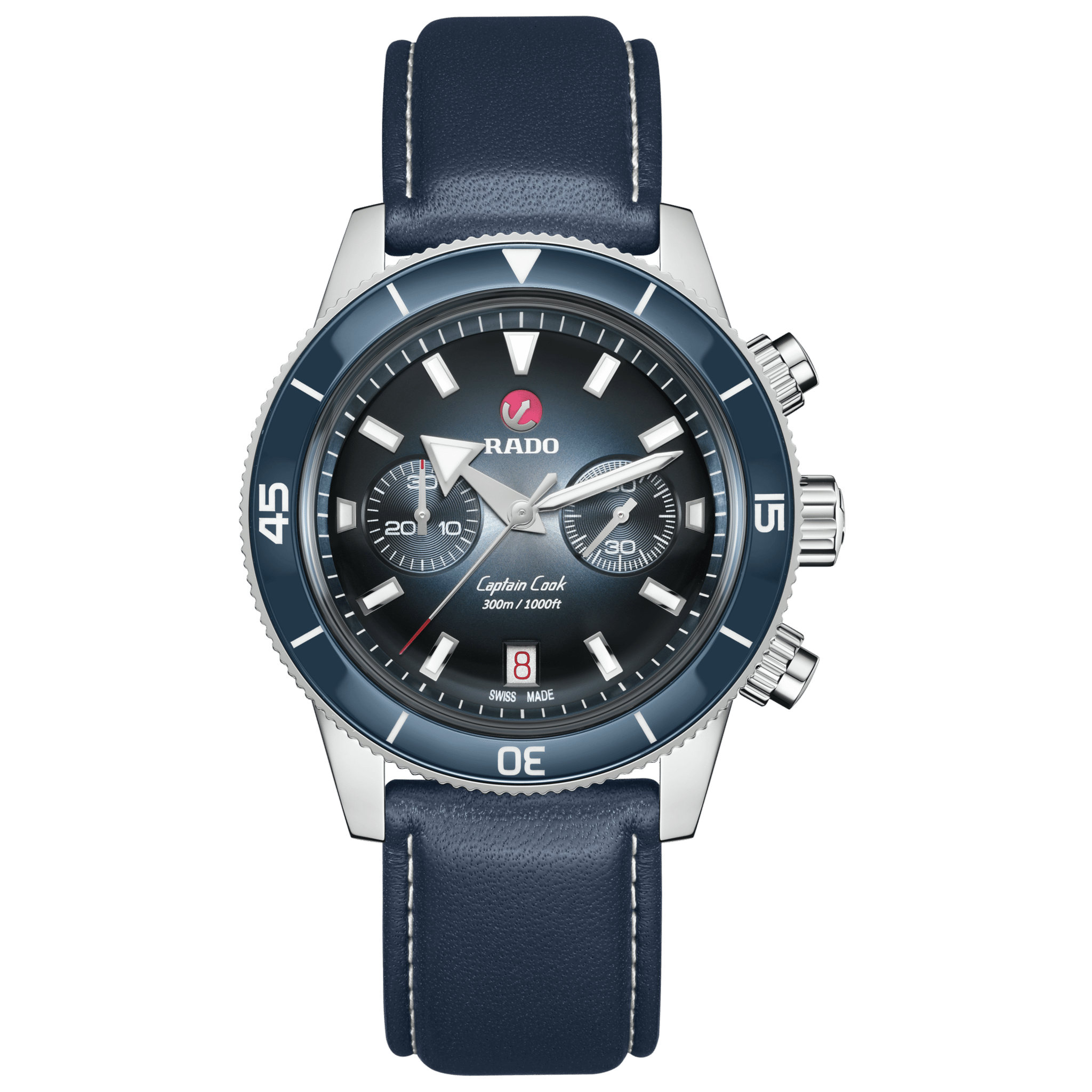 The Captain Cook Chronograph wears a characteristic box-shaped, scratch-resistant sapphire crystal with anti-reflective treatment on both faces. The thin, stylish 43 mm stainless steel case features a polished blue high-tech ceramic inlay on the bezel, complementing the silver-to-blue gradient dial. The numbers, markers and triangles are treated with Super-LumiNova®. Inside, the new, thinner R801 automatic movement, with 37 jewels, five hands and 59 hours of power reserve thanks to an antimagnetic Nivachron™ hairspring, exceeds standard test requirements from 3 to 5 positions for higher accuracy. The model comes with a polished and brushed stainless steel bracelet, as well as a blue leather strap and an additional fabric strap in deep blue.