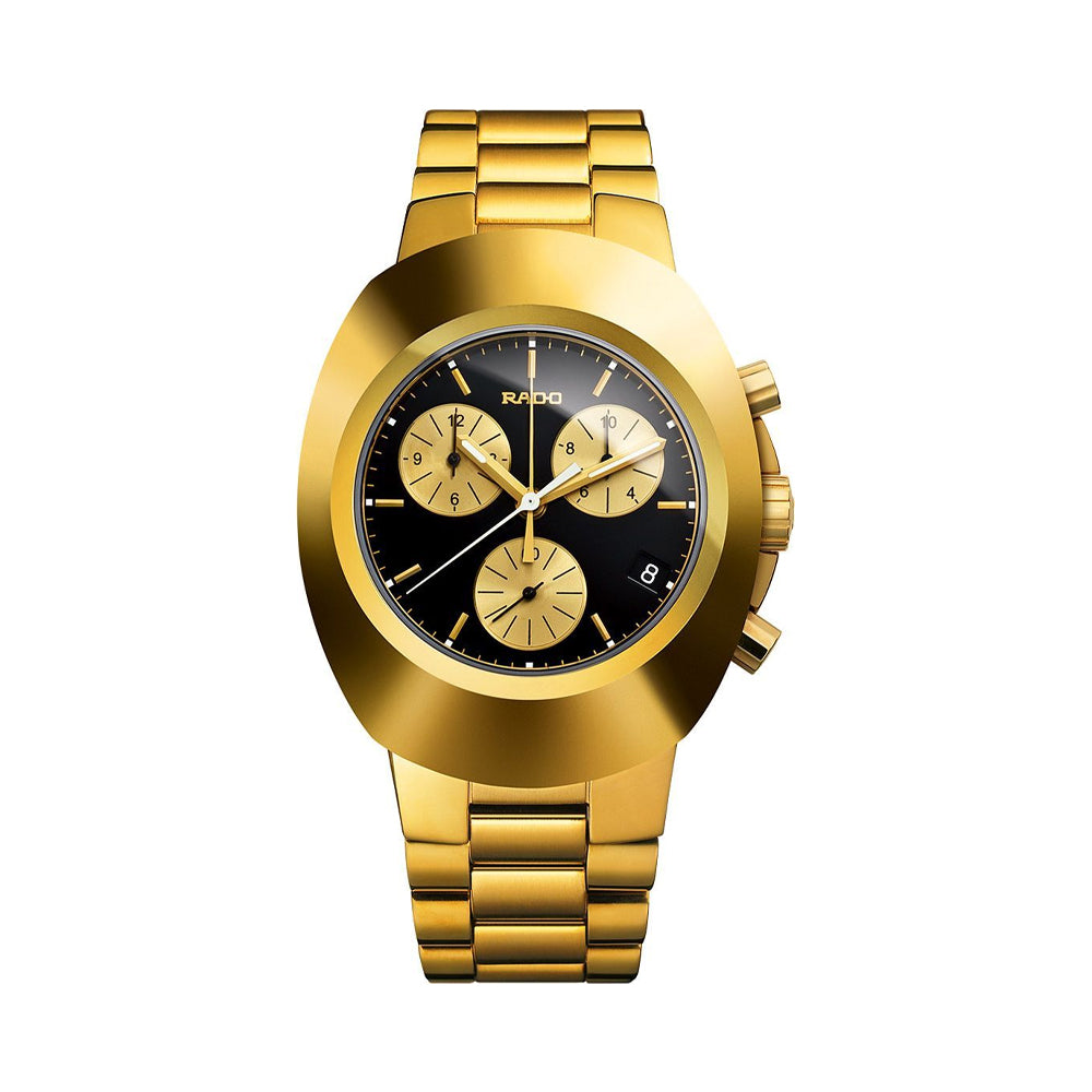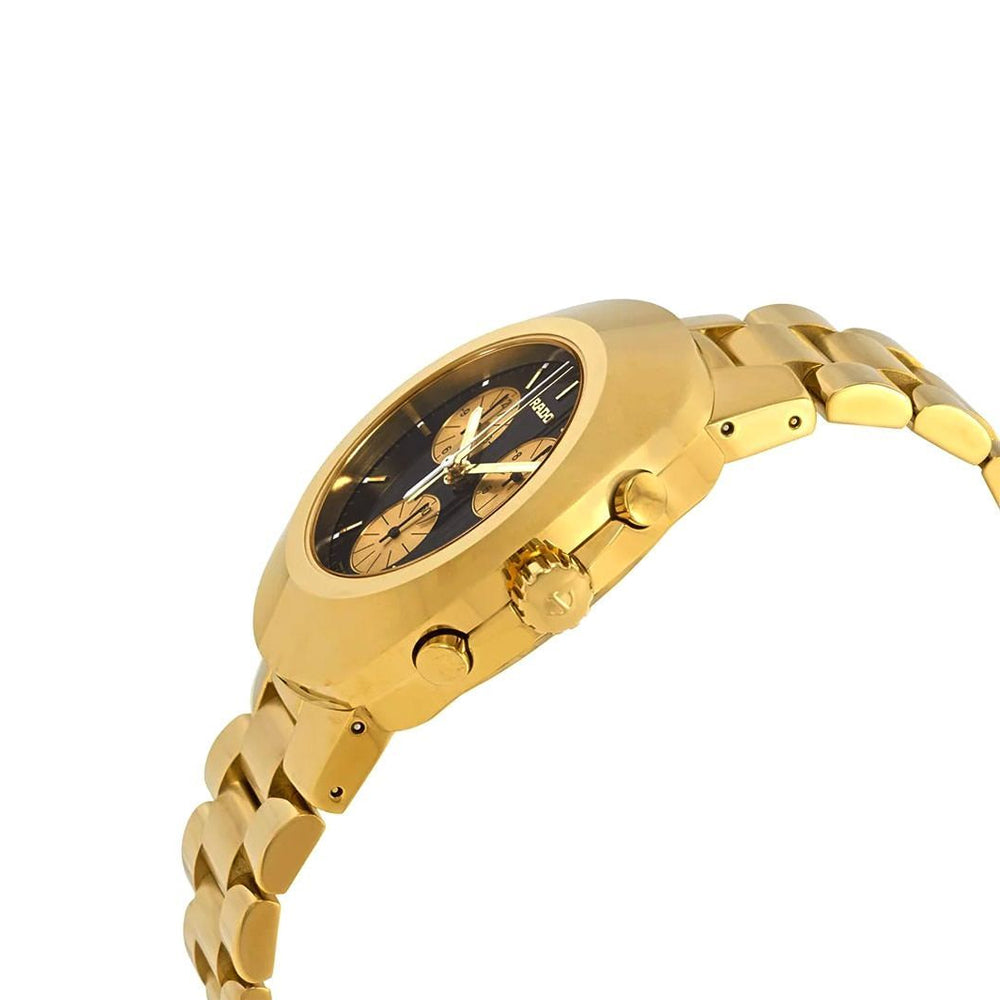 A bold design from the Original collection for men, the watch has a large circular black dial, enclosed within a yellow gold tone PVD coated stainless steel case. Gold toned stick hour indices and watch hands contrast against the muted brilliance of the dial. Luminescent markers enable the time to...