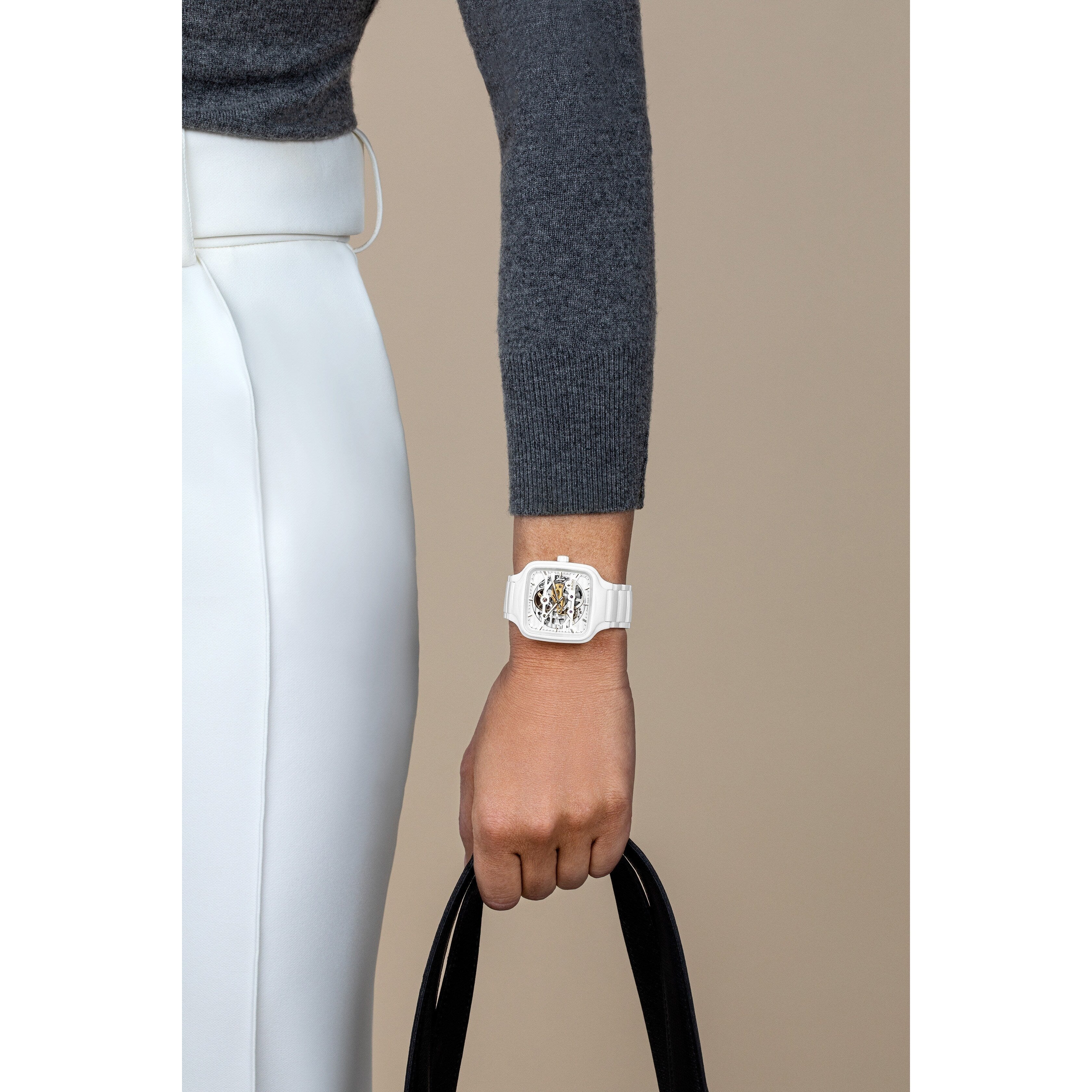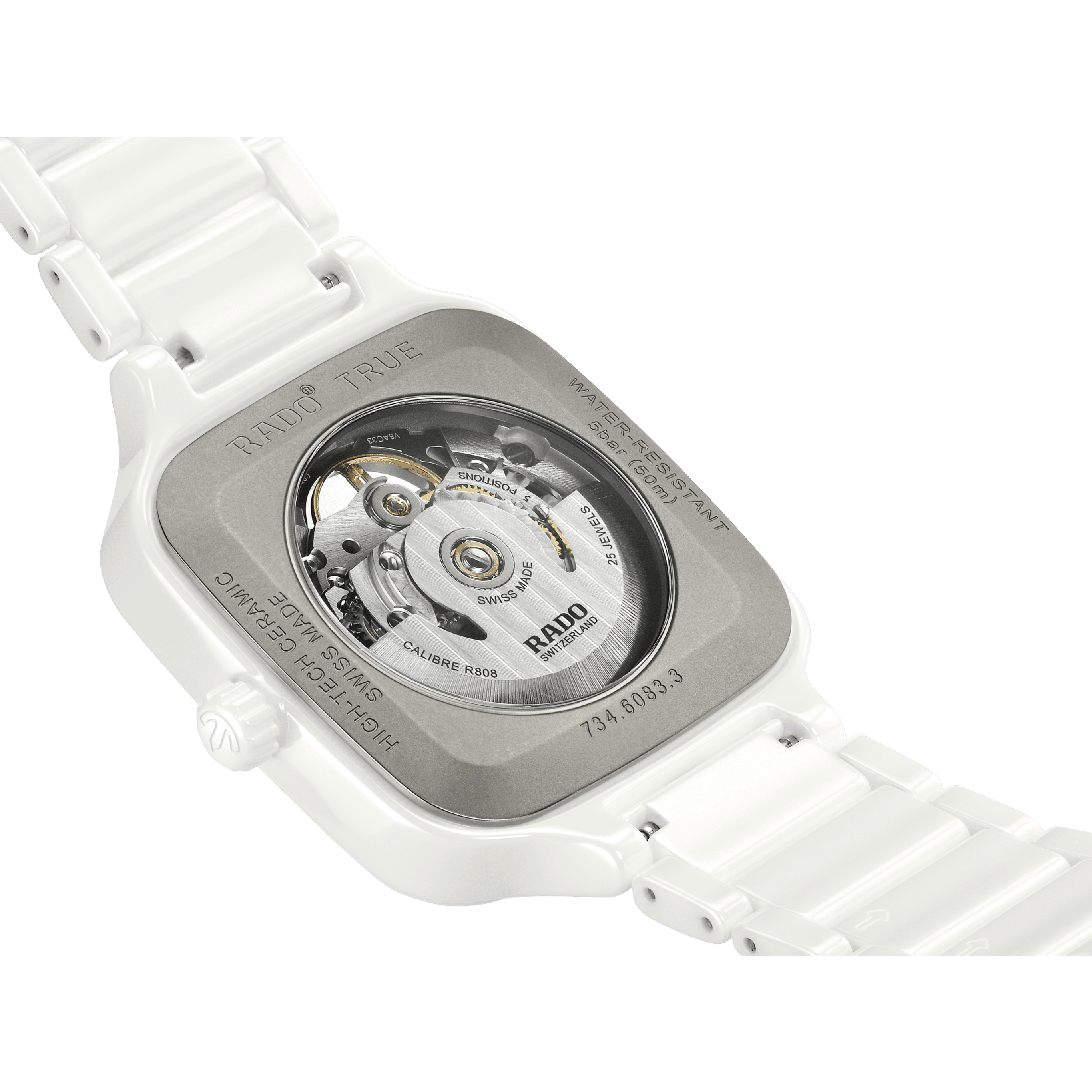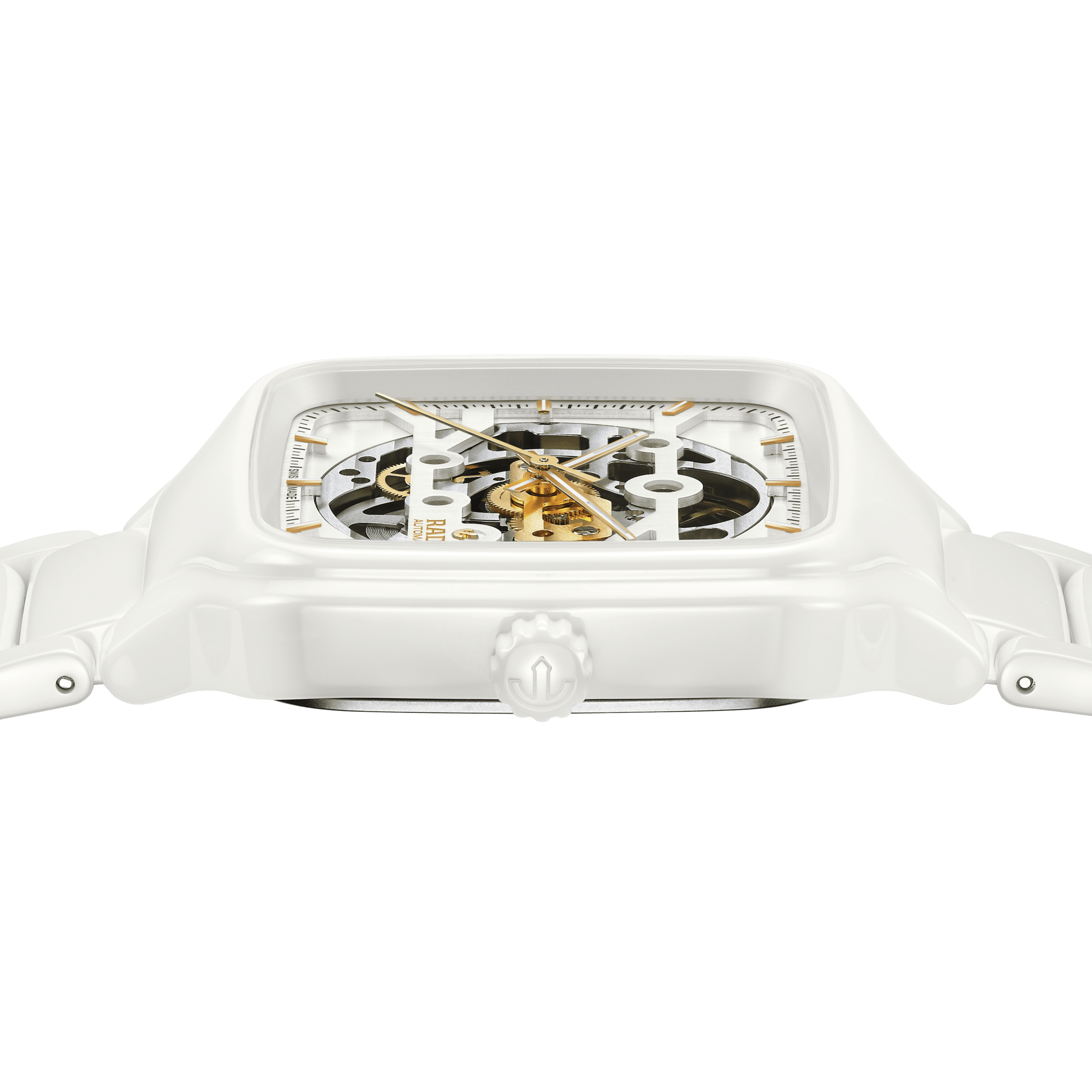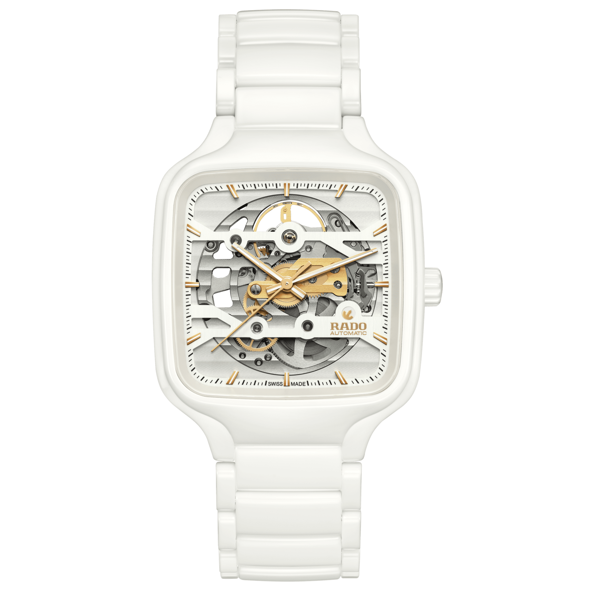 The new True Square Skeleton adds another highlight to the popular Rado True Square collection. What catches the eye is the R808 skeletonised movement and the two-level dial, which goes in continuity with the movement. This state-of-the-art calibre delivers outstanding precision combined with enhanced resistance to magnetic fields and variations in temperature, and has a power reserve of 80 hours. The yellow gold coloured bridge and nickel coloured top plate match perfectly with the white vertical brushed background. With the 38mm monobloc case and the bracelet made of white polished high-tech ceramic, the True Square Skeleton presents characteristic Rado features in a fascinating form.