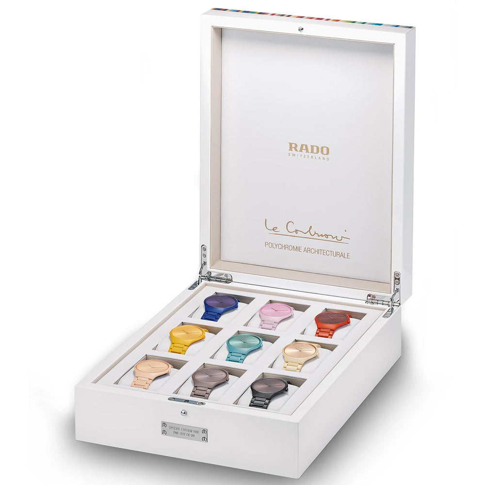 Rado Limited Edition of 999 Pieces. Rado Watch True Thinline Les Couleurs Full Collection Box Limited Edition R27999602. The watches from the True Thinline Les CouleursTM Le Corbusier collection are light, slim, scratch resistant, hypoallergenic and bursting with vivid and vibrant colour energy. Delivered in a special presentation box featuring all...