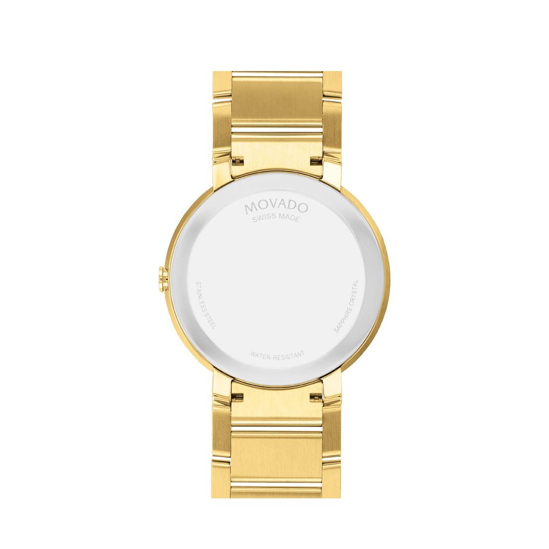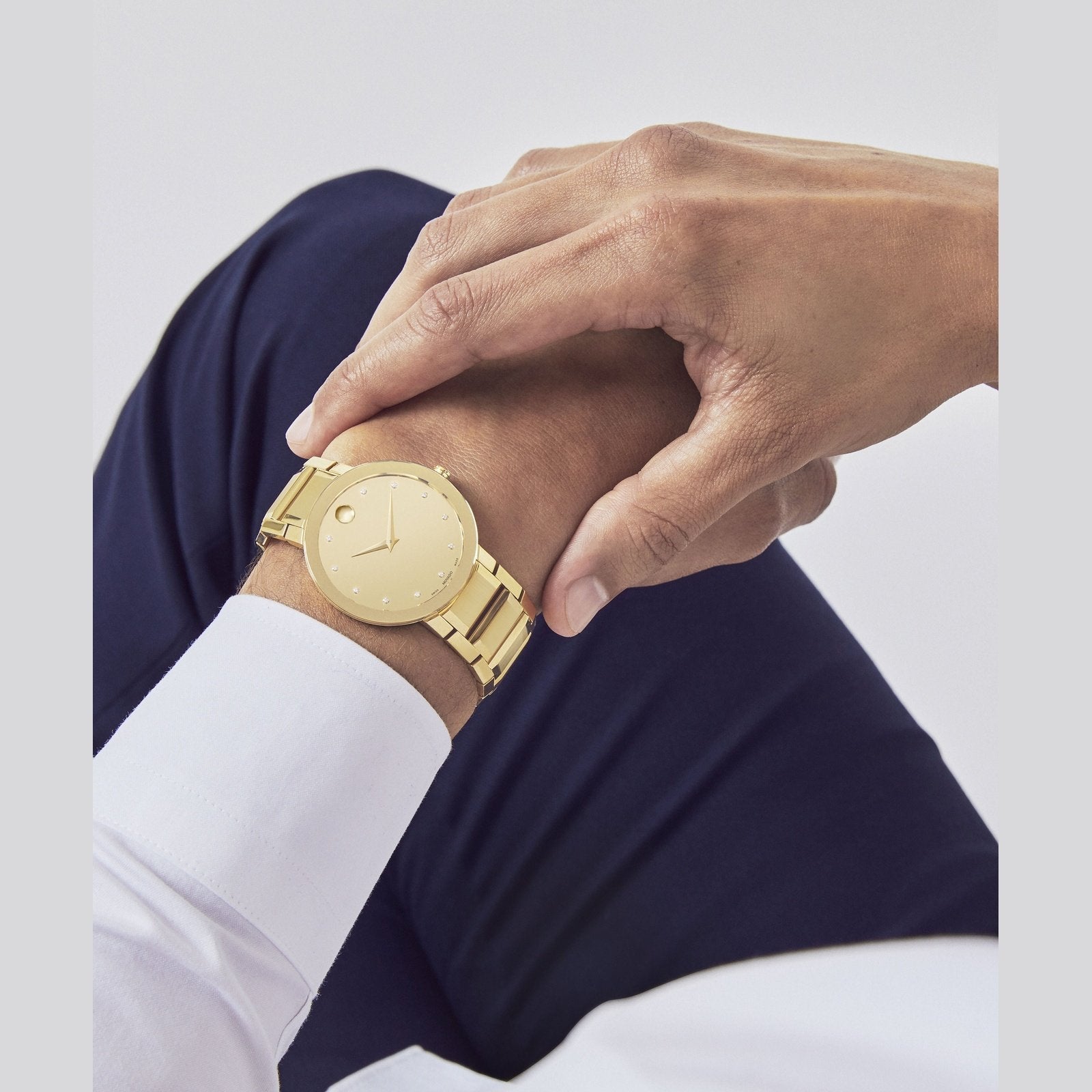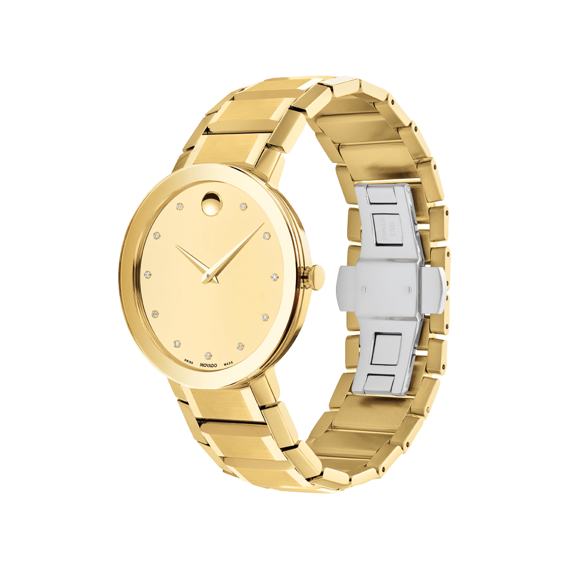 Movado Sapphire, 39mm yellow gold PVD-finished stainless steel bezel-free case with flat edge-to-edge sapphire crystal. Features a yellow gold PVD-finished stainless steel bracelet with a yellow gold-toned mirror dial and 11 diamond markers.
