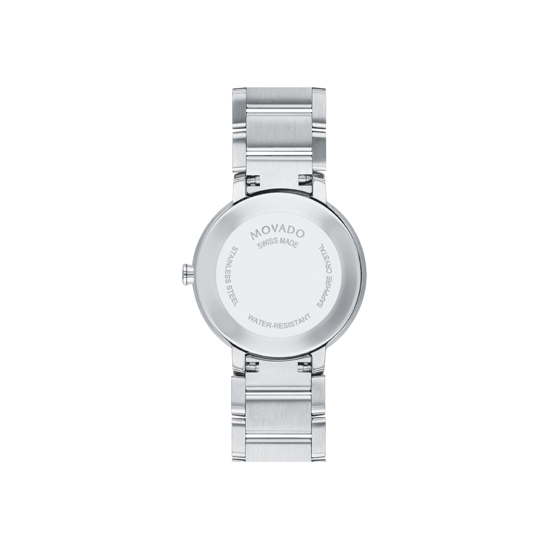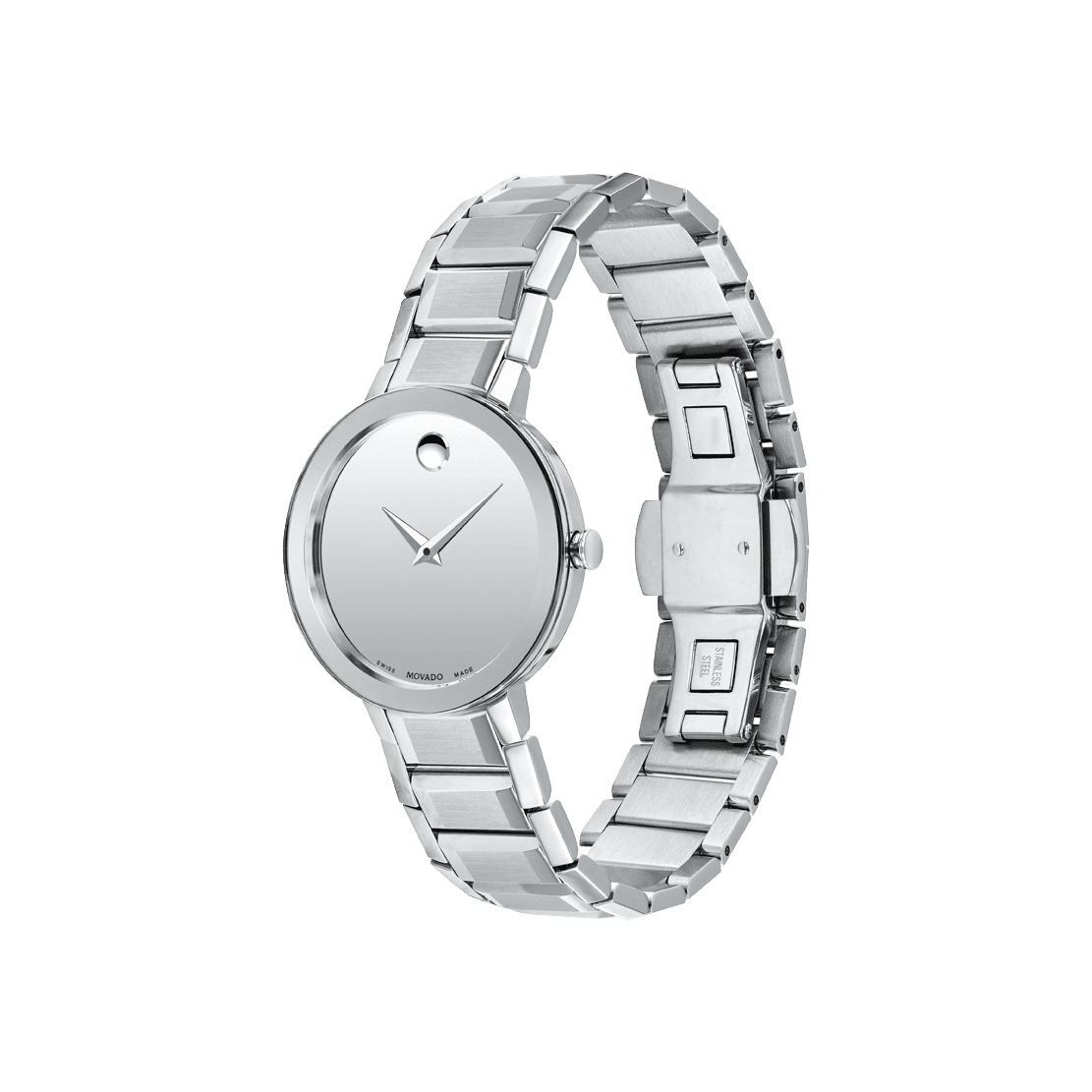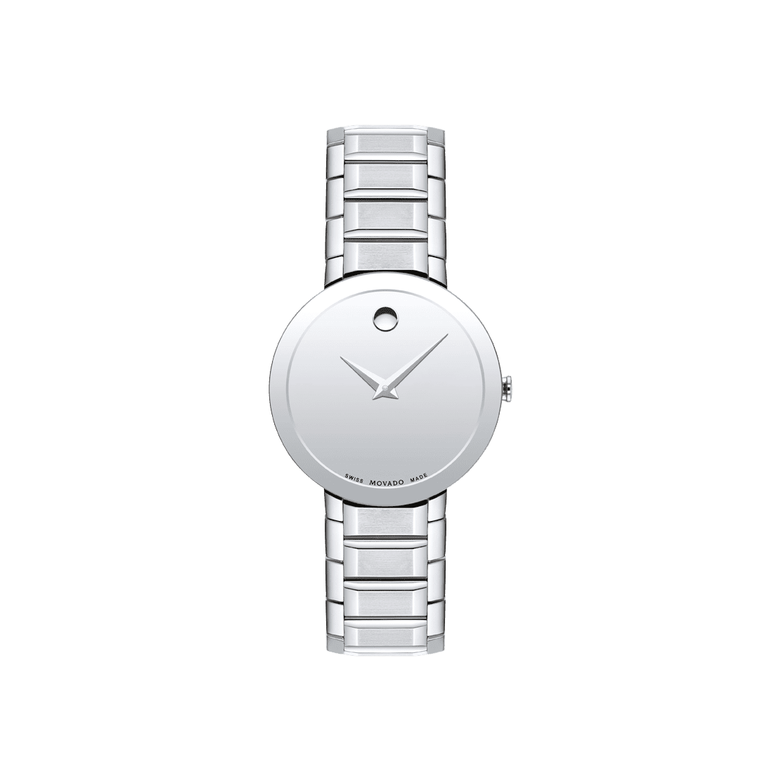 Go to the shopMovado Sapphire, 28 mm stainless steel bezel-free case with flat edge-to-edge sapphire crystal. Features a stainless steel bracelet with silver mirror dial.