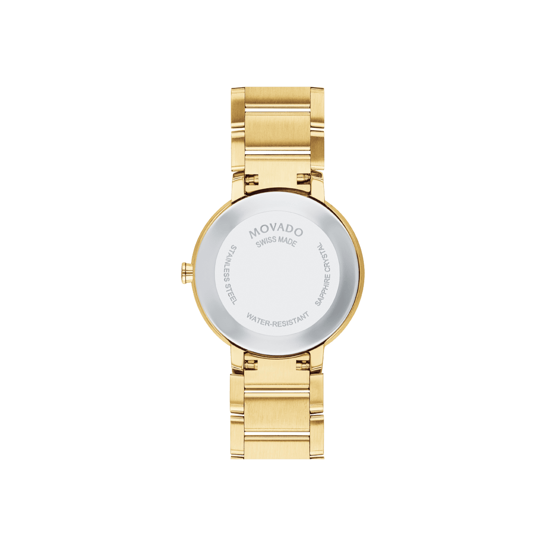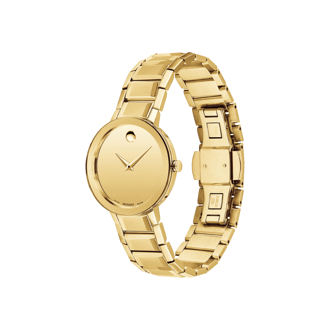 Movado Sapphire, 28 mm yellow gold PVD-finished stainless steel bezel-free case with flat edge-to-edge sapphire crystal. Features a yellow gold PVD-finished bracelet with yellow gold mirror dial.