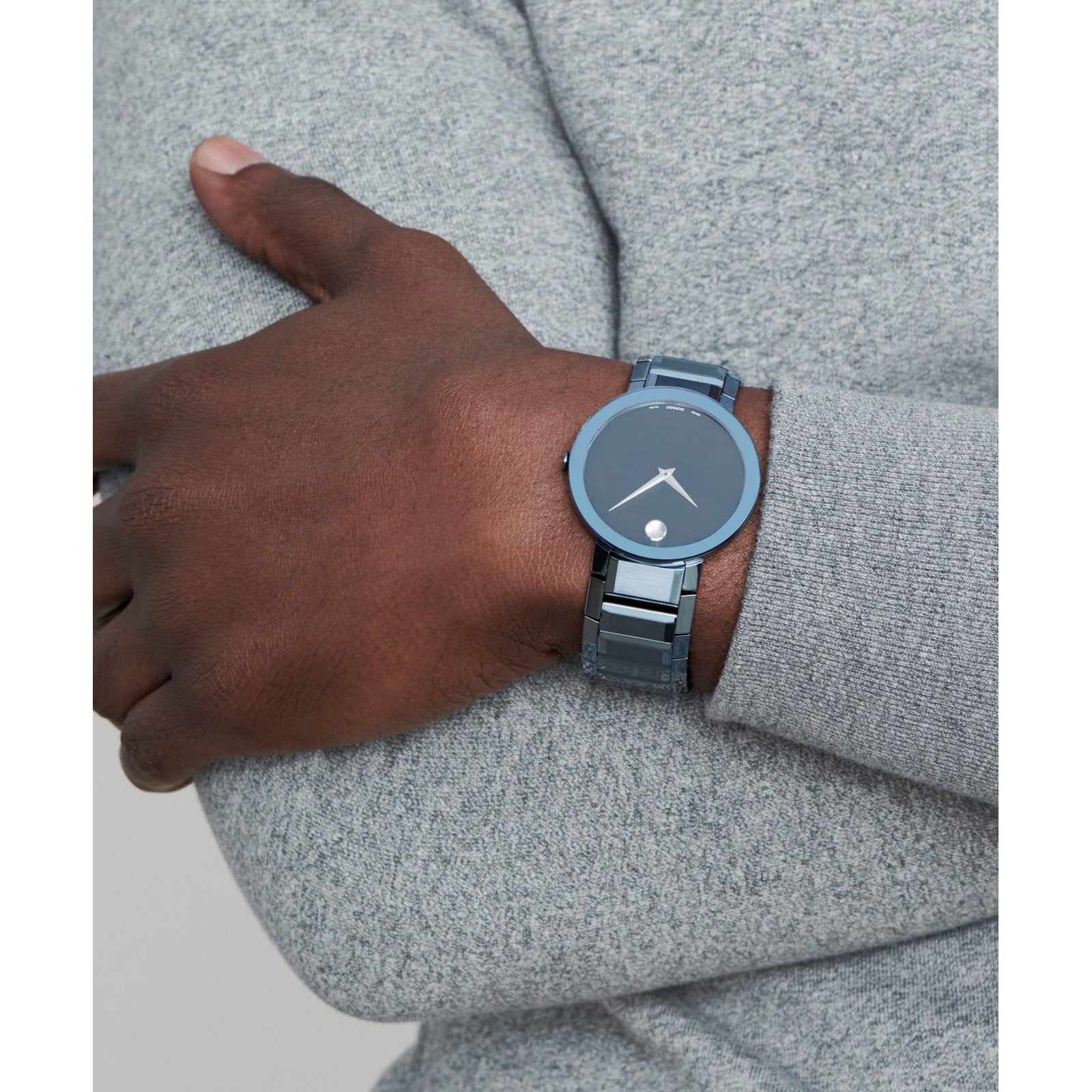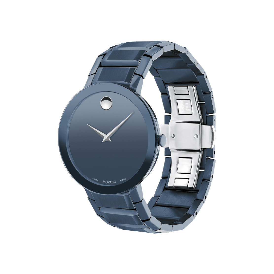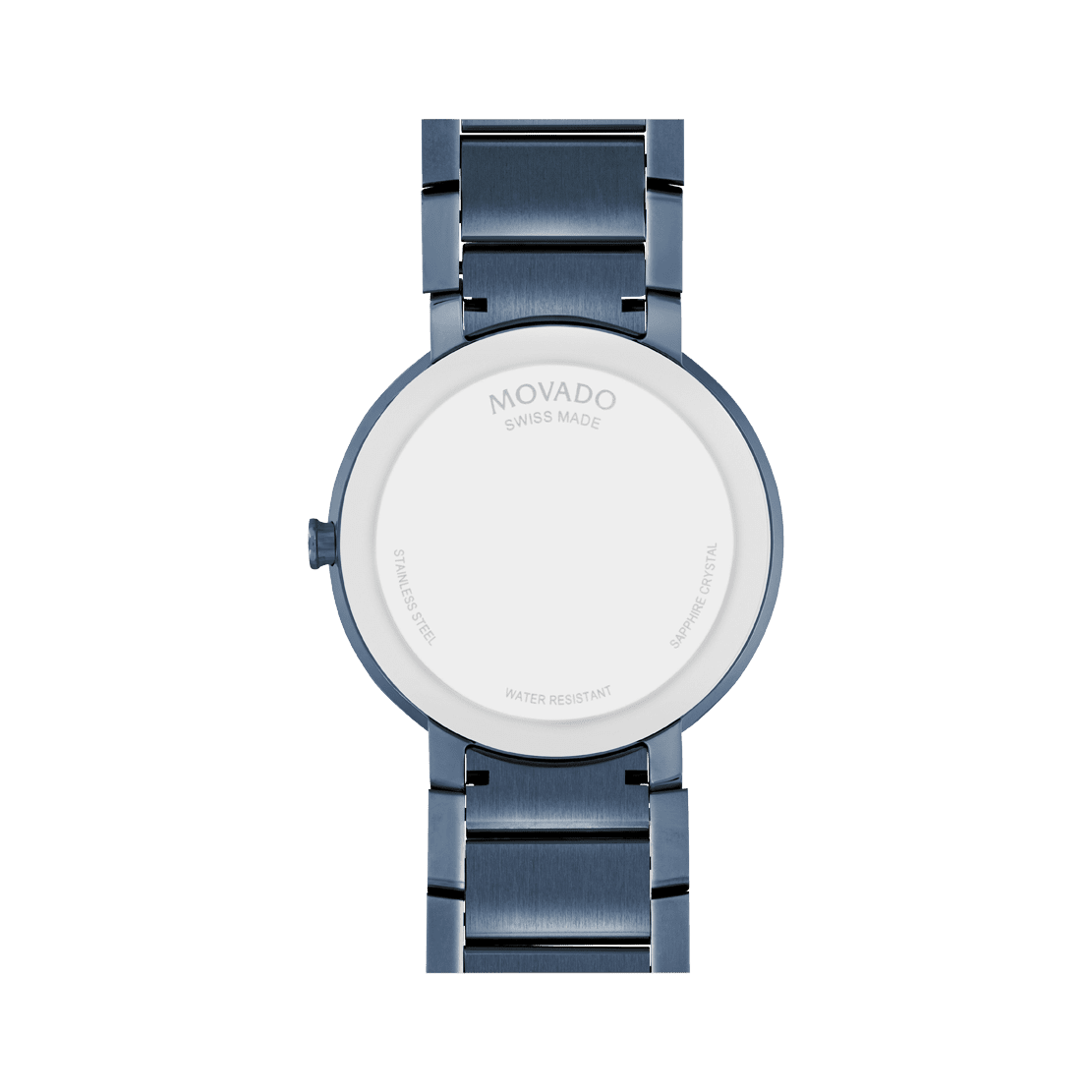 Movado Sapphire, 39 mm blue PVD-finished stainless steel bezel-free case with flat edge-to-edge sapphire crystal. Features a blue PVD-finished bracelet with blue mirror dial.