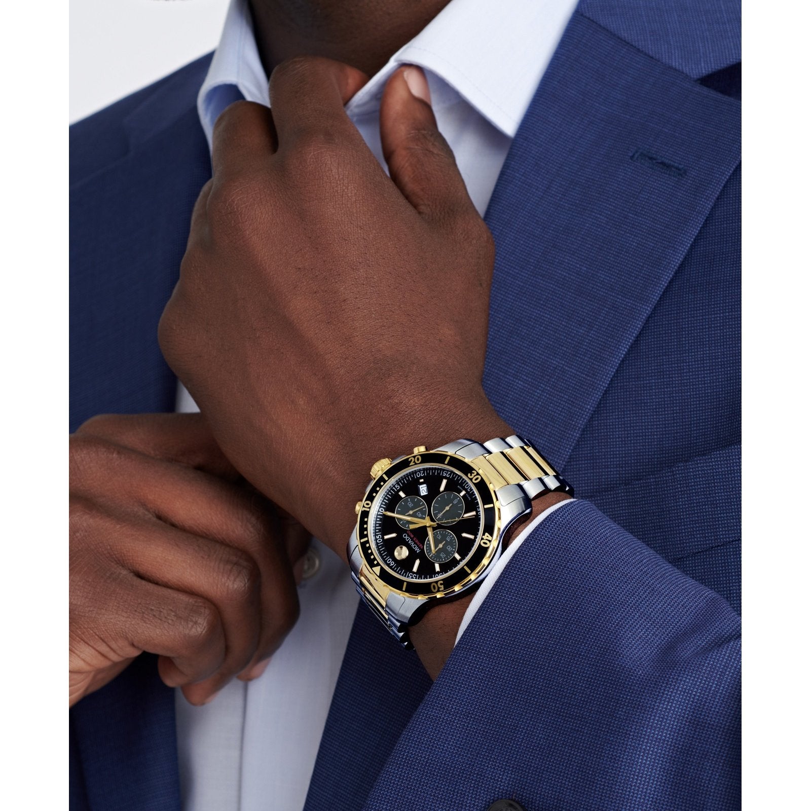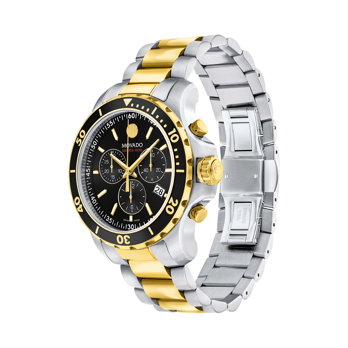 Go to the shopMovado Series 800, 42 mm stainless steel and yellow gold PVD-finished case and bracelet with black chronograph dial.