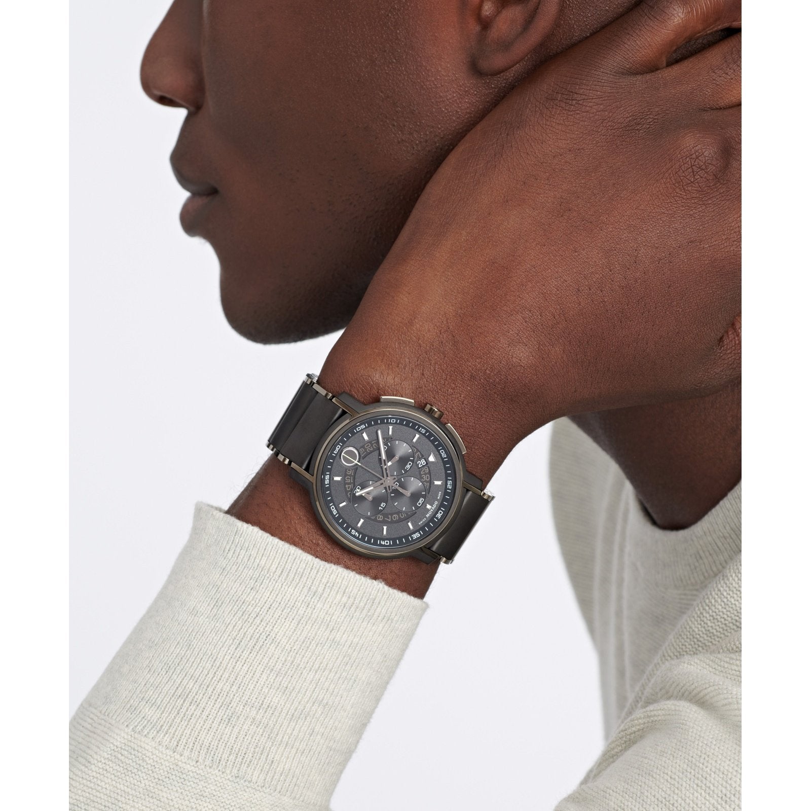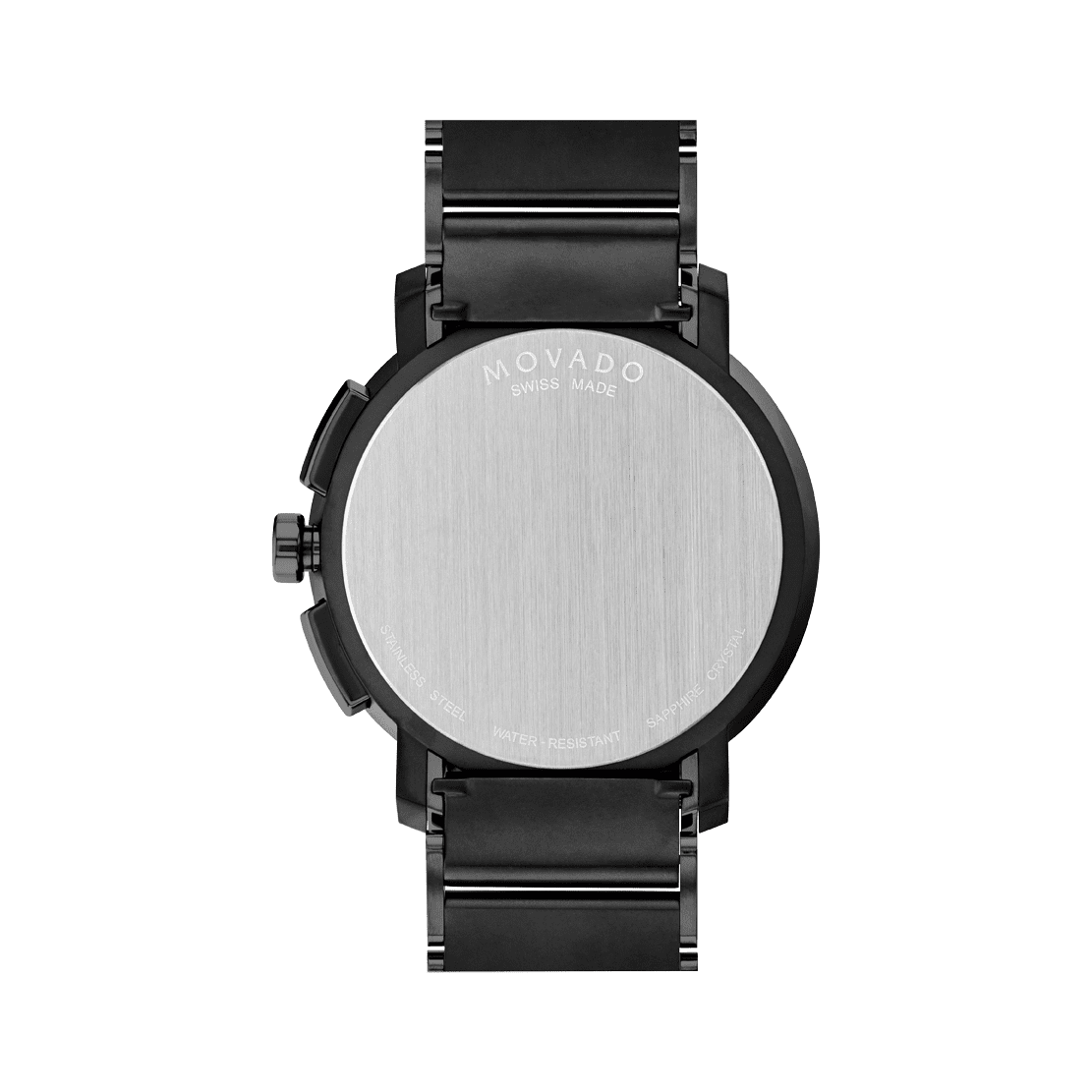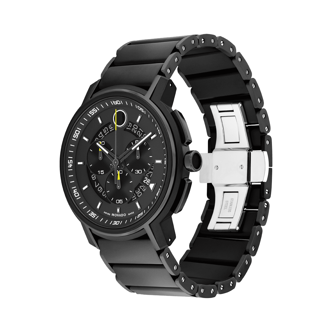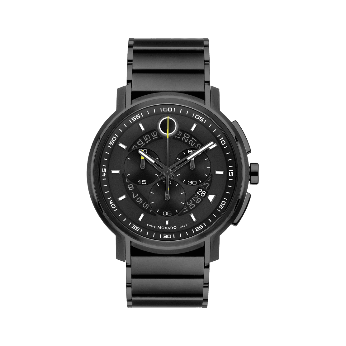 Movado Strato Chronograph, 44mm black & dark gunmetal PVD-finished stainless steel case and bracelet with a matte black chronograph dial and black tinted transparent date ring inlay. Features dot, hands & markers with white Swiss Super-LumiNova®. Special seconds sweep & subeye hands with accented yellow Swiss Super-LumiNova® tips.