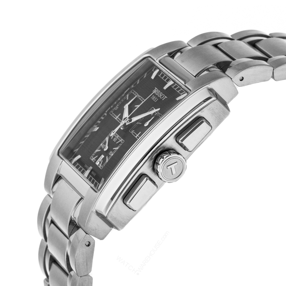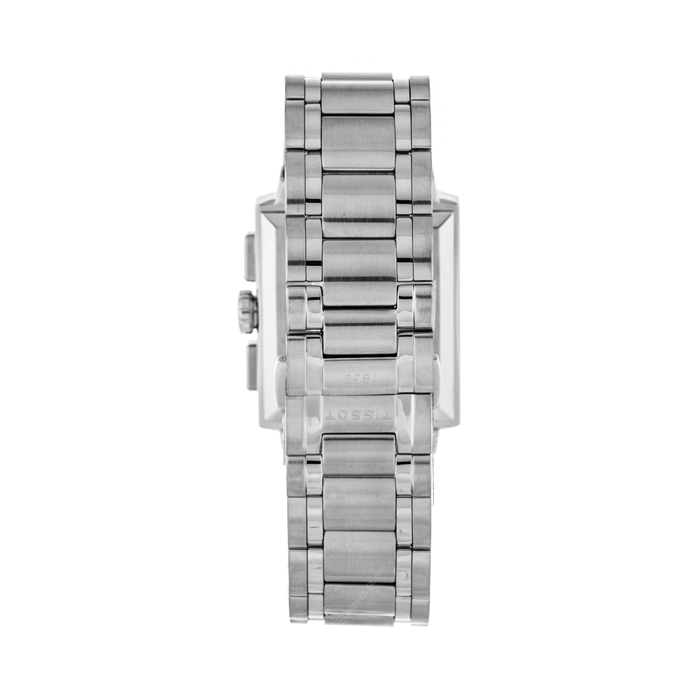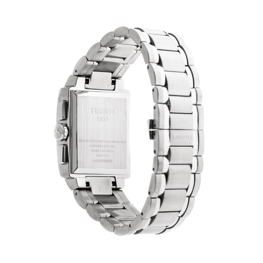 Stainless steel case with a stainless steel bracelet. Fixed stainless steel bezel. Black dial with luminous silver-tone hands and index hour markers. Minute markers around the outer rim. Dial Type: Analog. Luminescent hands and markers. Date display at the 6 o'clock position. Chronograph - three sub-dials displaying: 60 second, 30 minute and 1/10th of a second. ETA caliber G15.211 quartz movement. Scratch resistant sapphire crystal. Solid case back. Case dimensions: 38 mm x 33 mm. Case thickness: 12 mm. Rectangle case shape. Band width: 21 mm. Band length: 8 inches. Fold over clasp. Water resistant at 100 meters / 330 feet. Functions: chronograph, date, hour, minute, second. Casual watch style. Watch label: Swiss Made.