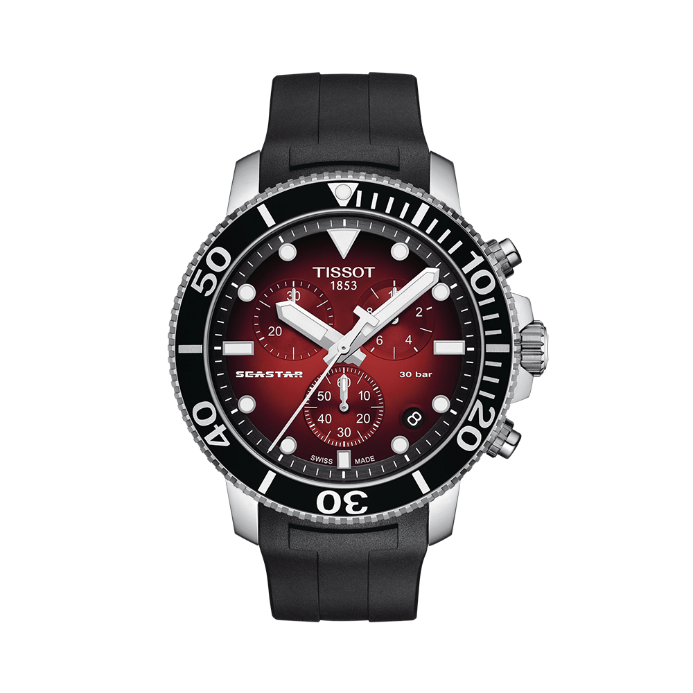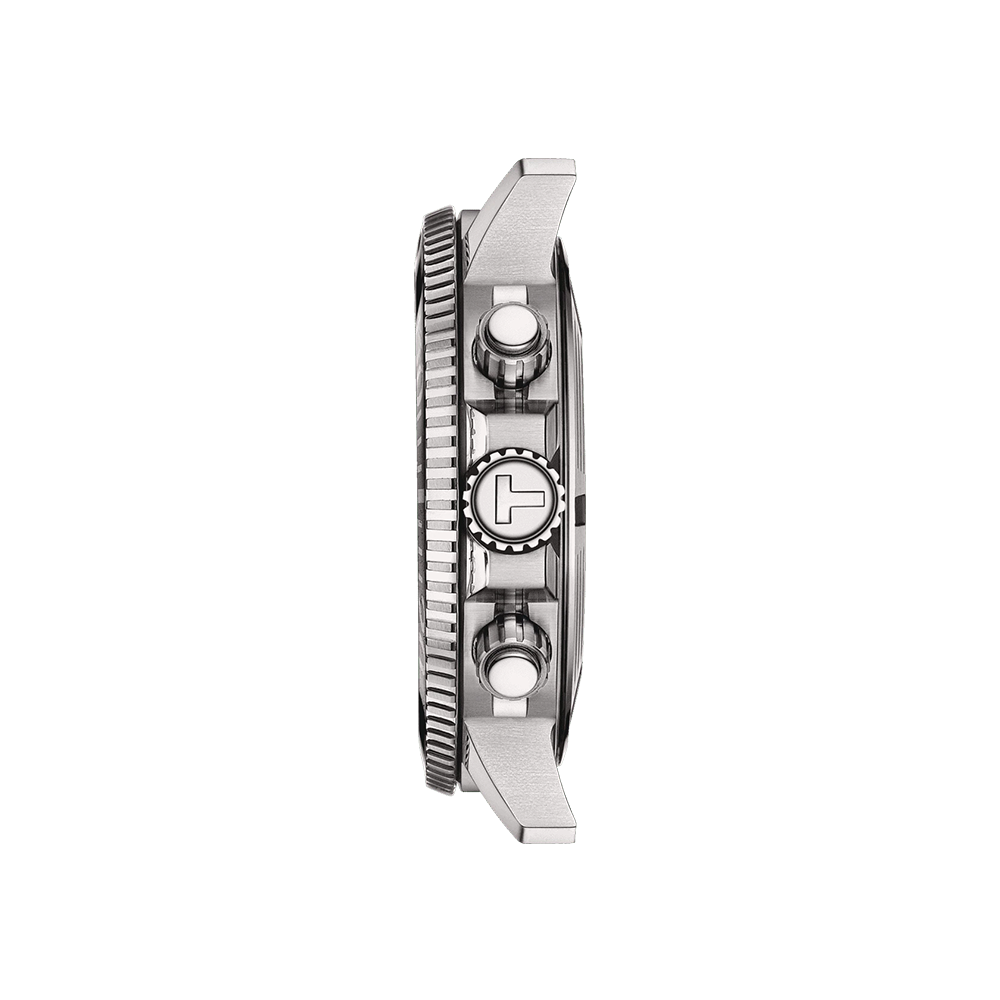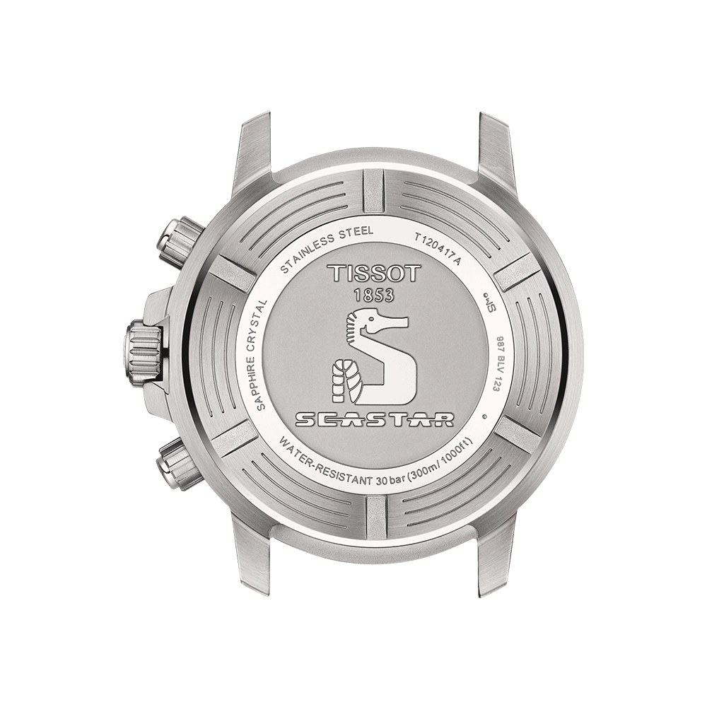 The Tissot Seastar 1000 Chronograph is the instinctive choice for water sports lovers. Its impressive water-resistance up to a pressure of 30 bar (300 m/1000 ft) is combined with the energy of a Swiss-made quartz movement. And features all the element required in a useful instrument: screw-down crown and case...