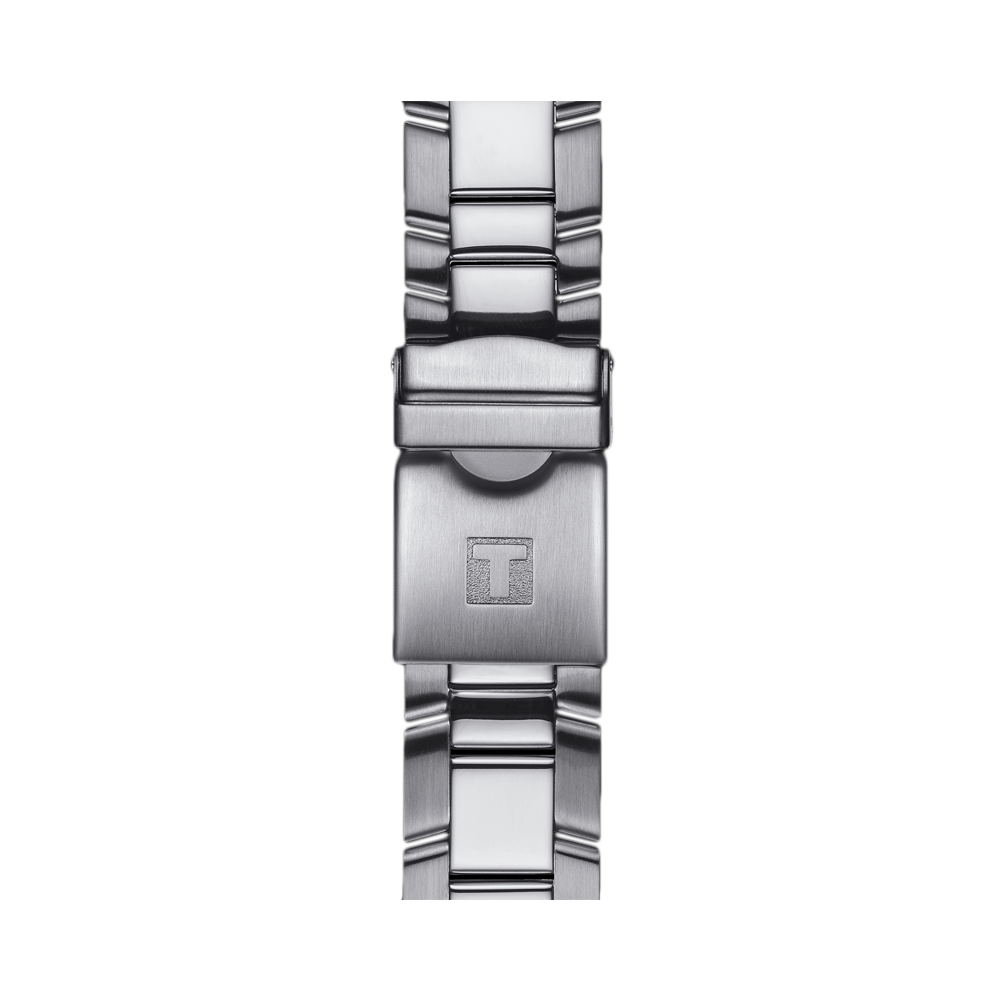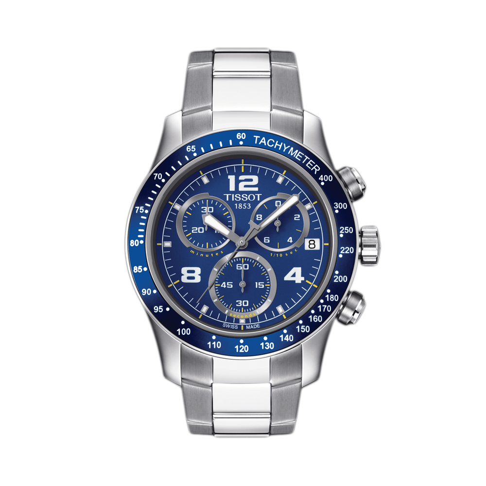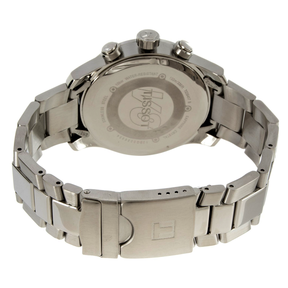 STAINLESS STEEL 42MM ROUND CASE. STAINLESS STEEL BRACELET WITH DEPLOYANT CLASP. FIXED STAINLESS STEEL BLUE BEZEL. BLUE DIAL WITH ARABIC NUMERAL AND INDEX HOUR MARKERS. DATE AT 3 O'CLOCK POSITION. HOURS, MINUTES. CHRONOGRAPH WITH 1/10TH OF A SECOND AT 2 O'CLOCK POSITION AND 30 MINUTE COUNTER AT 10 O'CLOCK POSITION. SUB SECONDS AT 6 O'CLOCK POSITION. SAPPHIRE CRYSTAL. SOLID CASEBACK. SWISS QUARTZ MOVEMENT. WATER RESISTANT TO 100M. TISSOT BOX AND PAPERS AND 2 YEAR WARRANTY. JEWELRY STORE DISPLAY ITEM.