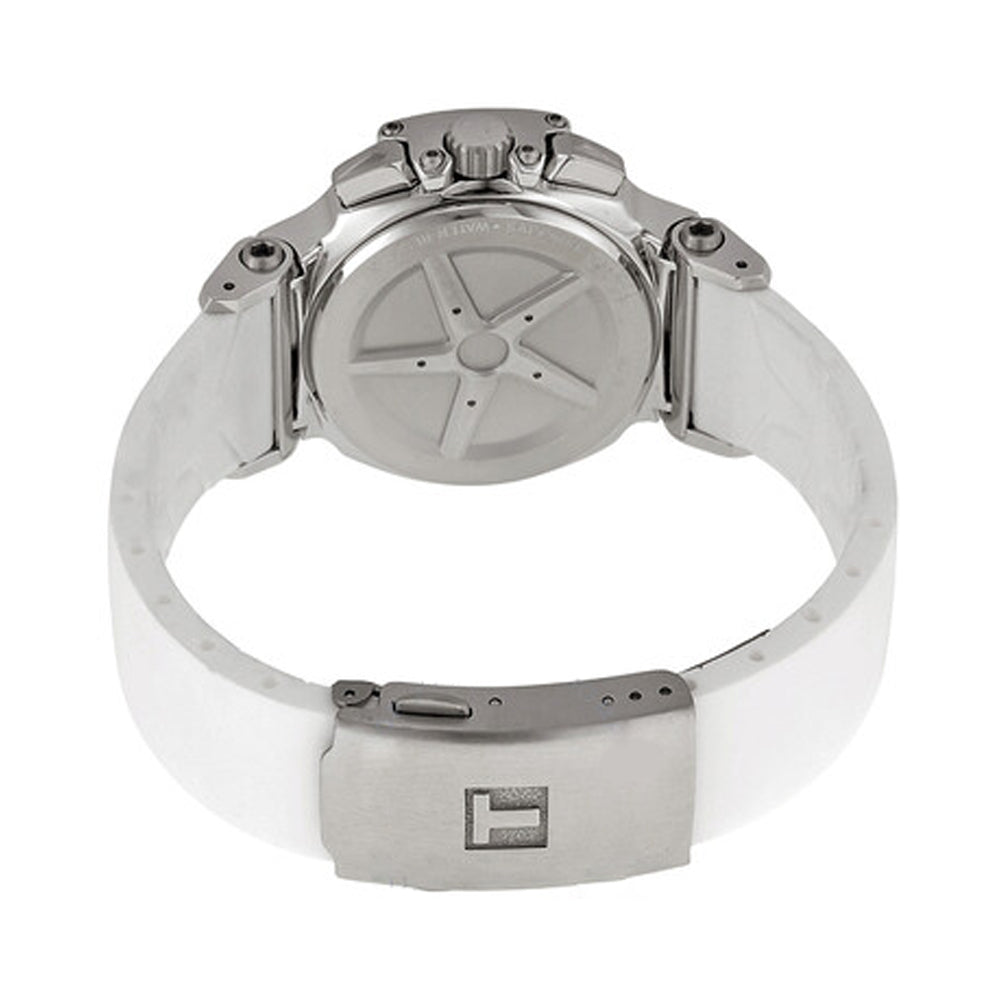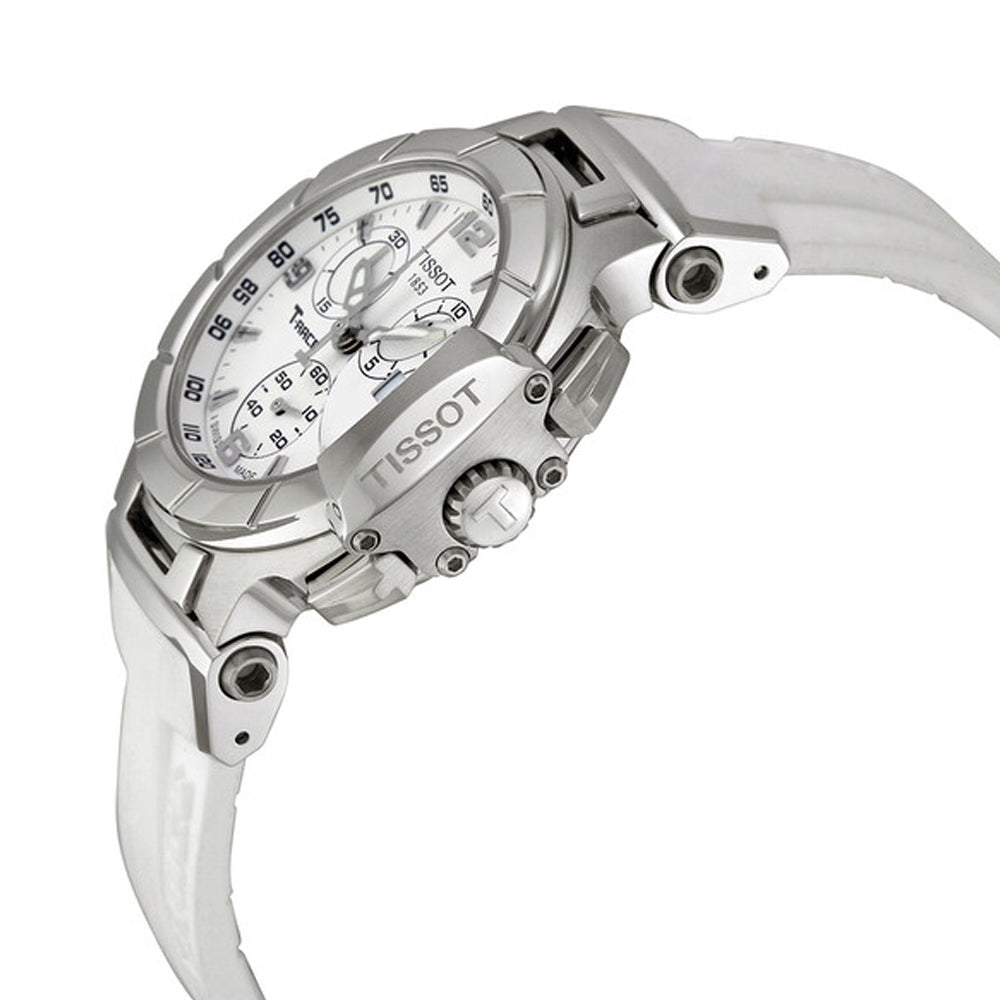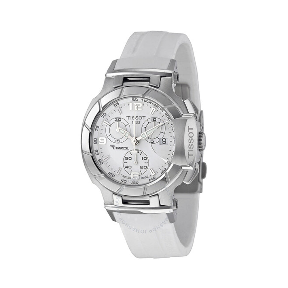 Stainless steel case with a white rubber strap. Fixed stainless steel bezel with a silver-tone top ring. White dial with luminous hands and index hour markers. Arabic numerals mark the 6, 9 and 12 o'clock positions. Minute markers. tachymeter around the outer rim. Dial Type: Analog. Luminescent hands and markers. Date display at the 3 o'clock position. Chronograph - three sub-dials displaying: 60 seconds, 30 minutes and 1/10th of a second. ETA Caliber G15.211 quartz movement. Scratch resistant sapphire crystal. Screw down crown. Solid case back. Case size: 36.65 mm. Case thickness: 12 mm. Round case shape. Band width: 22 mm. Deployment clasp. Water resistant at 100 meters / 330 feet. Functions: chronograph, date, hour, minute, second. Casual watch style. Watch label: Swiss Made. Item Variations: T048 217 17 017 00, T048-217-17-017-00, T048/217/17/017/00, T0482171701700. Tissot T-Race Chronograph White Dial Ladies Watch T0482171701700.