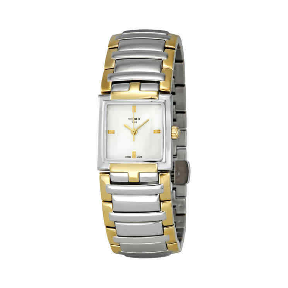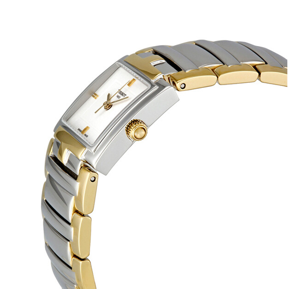 Stainless steel case with a two-tone (silver and yellow gold-tone) stainless steel bracelet. Fixed stainless steel bezel. White dial with yellow gold-tone hands. Index markers at the 3, 6, 9 and 12 o'clock positions. The Tissot name appears below the 12 o'clock position. Dial Type: Analog. ETA caliber F03.111 quartz...