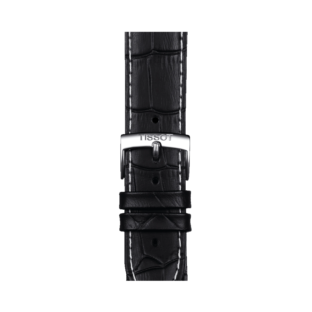 Stainless steel case with a black leather strap. Fixed silver-tone stainless steel bezel. Black dial with luminous silver-tone hands and index hour markers. Minute markers around the outer rim. Dial Type: Analog. Luminescent hands and markers. Date display between the 4 and 5 o'clock positions. Chronograph - three sub-dials displaying: 60 second, 30 minute and 1/10th of a second. ETA caliber G10.211 quartz movement. Scratch resistant sapphire crystal. Pull / push crown. Solid case back. Round case shape. Case size: 41 mm. Case thickness: 10.7 mm. Band width: 20 mm. Band length: 7.75 inches. Tang clasp. Water resistant at 100 meters / 330 feet. Functions: chronograph, date, hour, minute, second. Casual watch style. Watch label: Swiss Made.