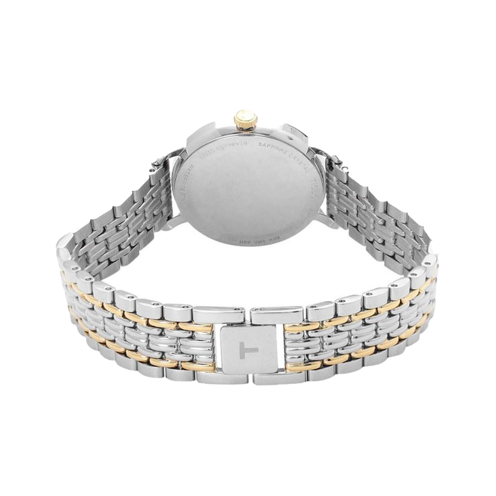 Enrich your watch collection with this women's watch from the T-Classic collection by Tissot. Protected by a sapphire glass, the round dial is housed in a 30 mm case. It vaunts plain three hands and a crown for time adjustment. The stainless steel strap showcases a hue that uplifts the look of the watch. Moreover, it is fitted with a jewellery clasp to ensure a secure fit on the wrist.