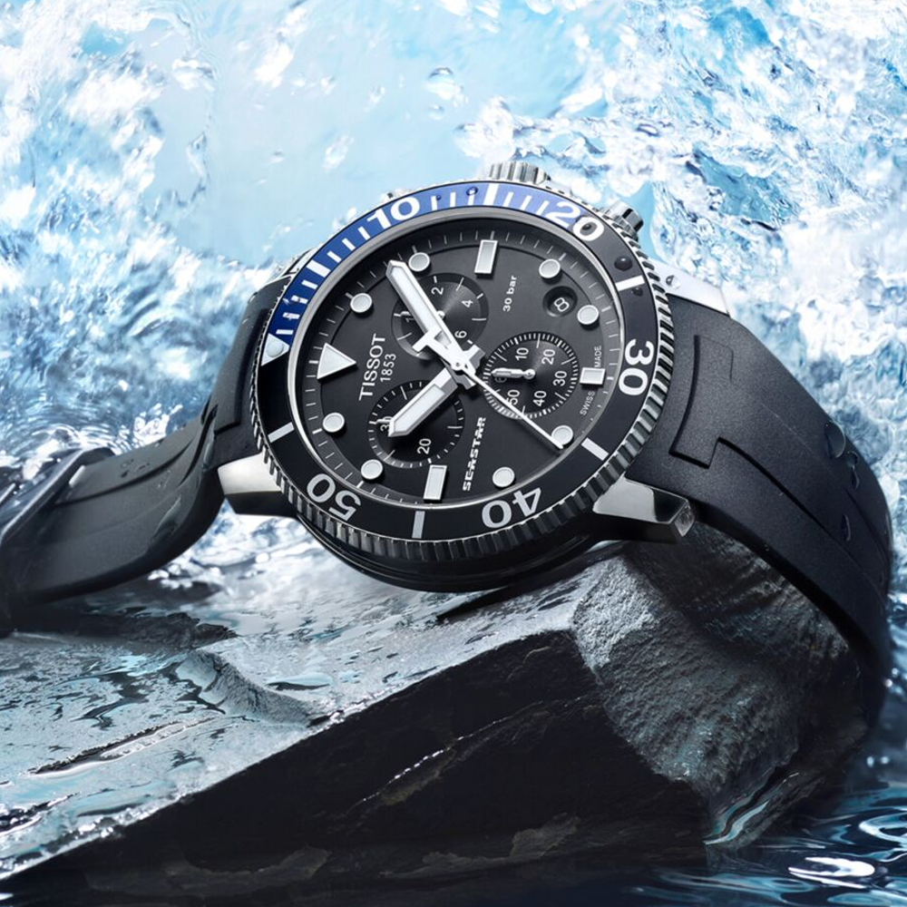 This collection has been created for real water sports lovers. The Tissot Seastar 1000 is the ultimate watersport watch, with its high water-resistance up to a pressure of 30 bar (300 m/1000 ft), screw-down crown and caseback as well as its unidirectional ceramic bezel.