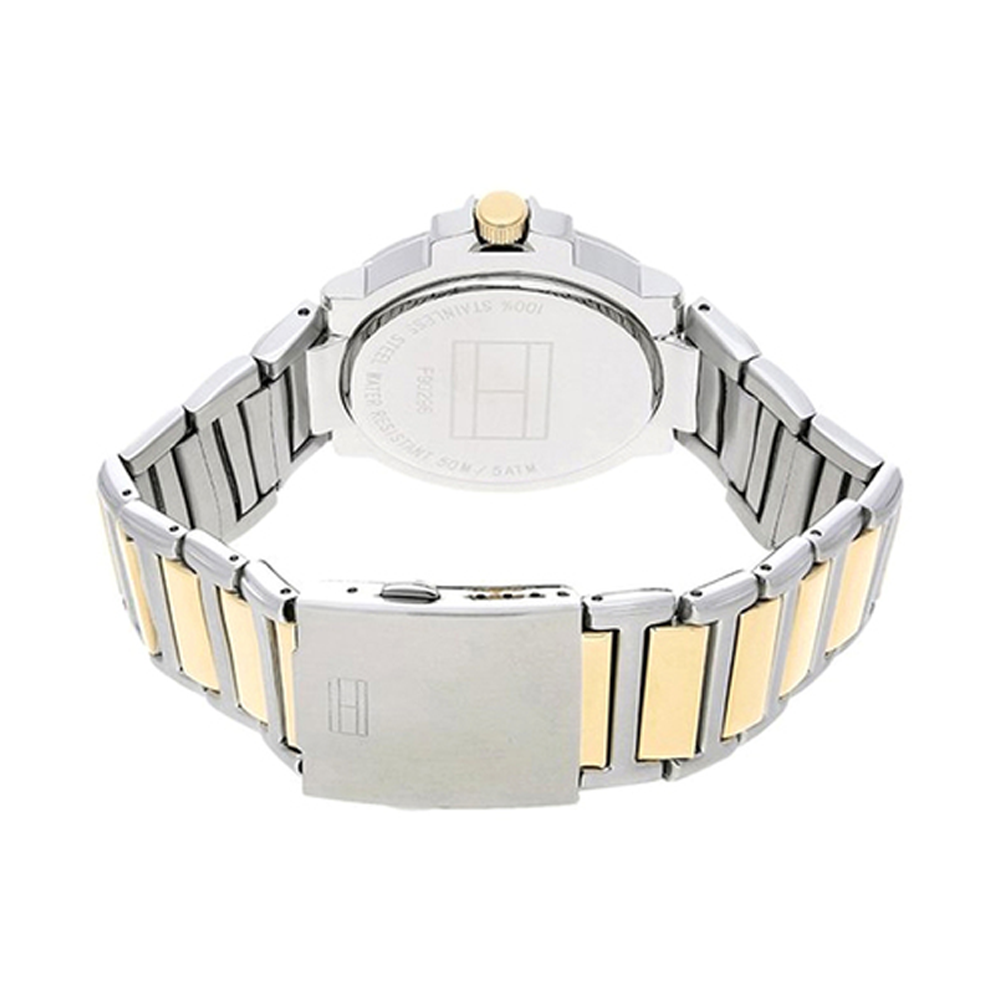 Combining simplicity and performance, this men's analog watch from Tommy Hilfiger's Sport collection is sure to impress you. Protected by a mineral glass, the silver round dial features plain three hands operating on a quartz movement, a date display window, Arabic numerals, small slant lines at 5-minute intervals and a screw type crown for time adjustment. The silver and golden stainless steel strap with a push-button clasp provide a proper fit on the wrist. Club this water-resistant timekeeper with a white shirt to look dapper.