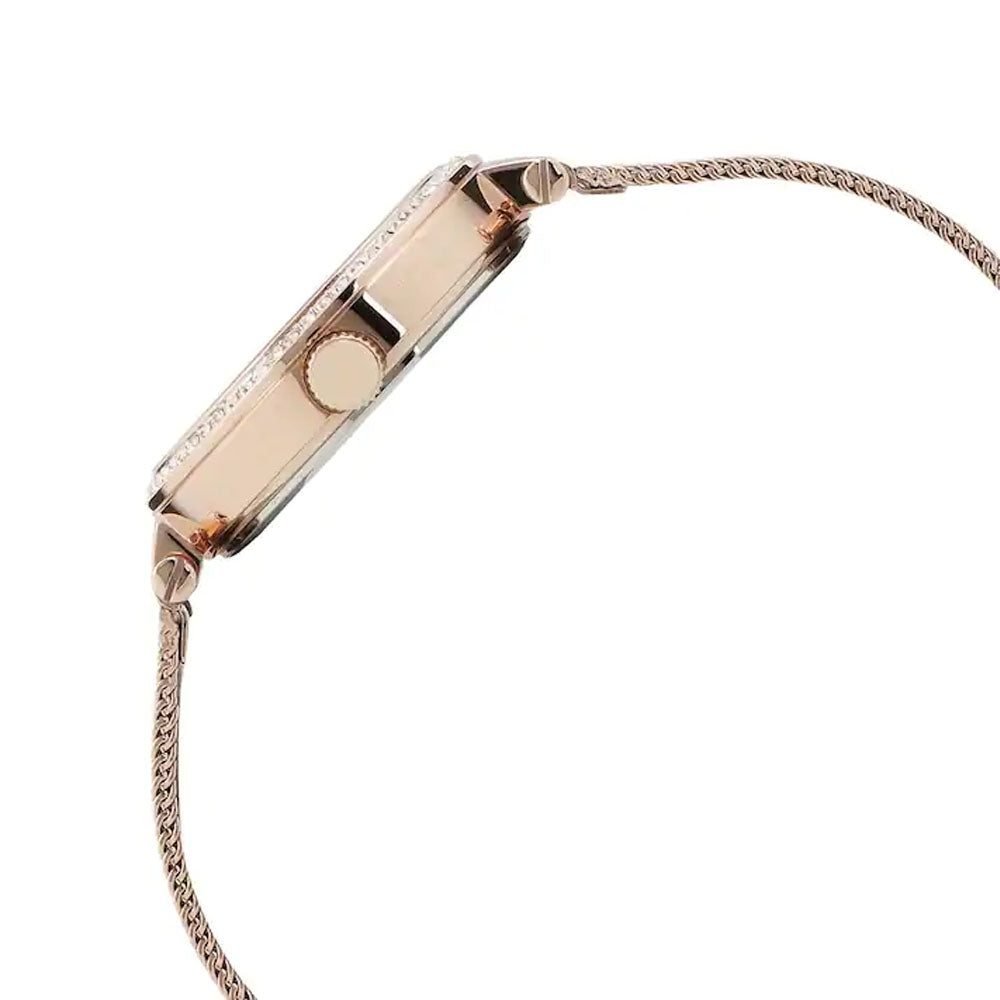 A timepiece that resinstates royal tastes in a distinctly new form. This rose gold coloured watch has a matching dial that has a subtle, yet delightful design surrounded by glinting stone embellishments for hour markers. The shimmering case has studded stones, giving it a tiara like appearance. The fine milanese...