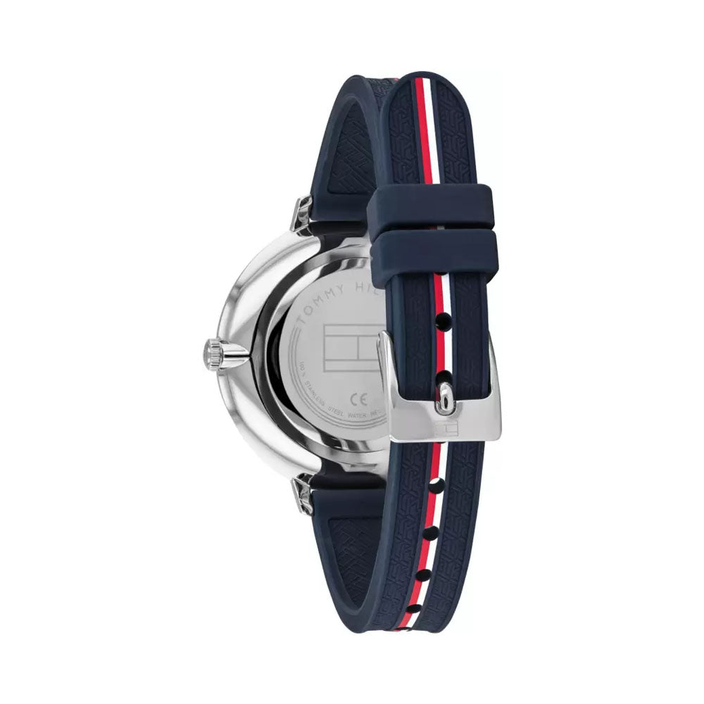 Accessorize your wrist with this women's analog watch from the Alexa collection by Tommy Hilfiger and make a style statement. Operated by a quartz movement, the navy round dial is encased in a 38 mm case. It features plain two hands and a crown for time adjustment. The silicon strap...